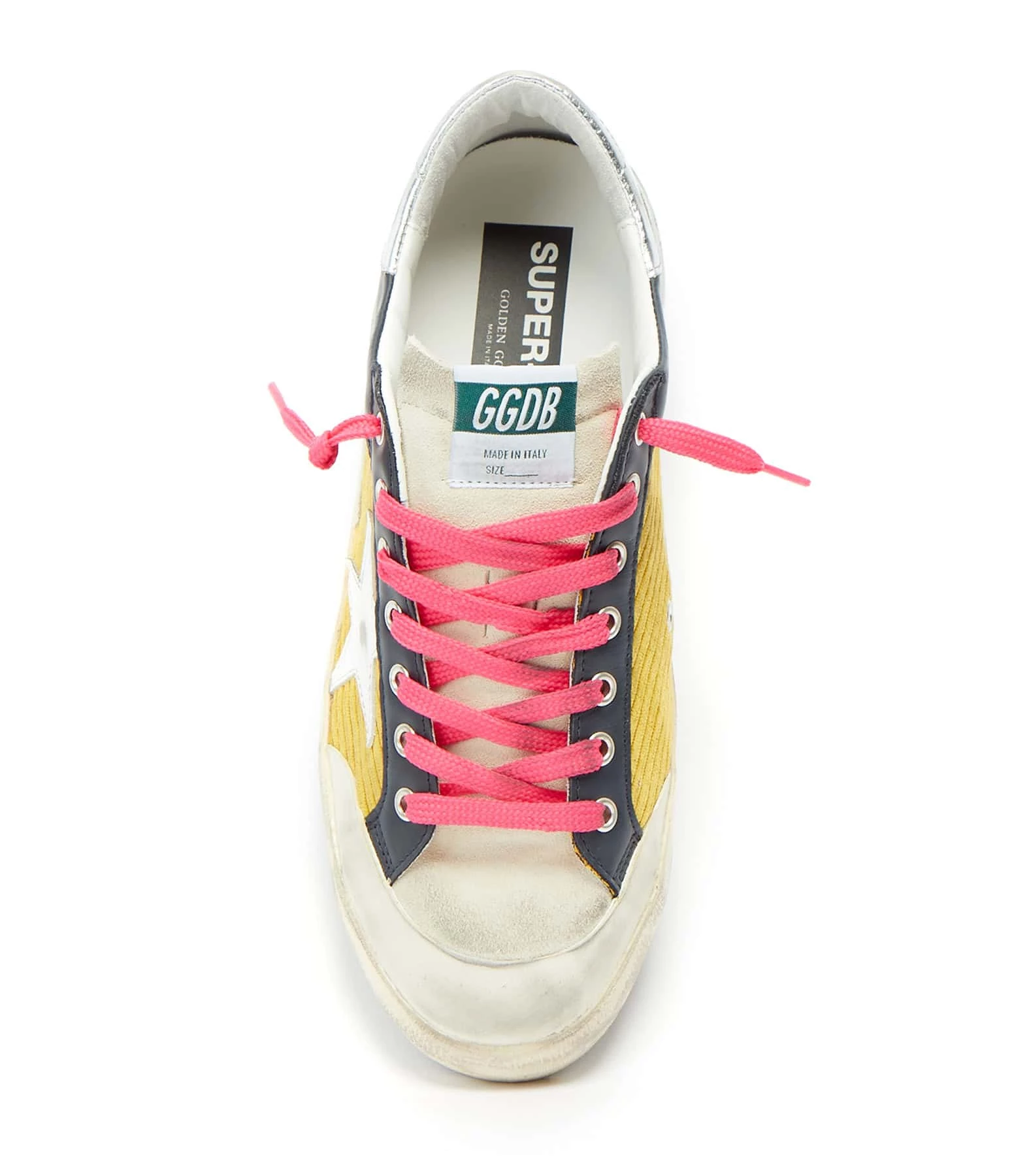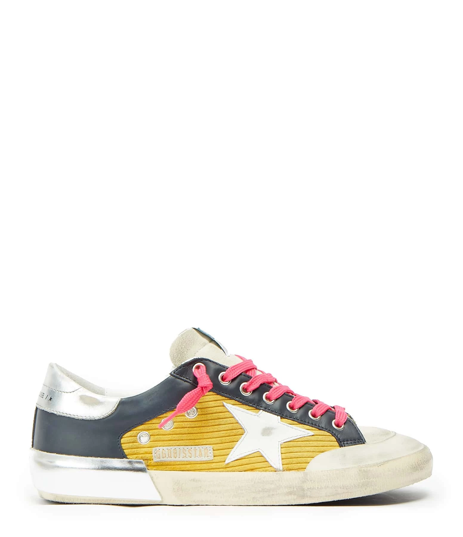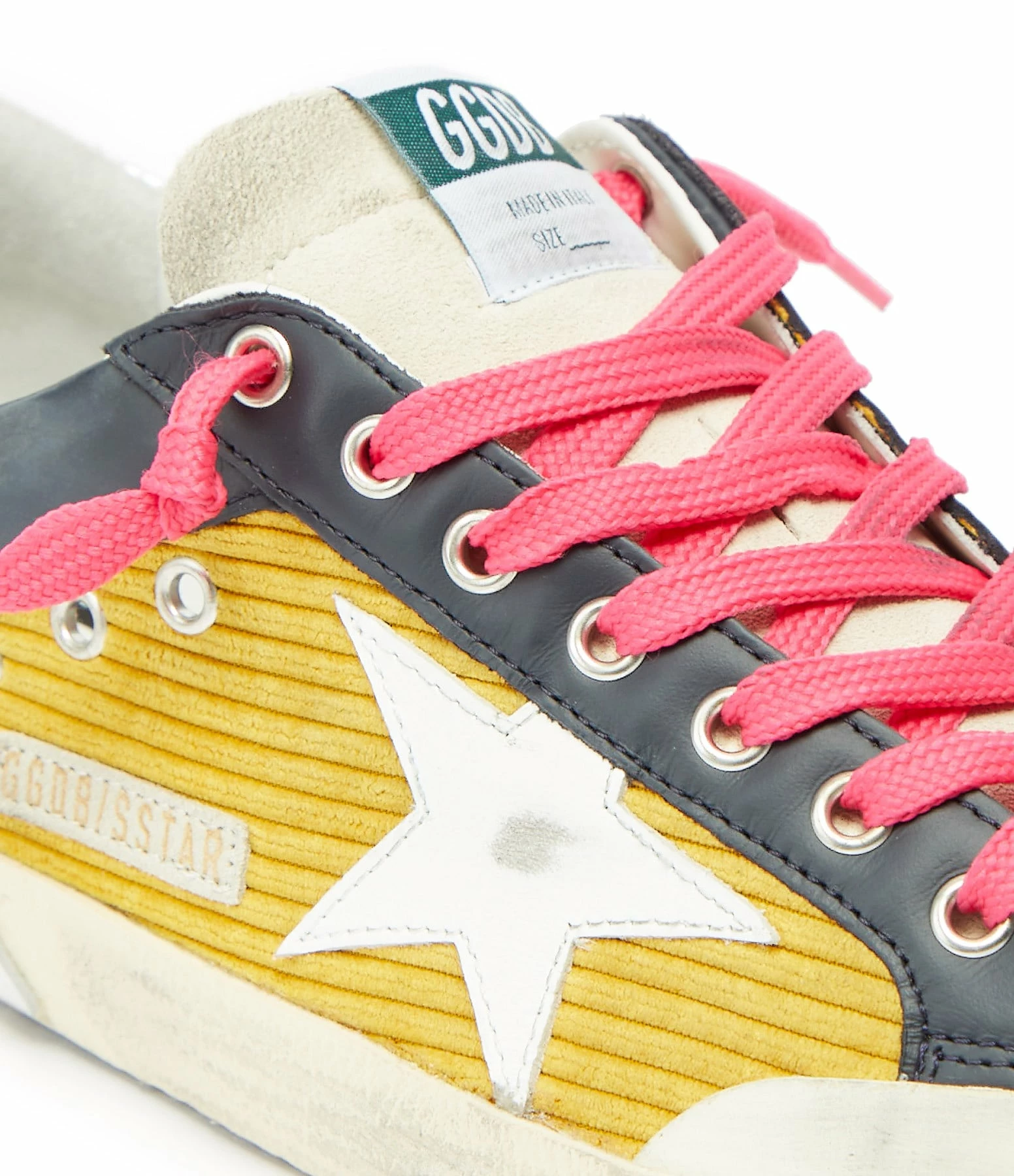 Baskets basses pour homme en velours côtelé jaune et cuir lisse noir. Lacets roses. Empiècement étoile en cuir lisse blanc et renfort talon argenté. Inscription “GGDB/SSTAR” sur le côté extérieur. Intérieur en maille bouclette et cuir.