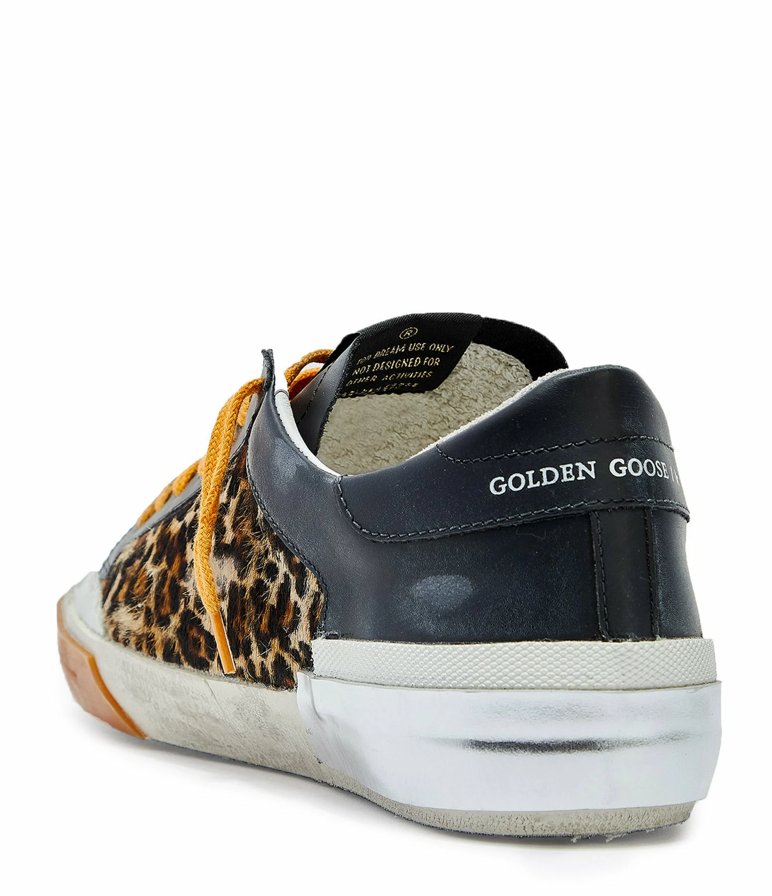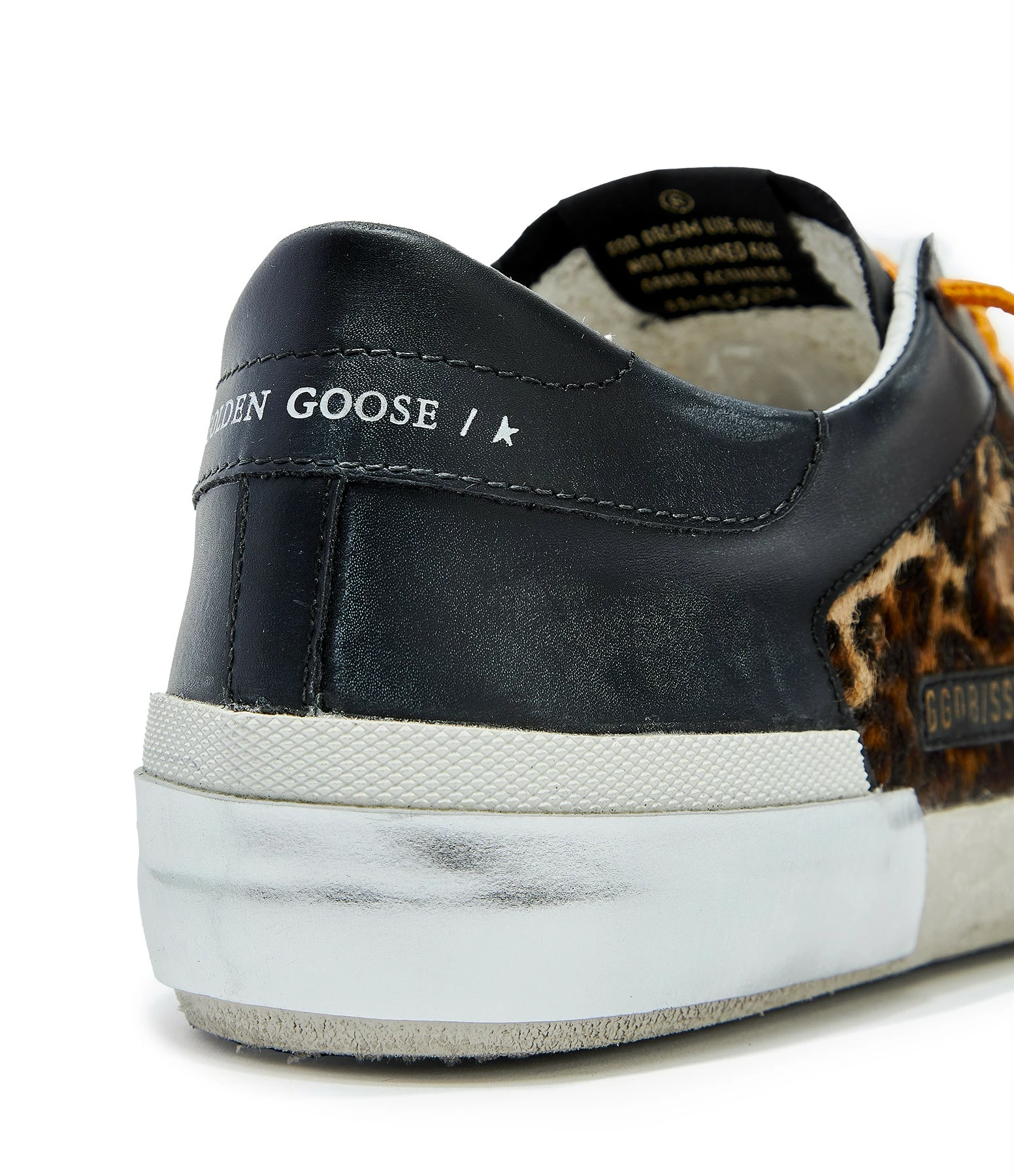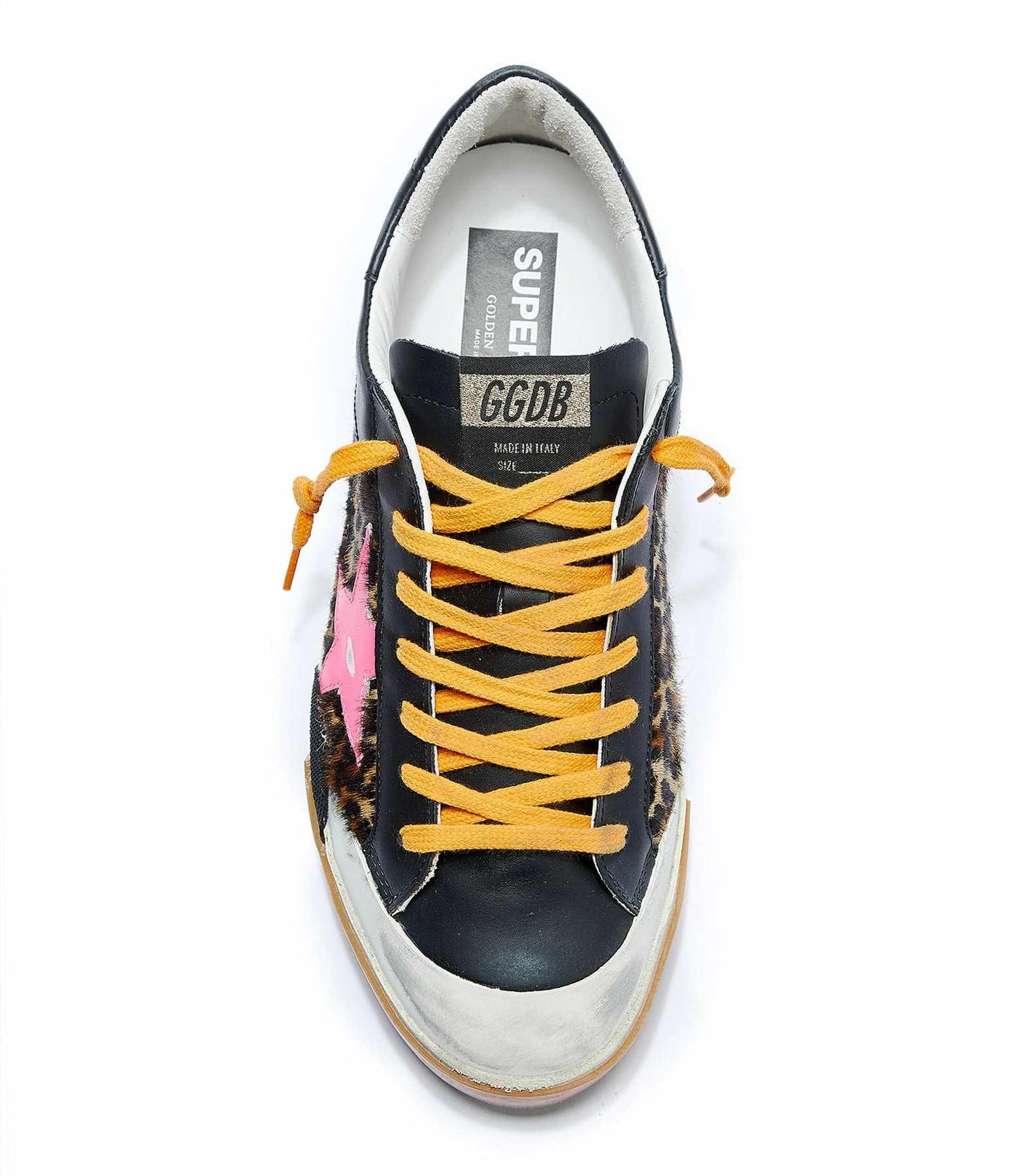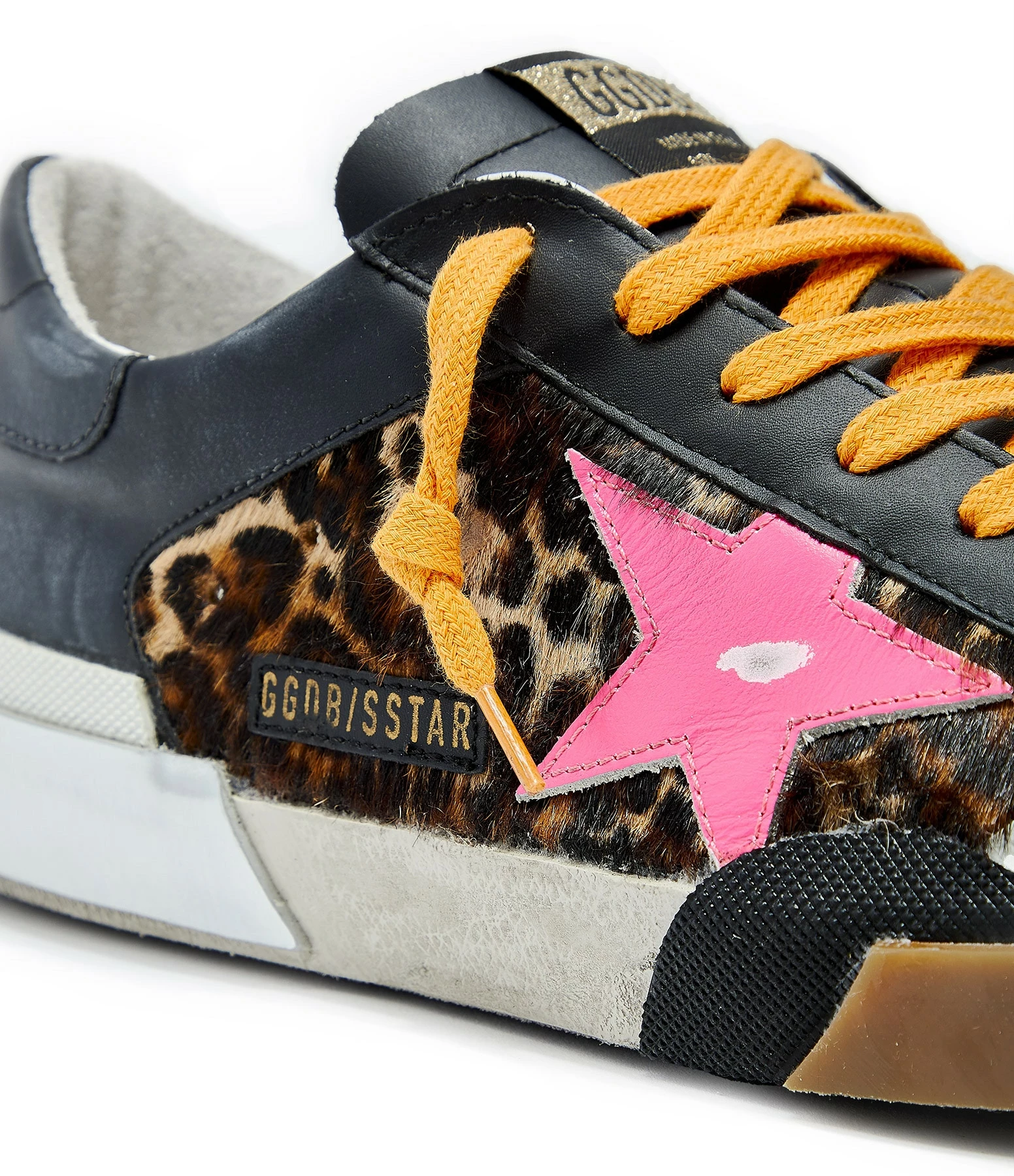 Baskets basses en cuir lisse noir et imprimé léopard en cuir façon poulain. Empiècement étoile en cuir rose fluo et renfort talon en cuir noir. Intérieur en maille bouclette et cuir.