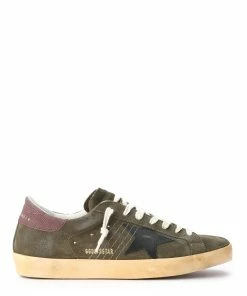 Baskets basses en cuir suédé kaki. Empiècement étoile en cuir lisse noir. Renfort talon en cuir effet croco violet. Lacets écrus. Intérieur en maille bouclette et cuir. Inscription “GGDB/SSTAR” sur le côté extérieur.