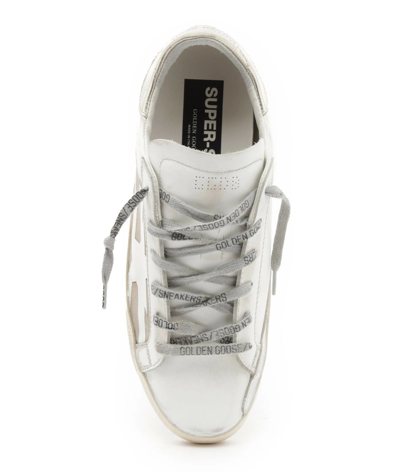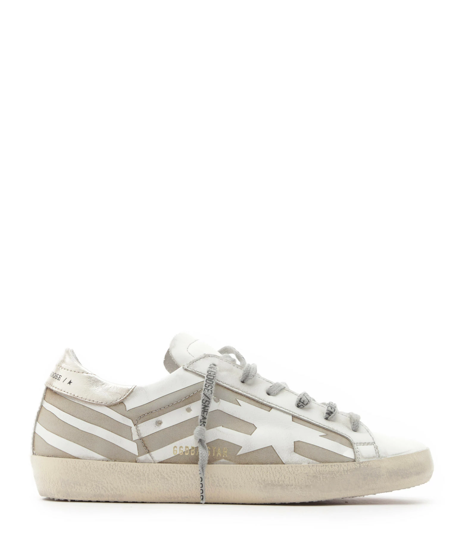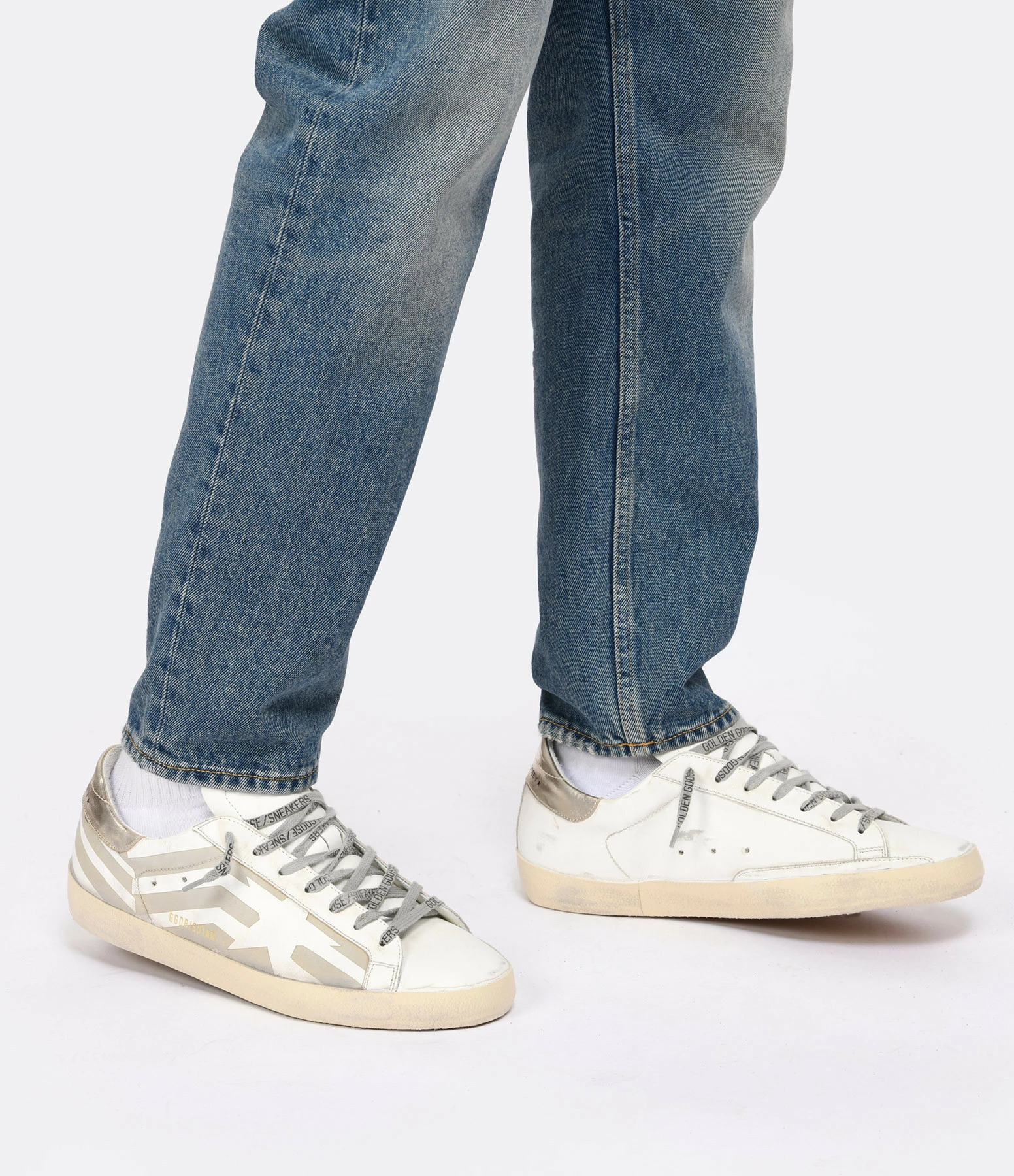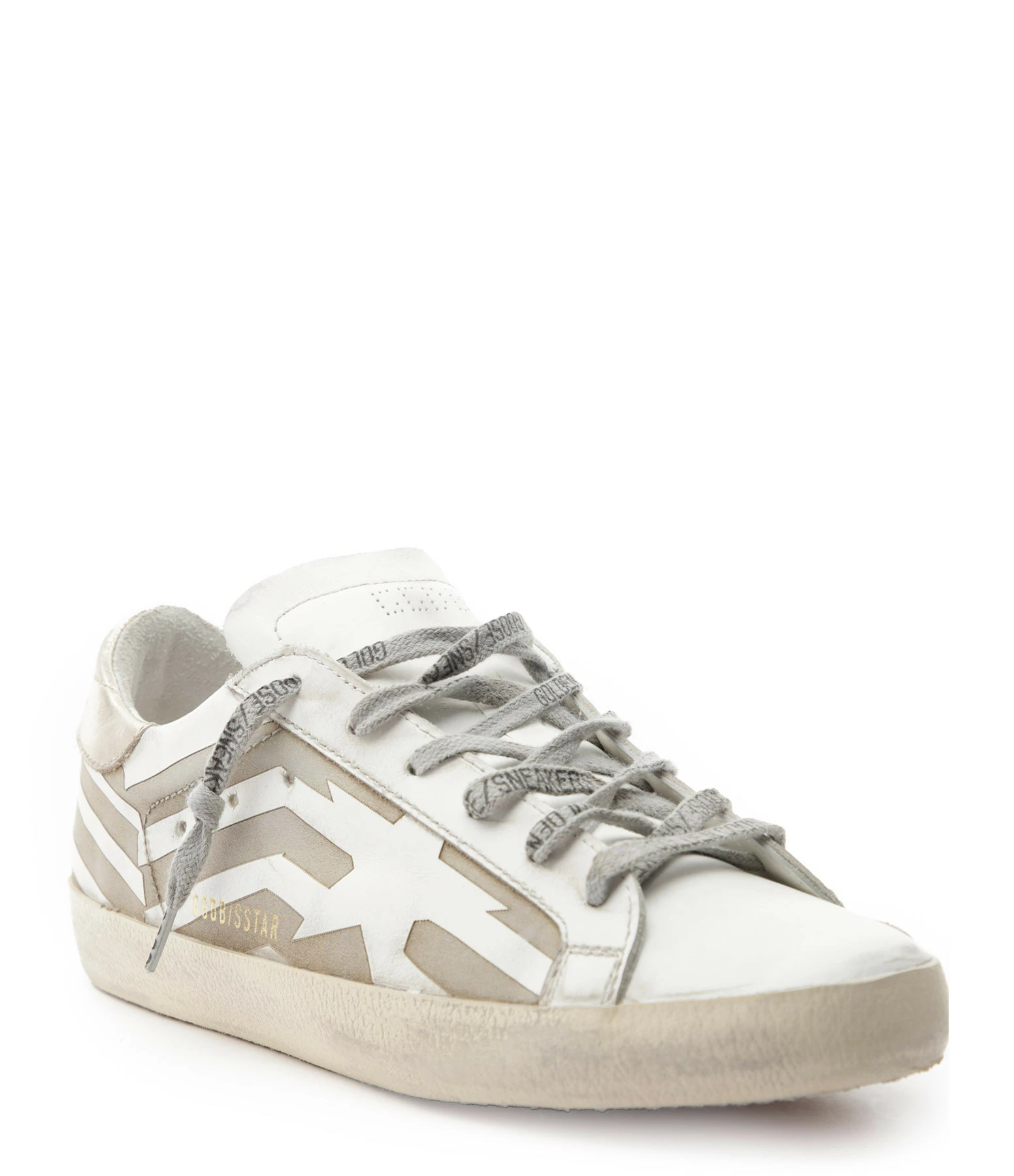 Baskets basses asymétriques en cuir lisse, une blanche à rayures grises, l’autre blanche avec l’étoile grise. Renfort talon en cuir lisse doré. Intérieur en maille bouclette et cuir.