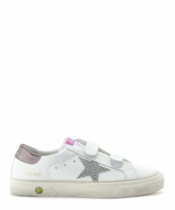 Baskets à scratch en cuir lisse blanc. Empiècement étoile à paillettes argentées. Renfort talon argenté à reflets holographiques. Inscription “GGDB/MAY” sur le côté extérieur. Intérieur en maille bouclette et cuir.