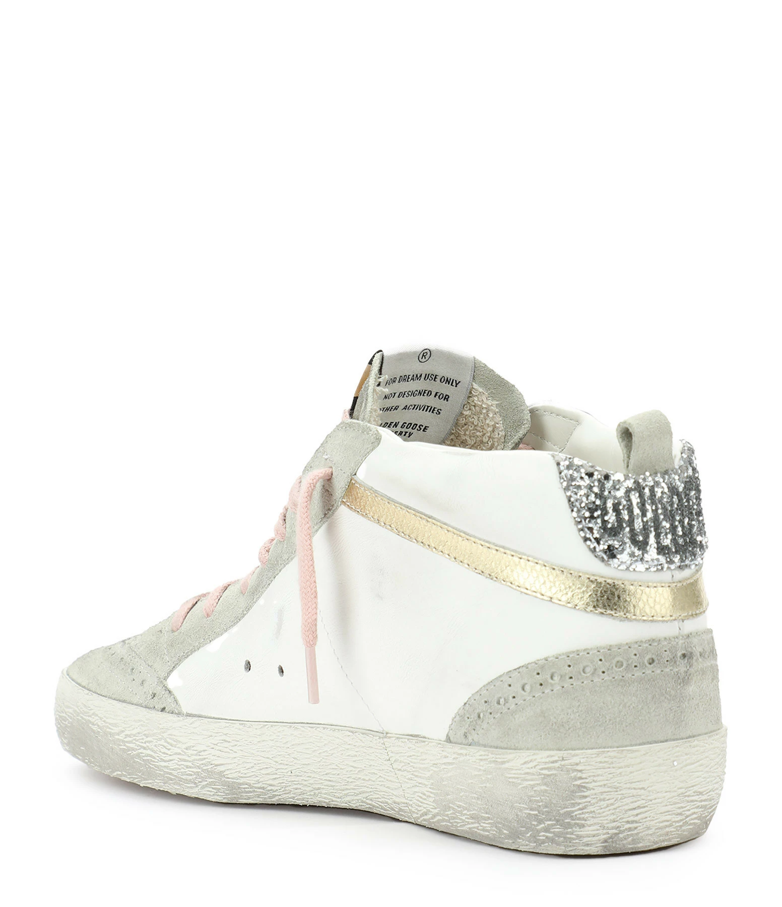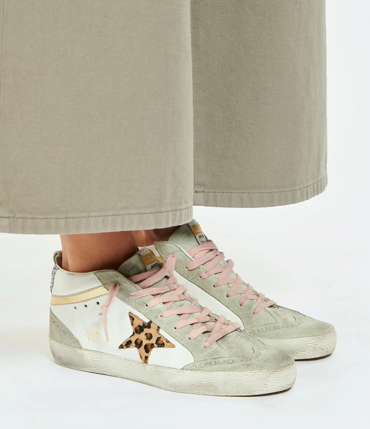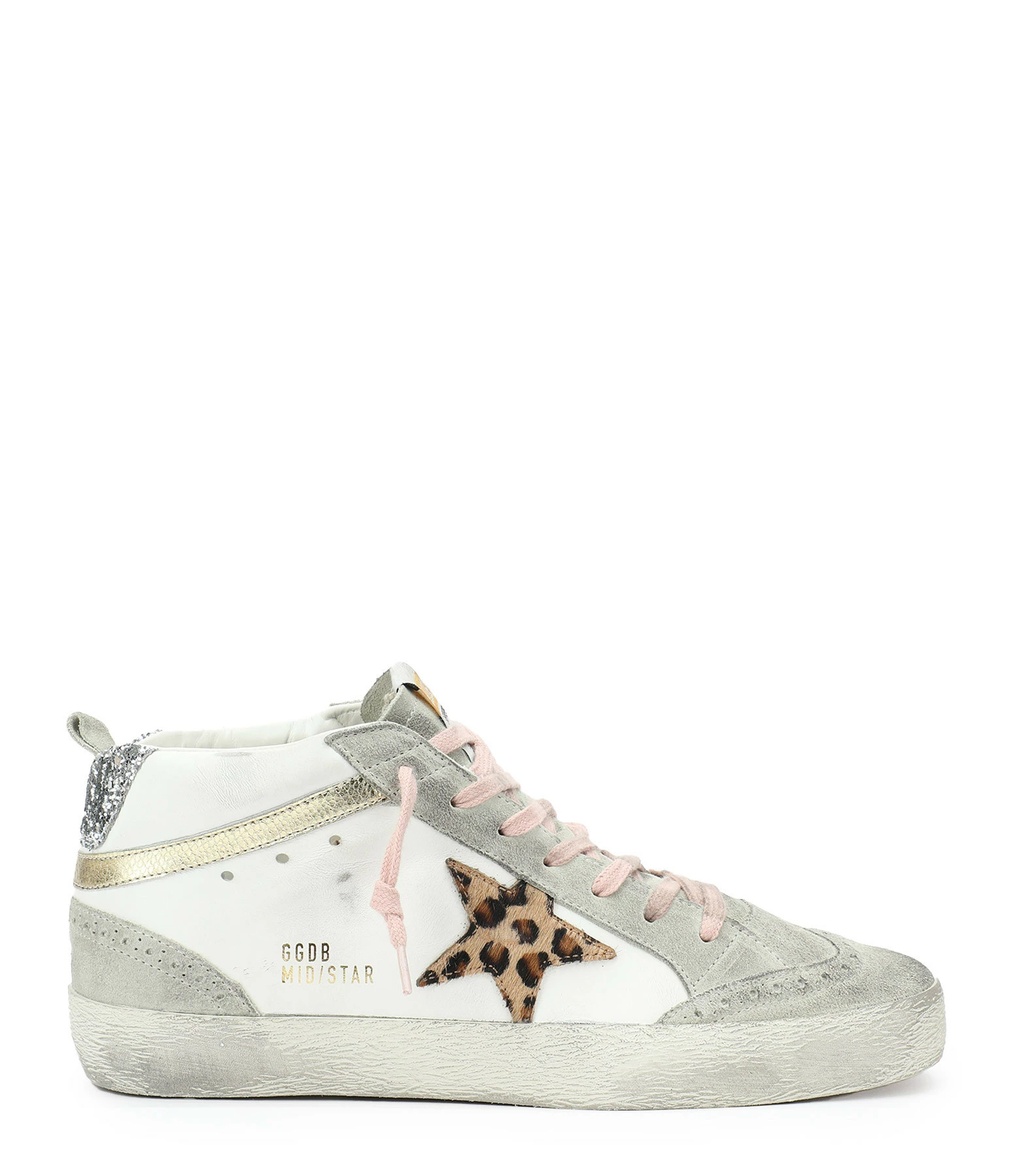 Baskets montantes en cuir lisse blanc. Empiècement étoile horsy léopard. Liseré en cuir lisse doré. Renfort talon en cuir lisse blanc. Lacets roses. Inscription “GGDB MID/STAR”. Intérieur fourré en maille bouclette.