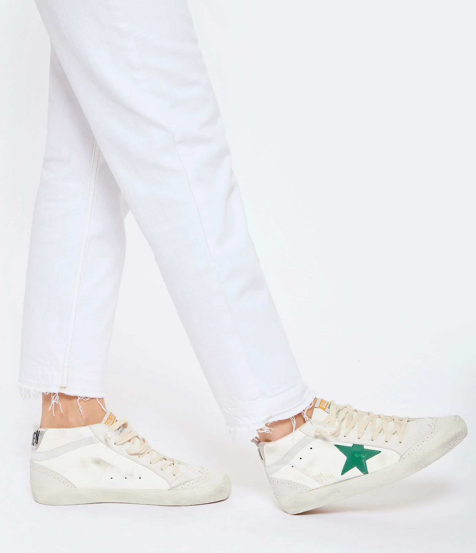 Baskets montantes en cuir lisse blanc. Empiècement étoile en cuir lisse vert. Liseré en cuir suede gris. Renfort talon en cuir lisse gris. Lacets écrus à motif. Inscription “GGDB MID/STAR”. Intérieur fourré en maille bouclette.