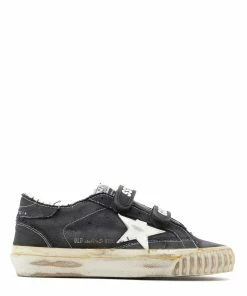Baskets basses en toile de coton noir. Empiècement étoile en cuir blanc. Fermeture par scratch avec inscription blanche “SSTAR GGDB”. Coutures contrastantes.