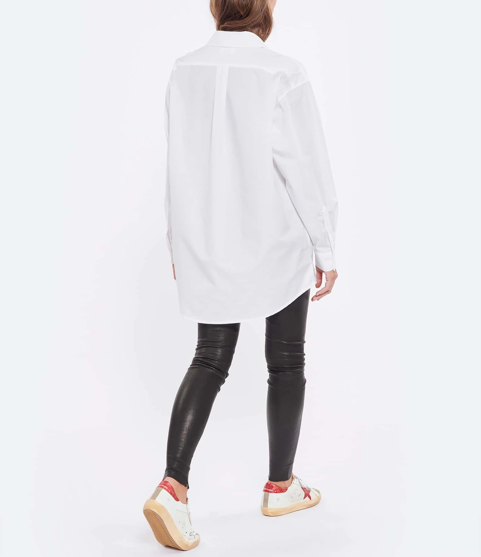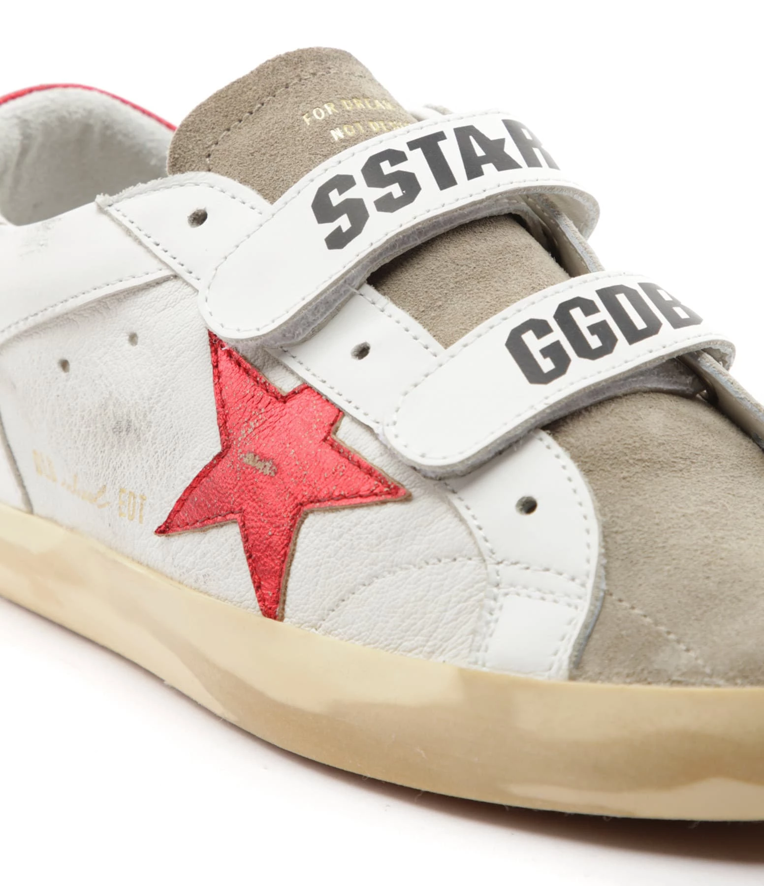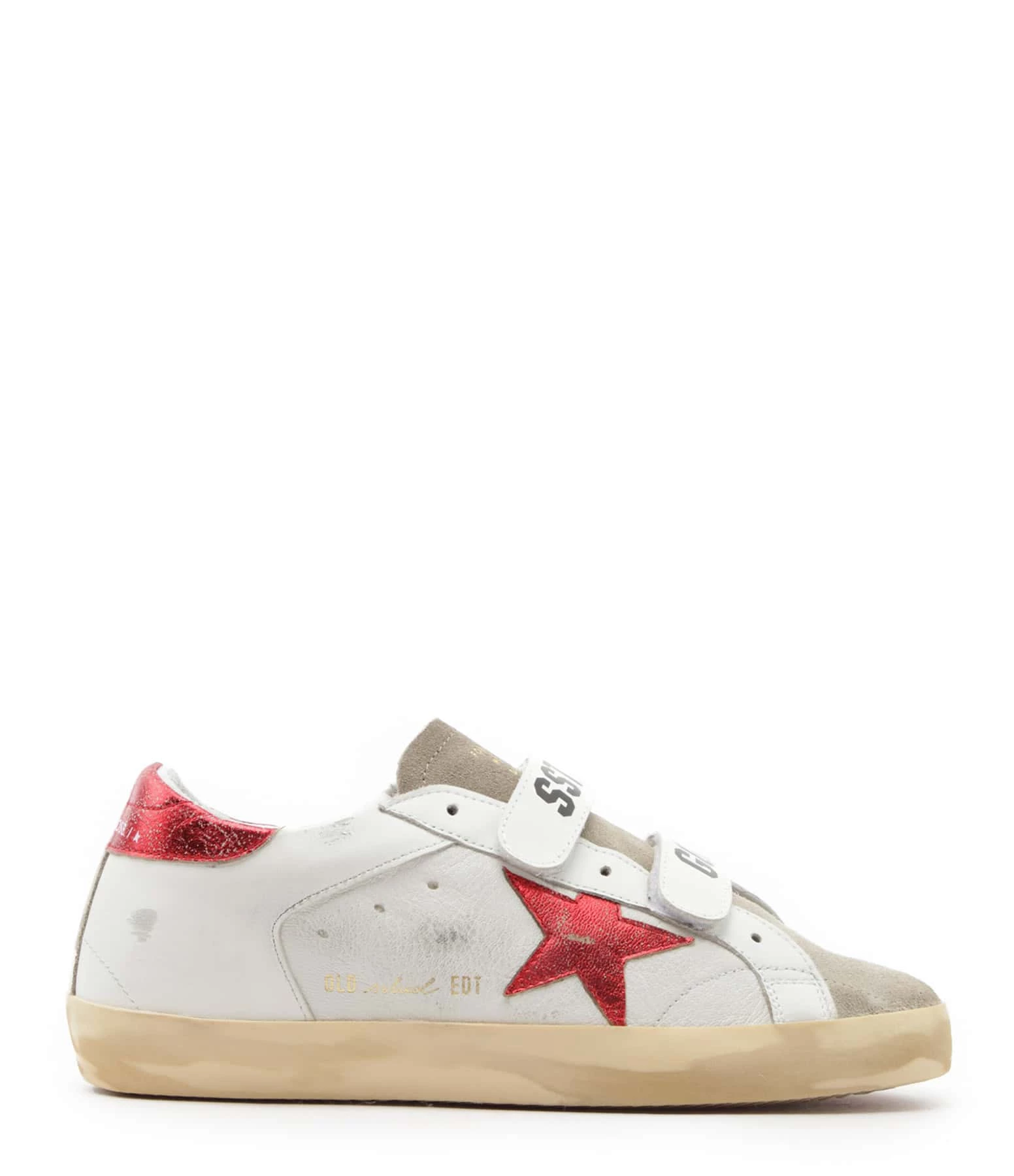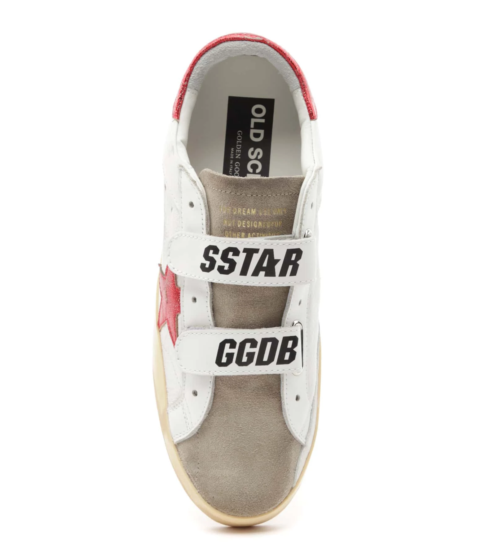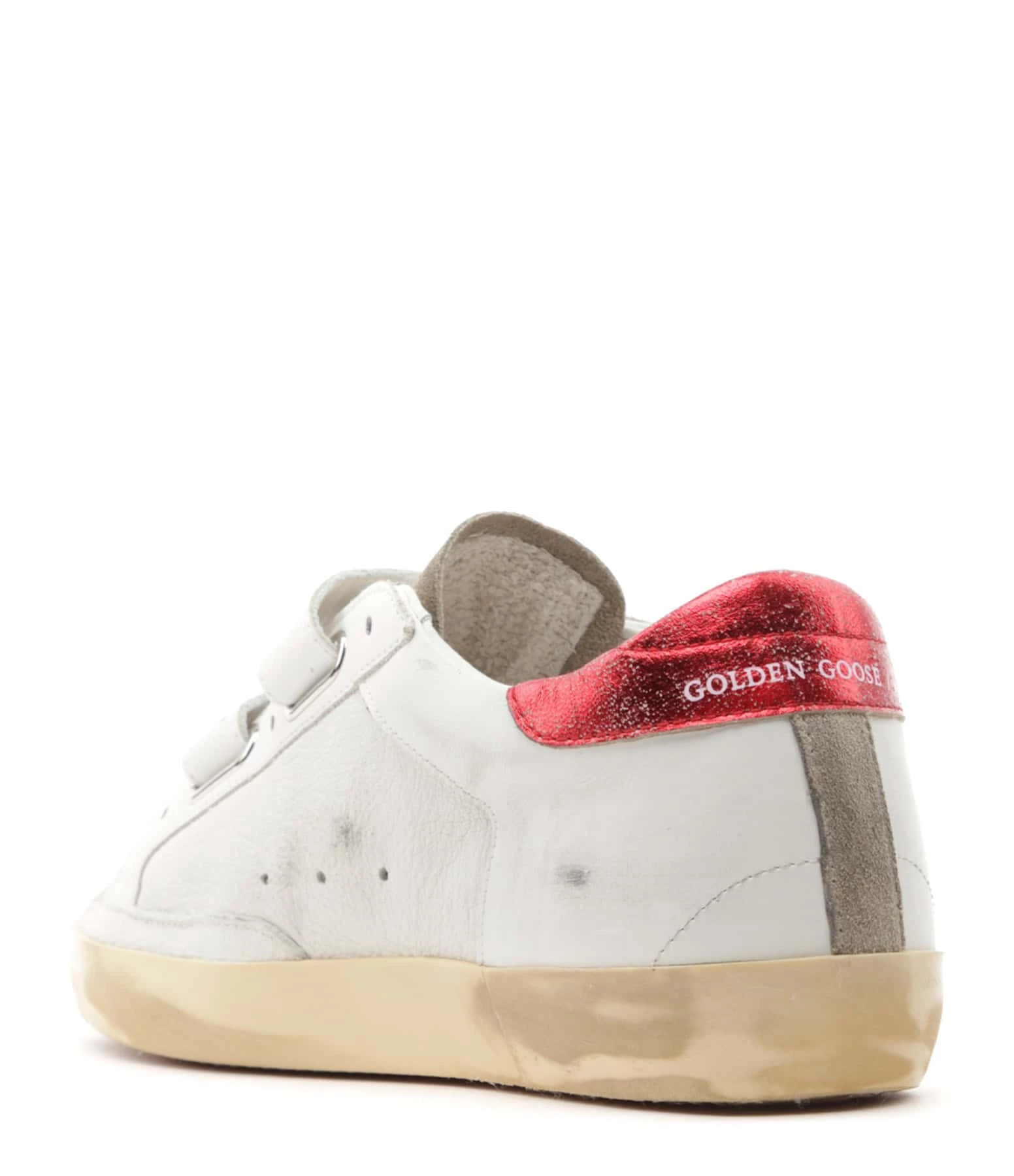 Baskets basses en cuir lisse blanc. Empiècement étoile et renfort talon rouges métalliques. Fermeture par scratch avec inscription noire “SSTAR GGDB”.