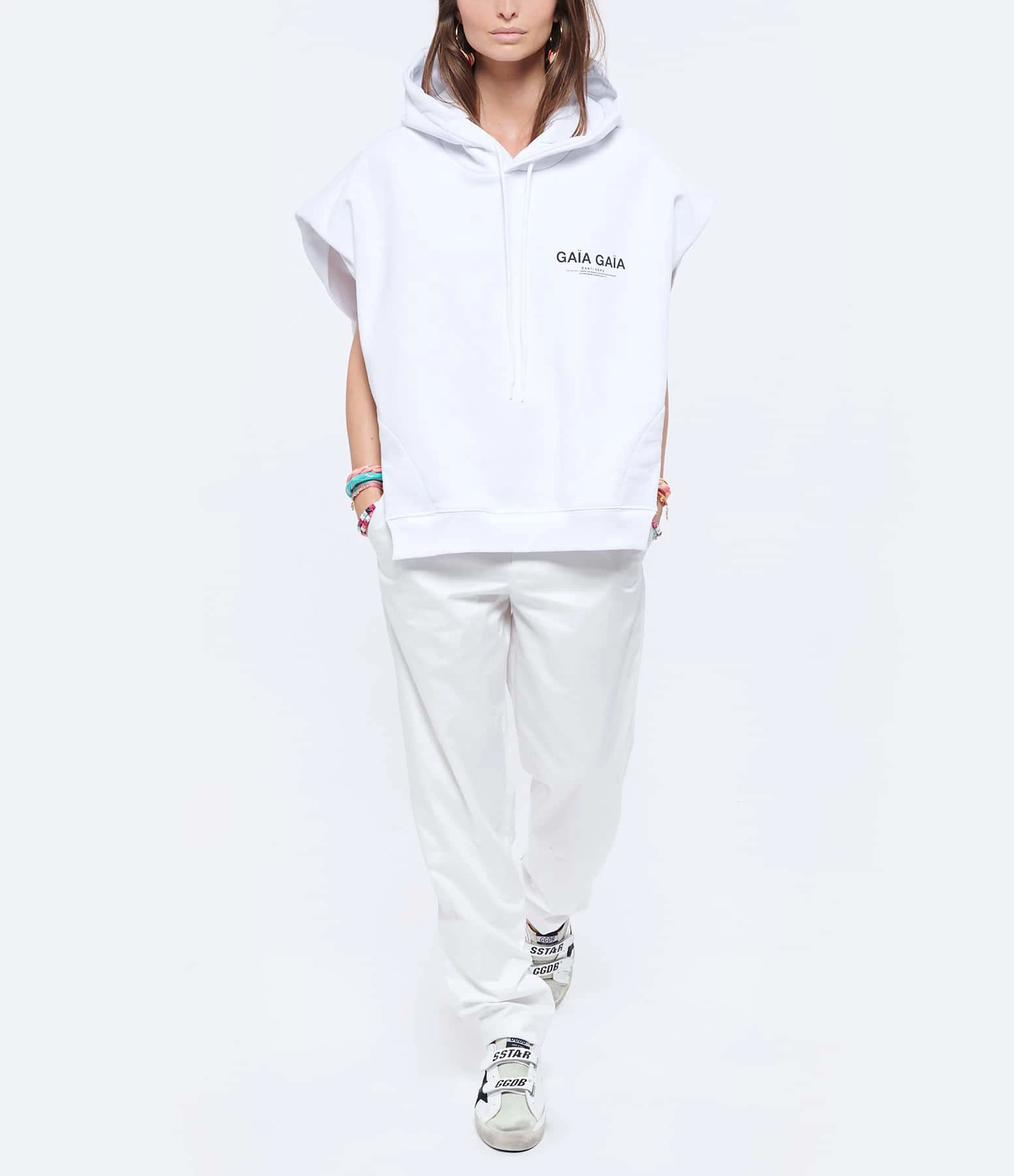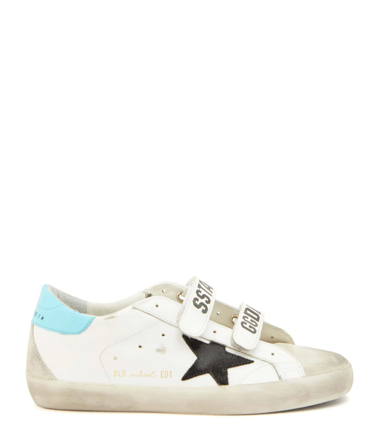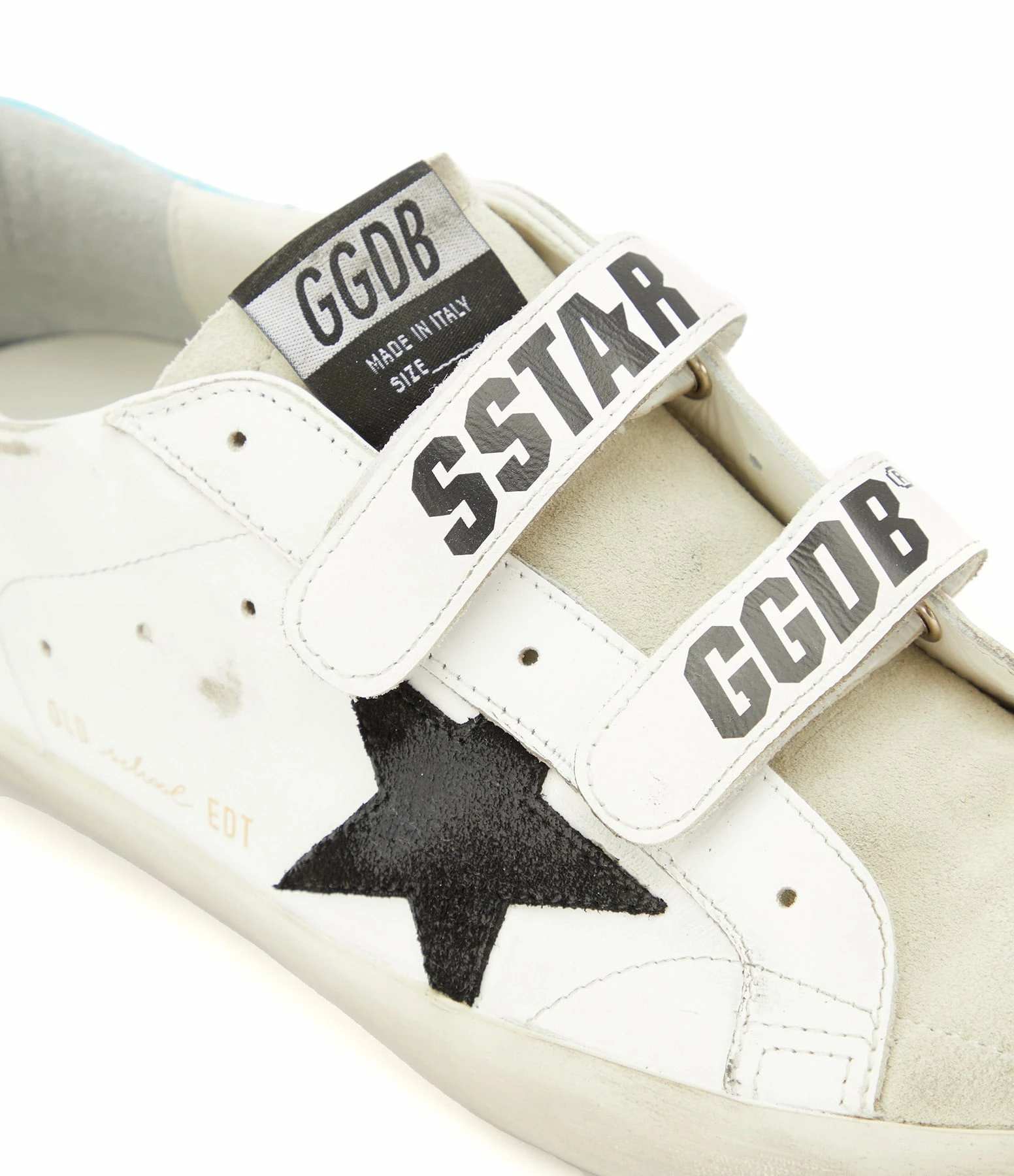 Baskets basses en cuir lisse blanc. Empiècement étoile en cuir suédé noir et renfort talon en cuir lisse bleu. Fermeture par scratch avec inscription noire “SSTAR GGDB”.