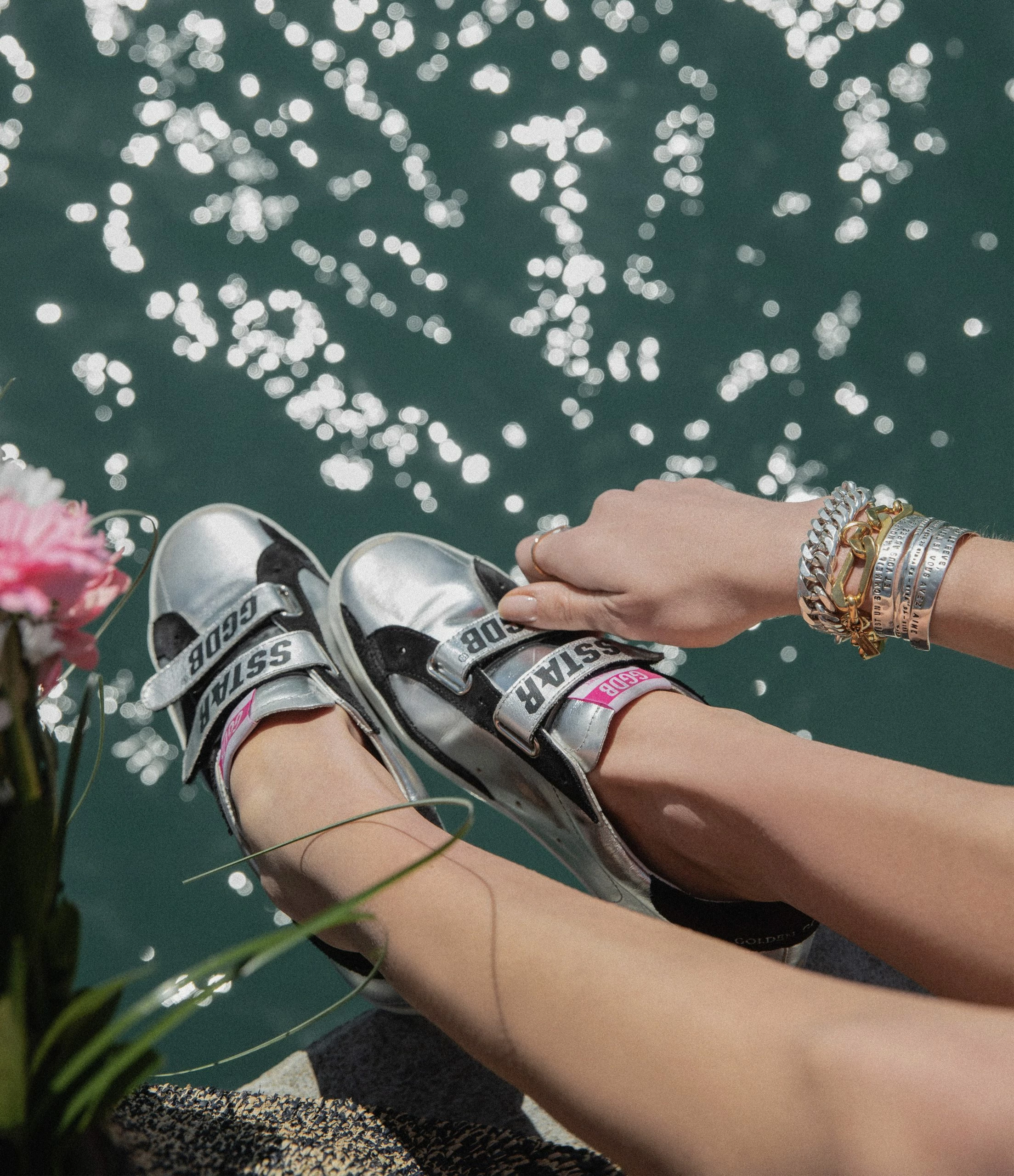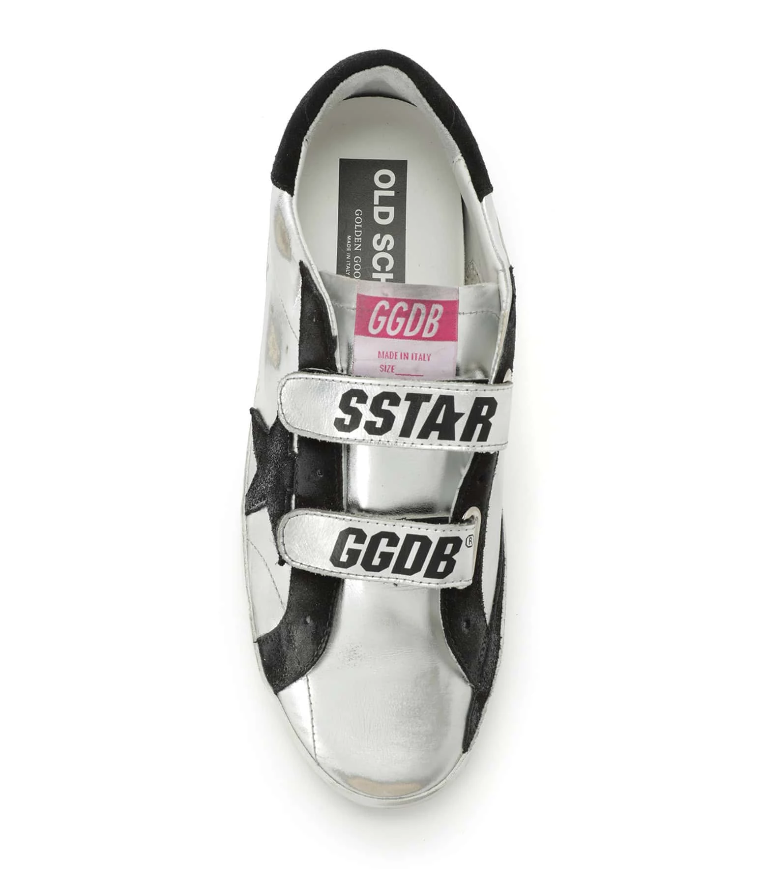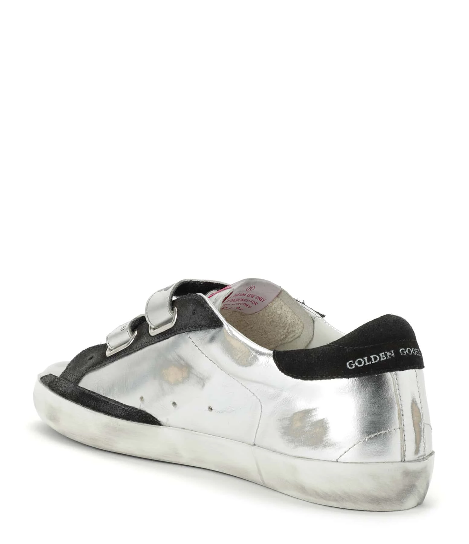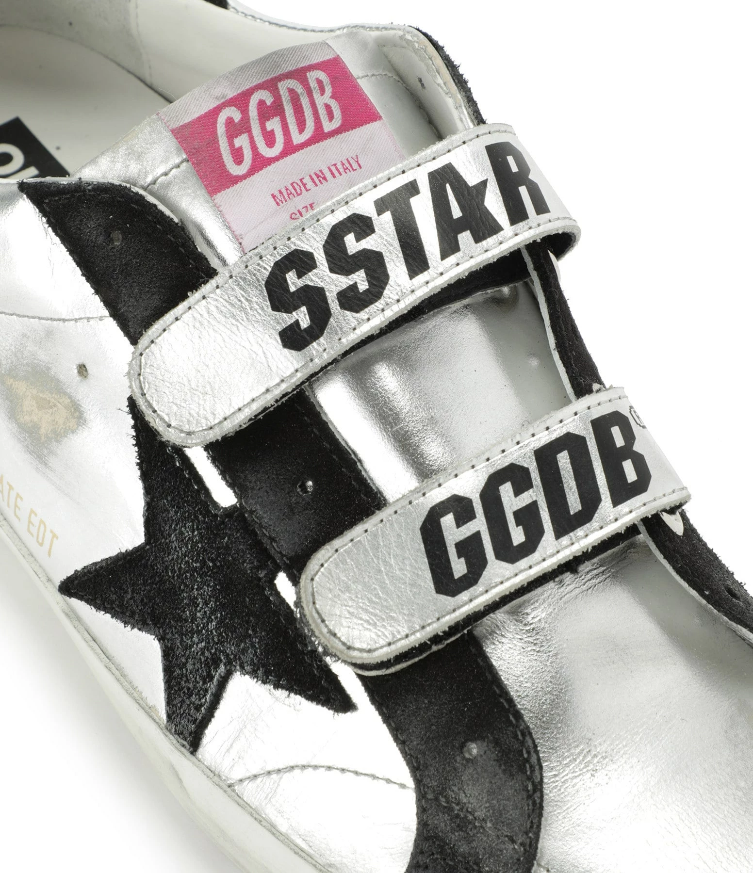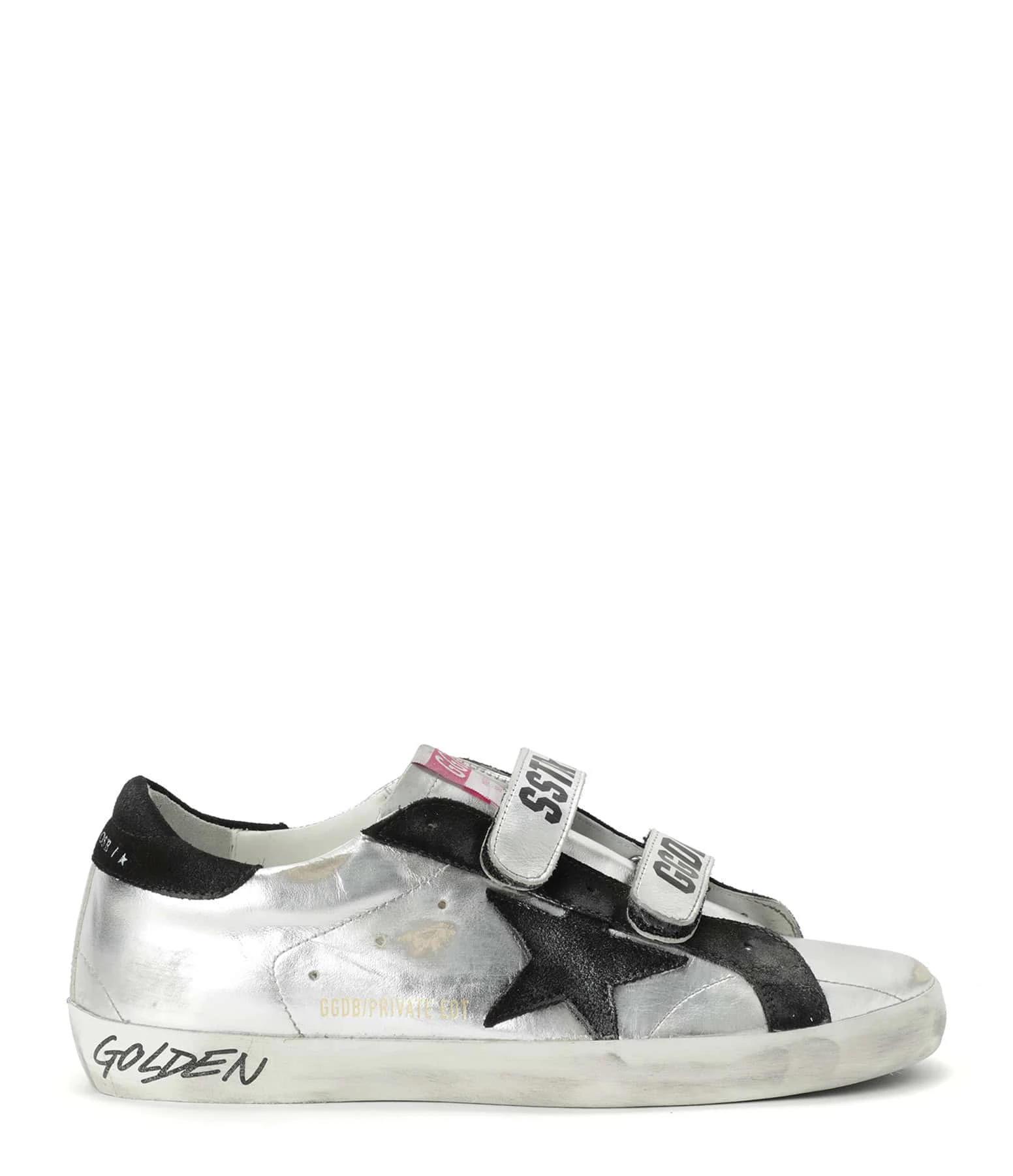 Baskets basses en cuir laminé métallisé argenté. Empiècement étoile et renfort talon en cuir suédé noir. Fermeture par scratchs sérigraphiés. Inscription “GGBD/PRIVATE EDT” dorée sur le côté extérieur. Intérieur en maille bouclette et cuir. Effets usés et tachés par endroits. Le soin apporté aux détails rend unique chaque modèle.