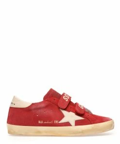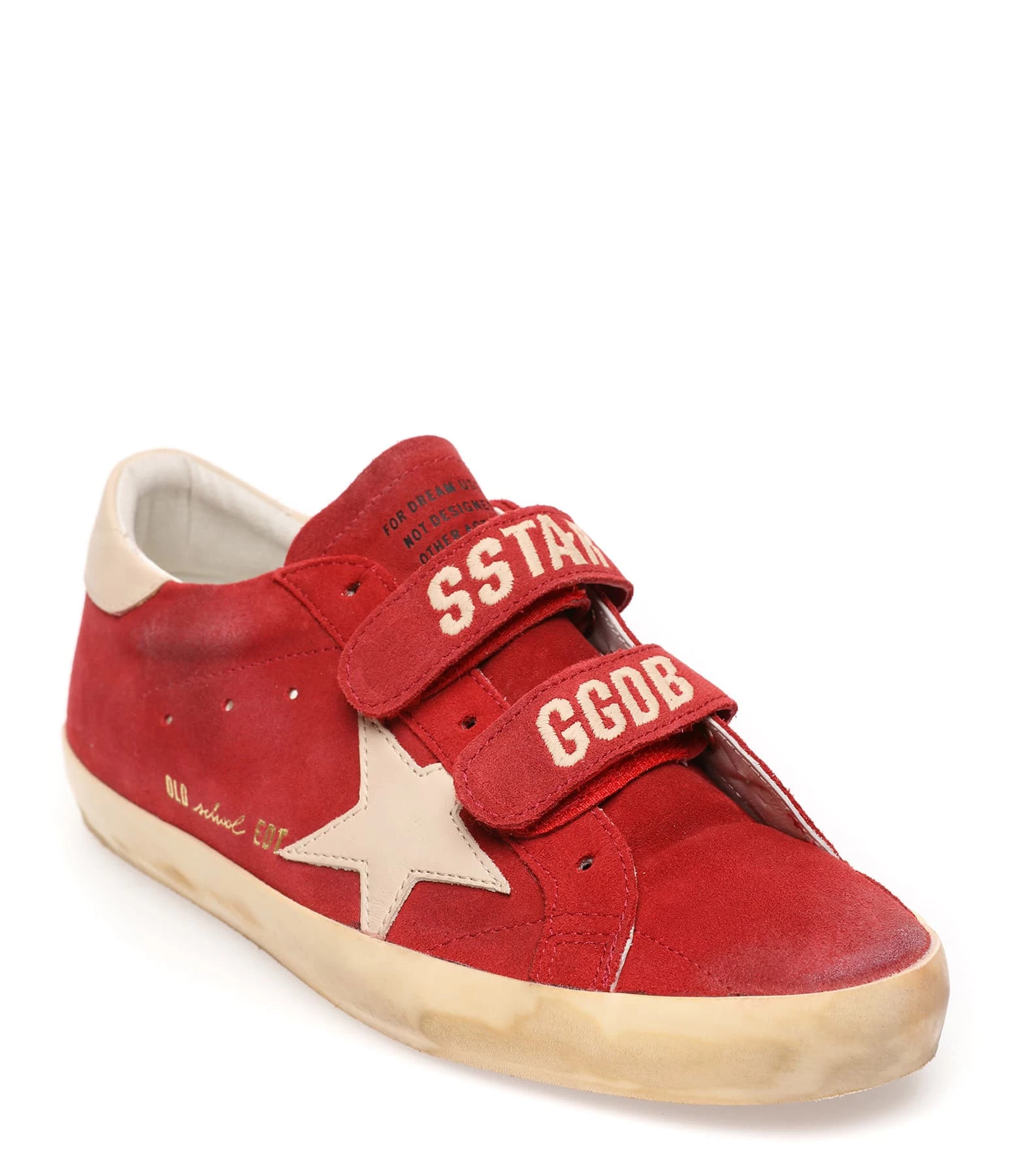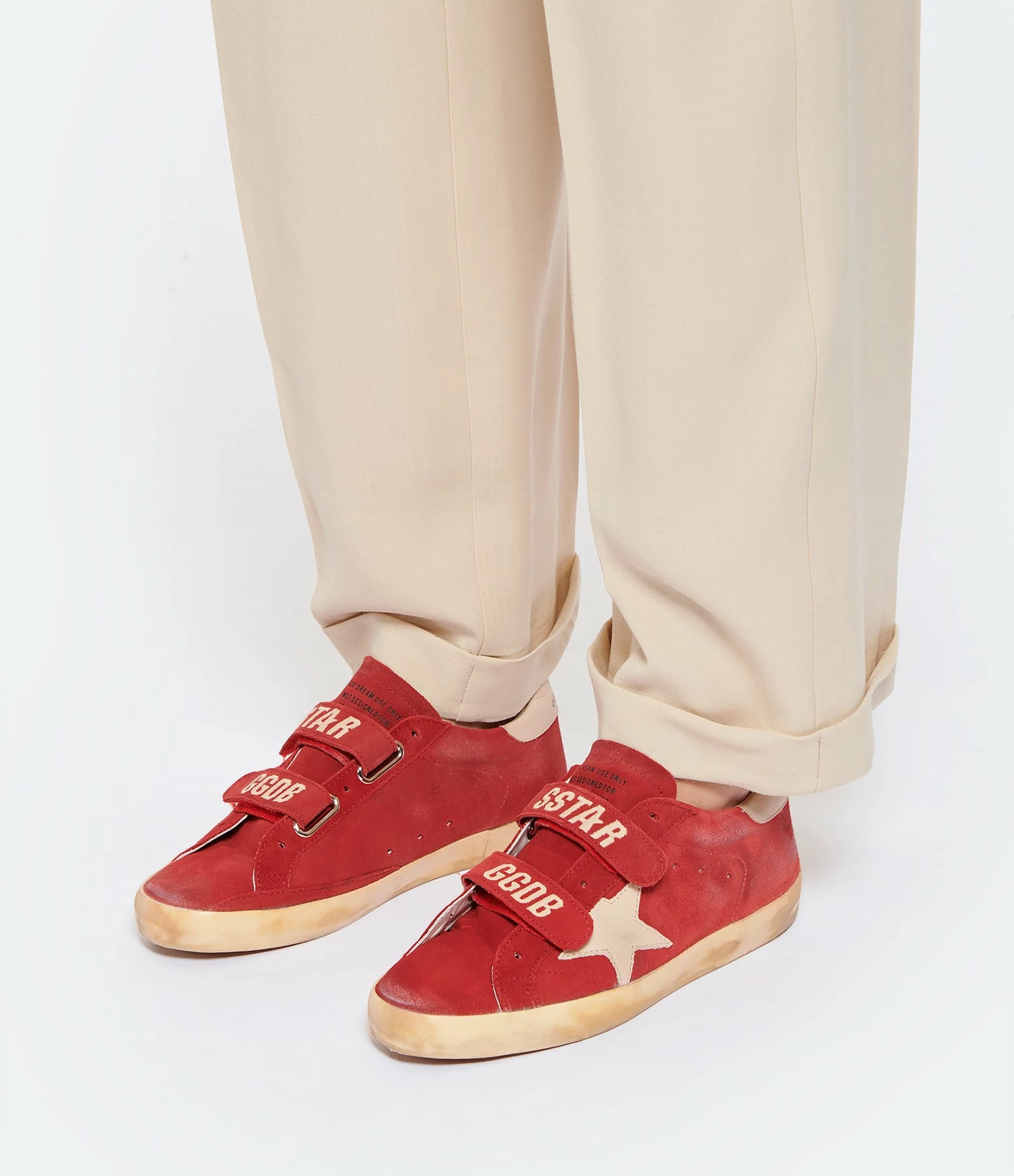 Baskets basses en cuir suédé rouge. Empiècement étoile et renfort talon en cuir lisse beige. Scratch avec inscription noire “SSTAR GGDB”. Intérieur en maille bouclette et cuir.
