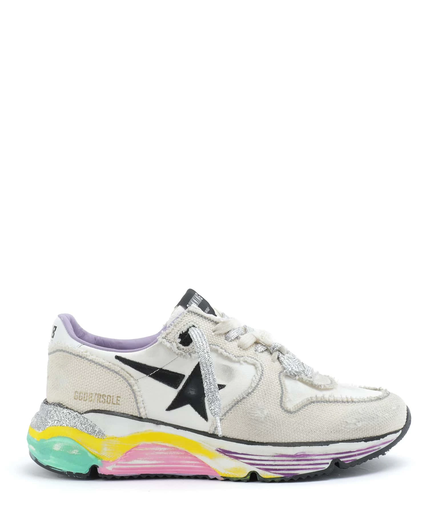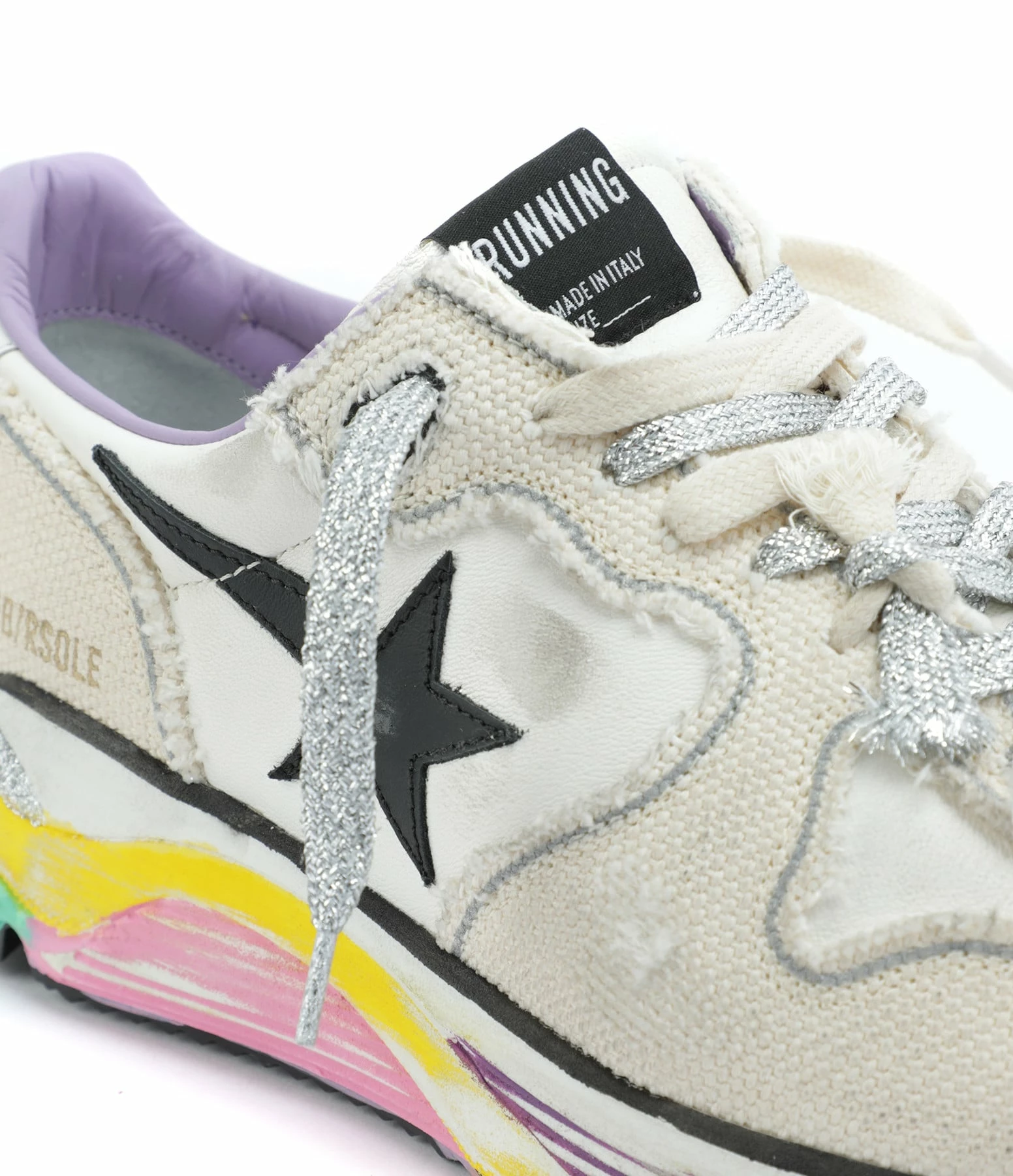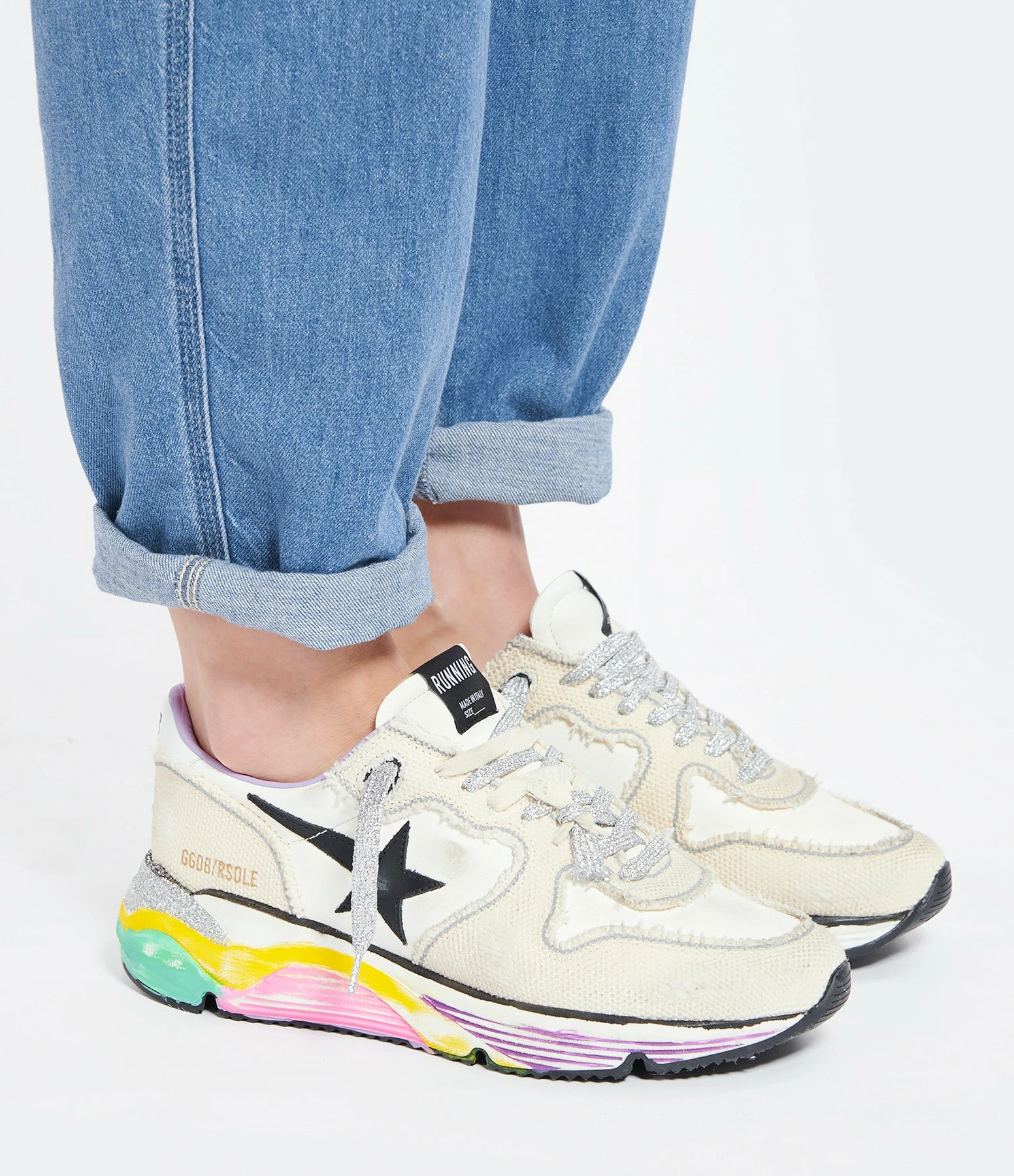 Baskets running avec empiècements multi-matières blanches et beiges. Empiècement étoile en cuir suédé noir. Renfort talon en paillettes argentées. Lacets à paillettes argentées. Inscription “GGDB/RSOLE” sur le côté extérieur. Semelles multicolores effet usées. Intérieur en maille bouclette et cuir.