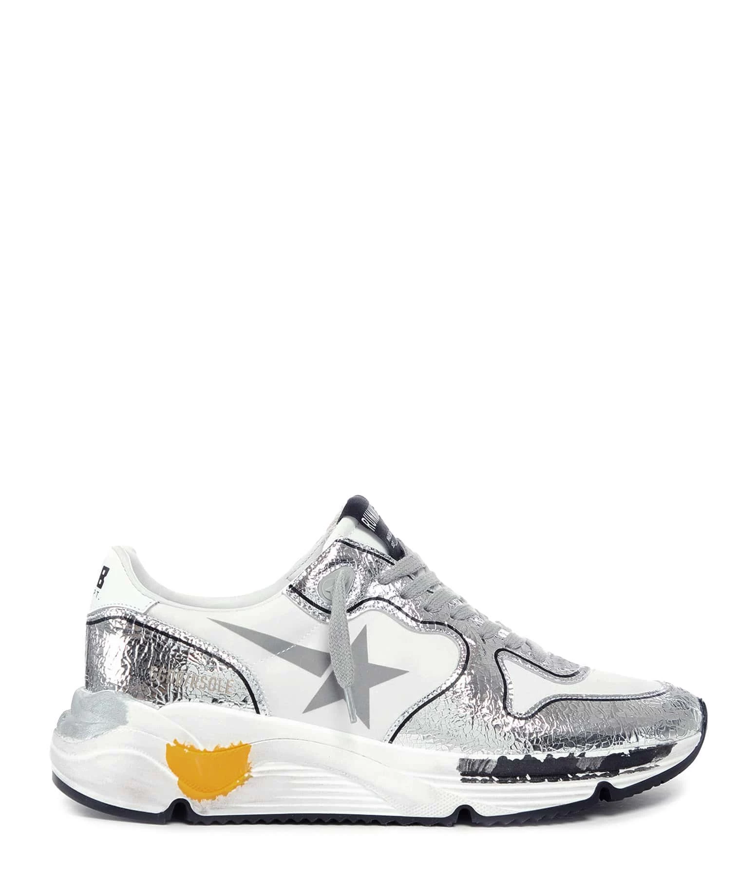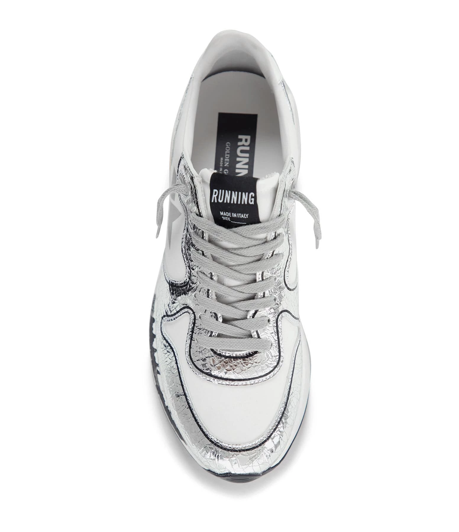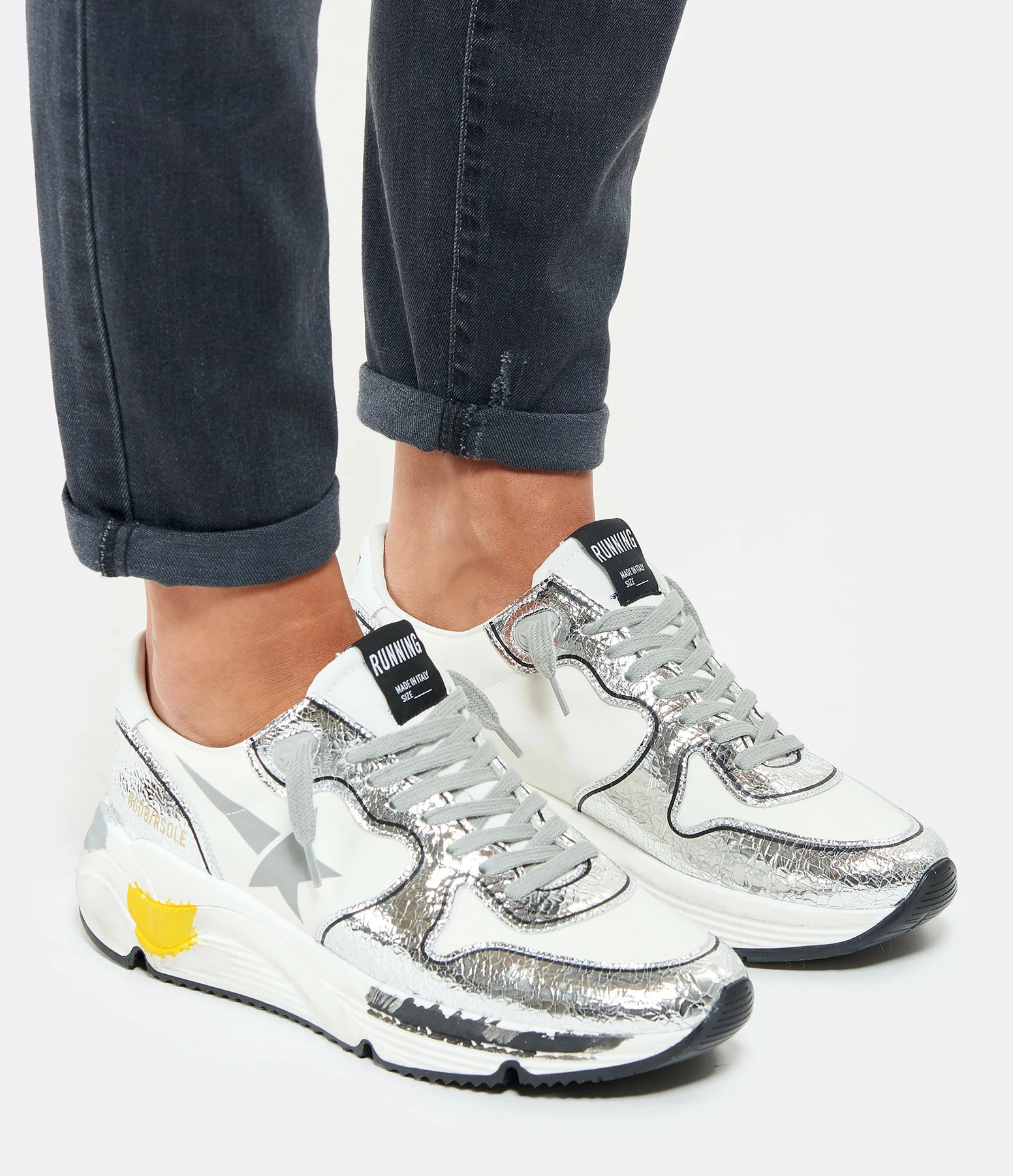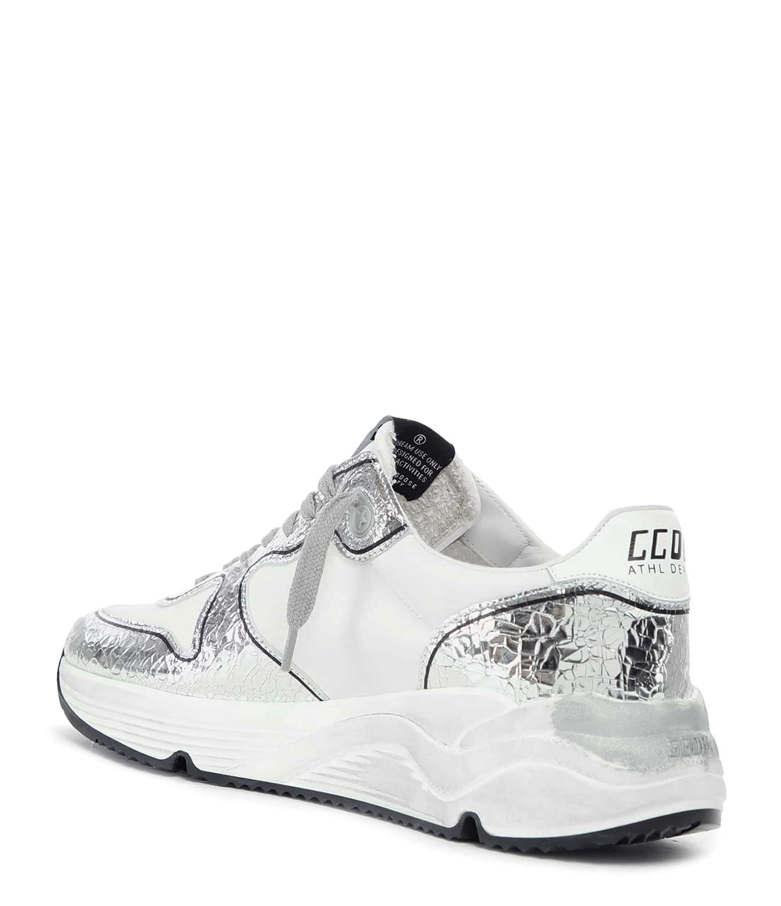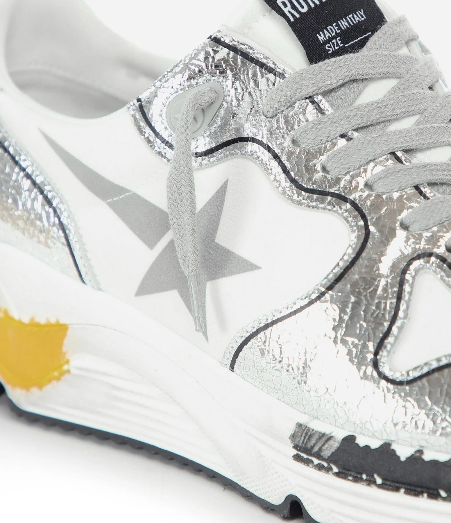 Baskets running pour femme en cuir et multi-matières blanc et argenté. Semelle tachée de différentes couleurs volontairement. Intérieur en maille bouclette et cuir.