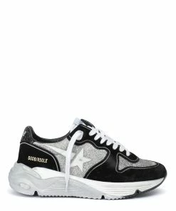 Baskets running en cuir suédé noir et paillettes argentées. Empiècement étoile en cuir lisse blanc. Renfort talon en paillettes noires. Lacets blancs. Semelle effet tâches de peinture grises. Inscription “GGDB/RSOLE” sur le côté extérieur. Intérieur en maille bouclette et cuir.