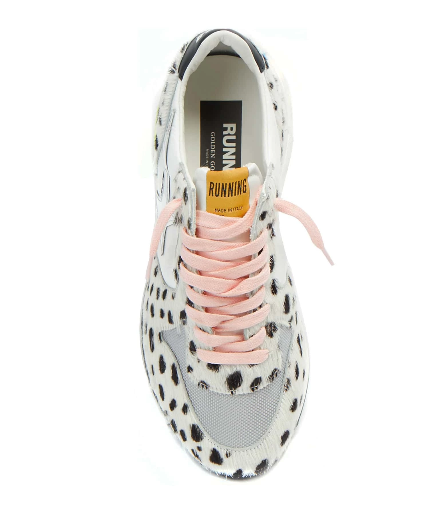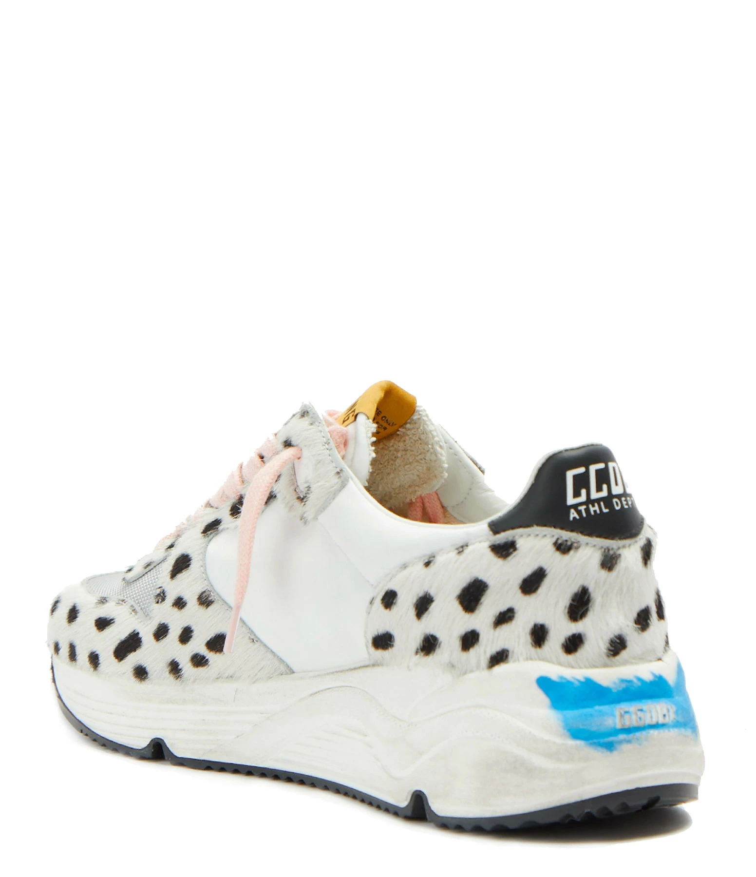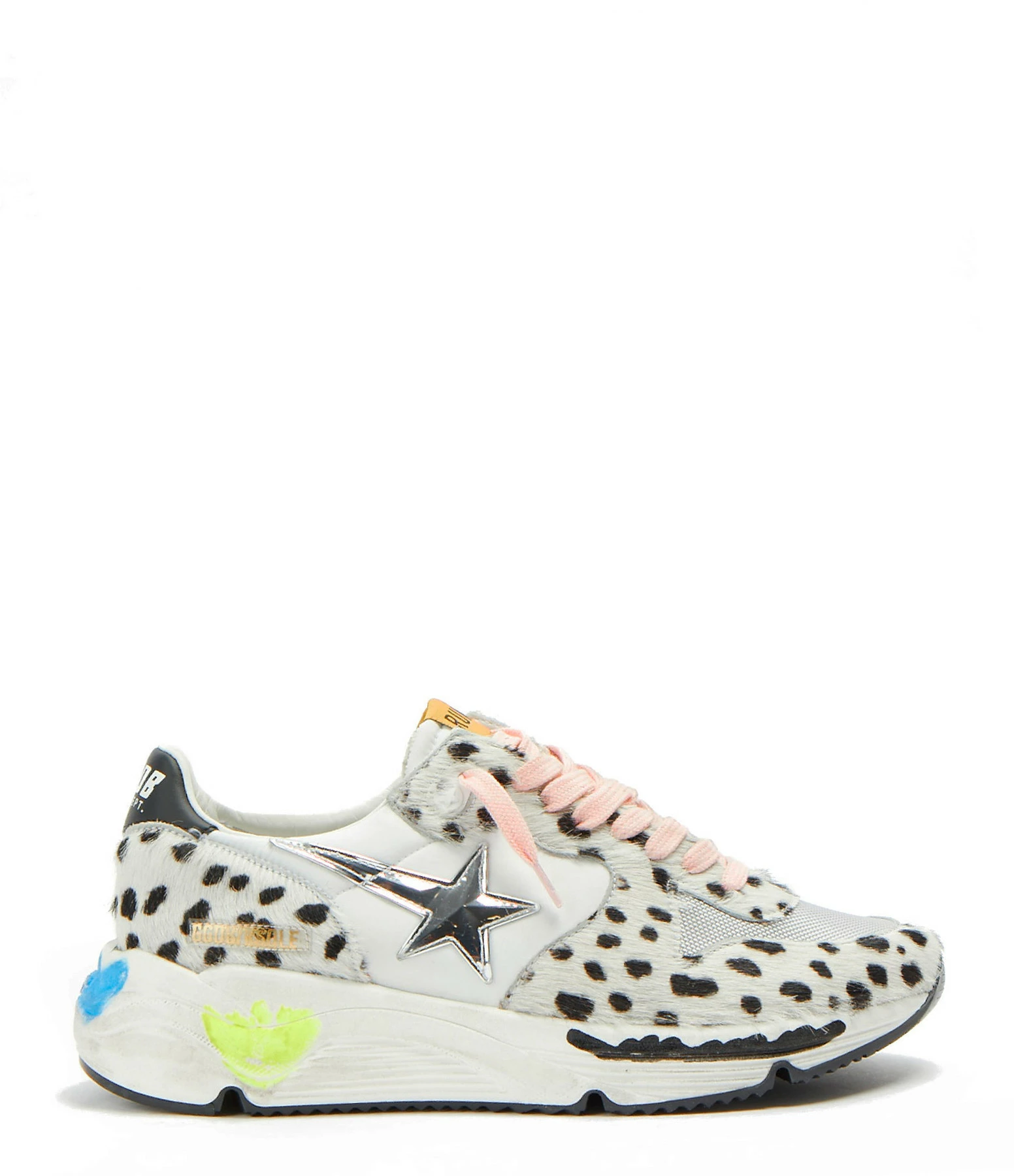 Baskets running en cuir pony à pois noir et blanc et cuir lisse blanc. Empiècement étoile en relief argenté. Renfort talon en cuir lisse noir. lacets roses. Inscription “GGDB/RSOLE” sur le côté extérieur. Semelle effet tâches de peinture. Intérieur en maille bouclette et cuir.