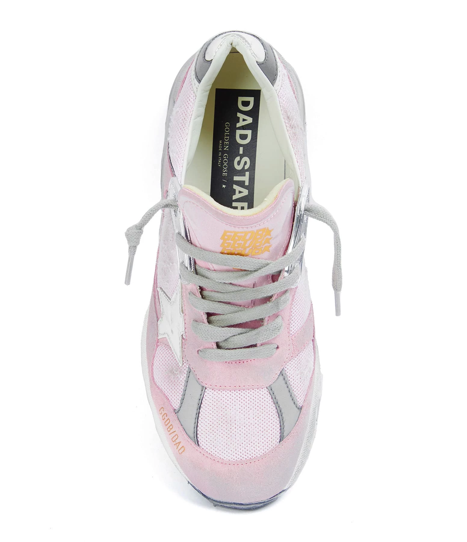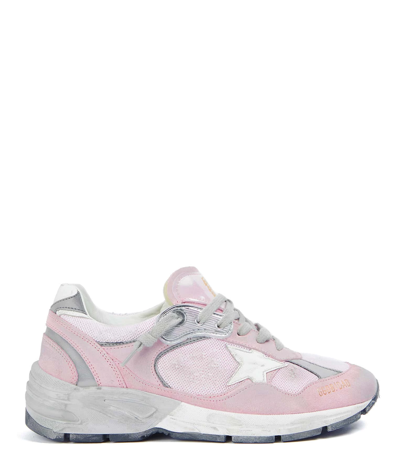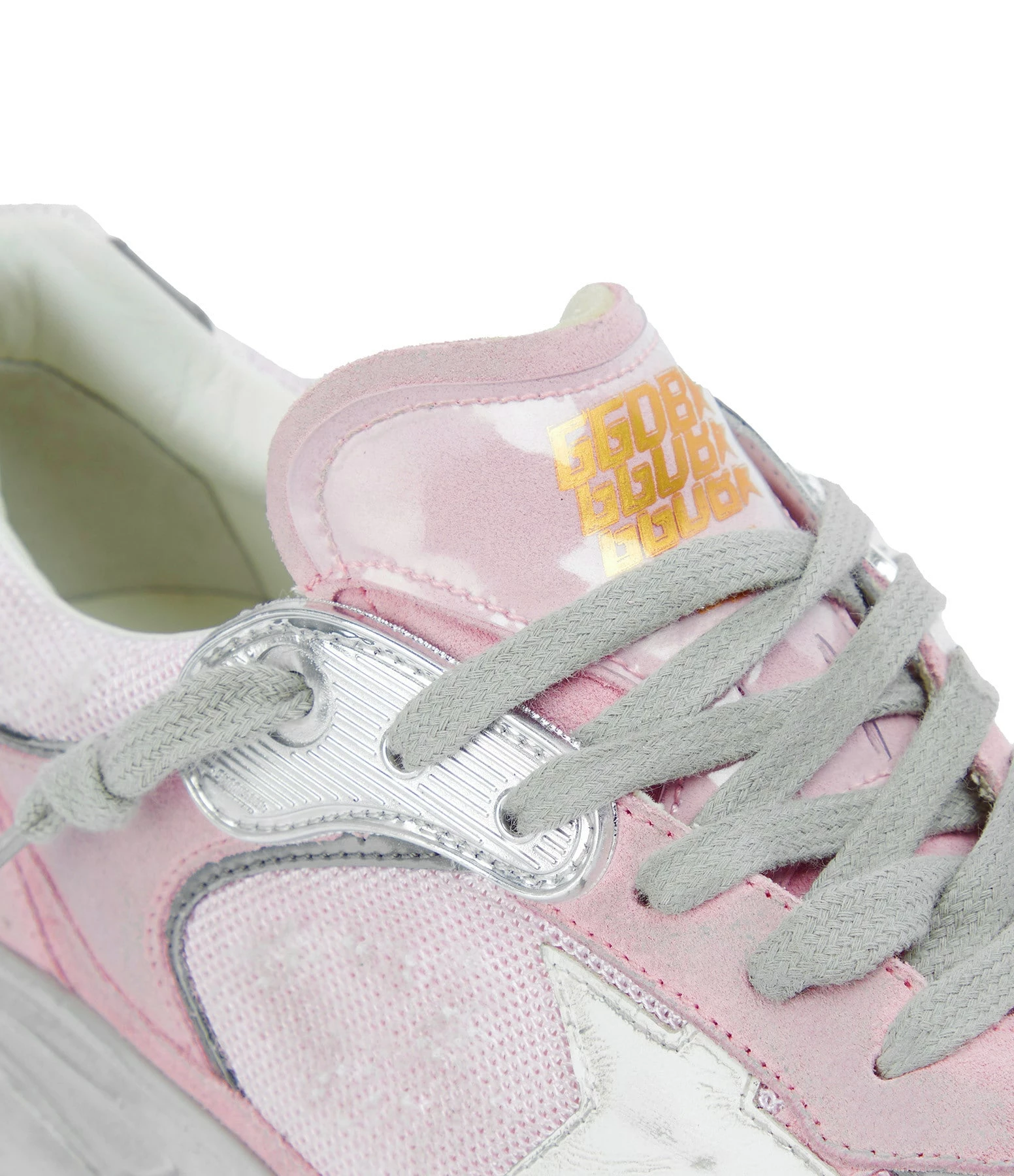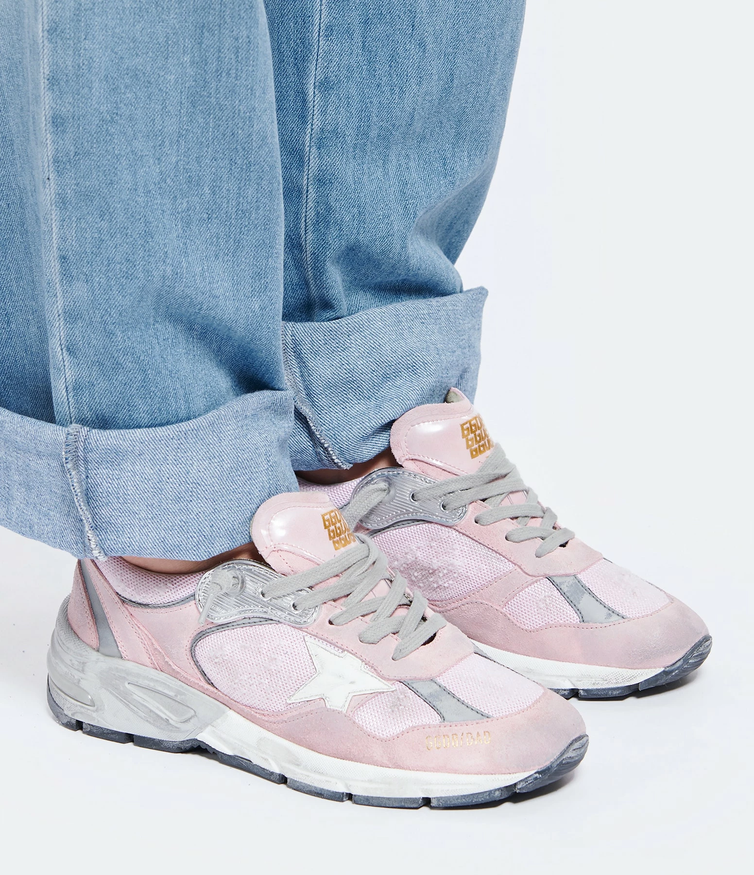 Baskets running en cuir suédé et toile rose. Empiècement étoile en cuir blanc. Empiècement en plastique argenté au niveau des lacets. Inscription “GGDB/DAD” sur le côté extérieur. Semelle blanche et grise effet vieilli volontairement. Intérieur en maille bouclette et cuir.