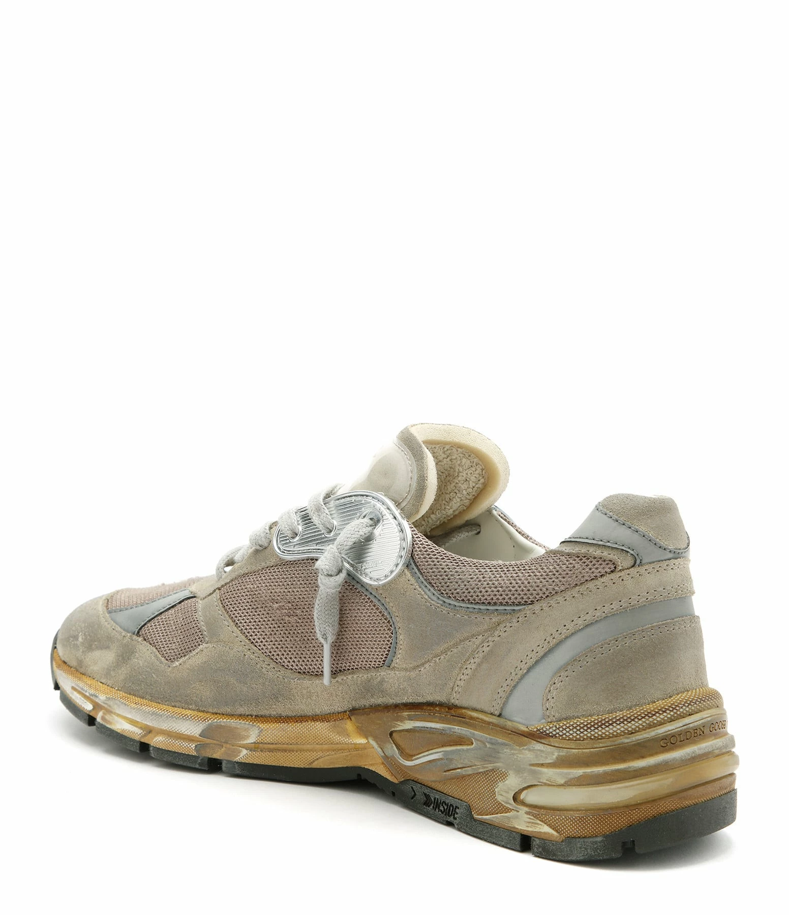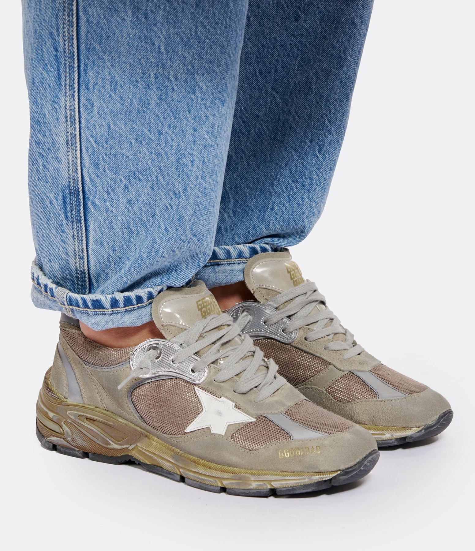Baskets running en cuir et multi-matière taupe et argenté. Empiècement logo étoile en cuir lisse blanc cousu sur le côté. Empiècements en cuir suédé cuir sur tout le tour de la chaussure, la languette et le contrefort. Inscription “GGDB/DAD” sérigraphiée en doré sur le côté. Lacets gris. Inscription “GGDB Made in Italy” sérigraphiée sur la languette. Intérieur doublé en maille bouclette et cuir. Effets usés par endroits. Le soin apporté aux détails rend unique chaque modèle.