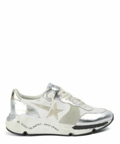 Baskets running en cuir multi-matière argentée et blanche. Empiècement étoile et renfort talon en cuir lisse doré. Lacets écru. Intérieur en maille bouclette et cuir. Inscription ” Ne soyez pas parfait… Soyez unique.” sur le côté.