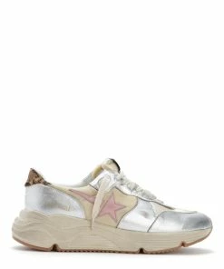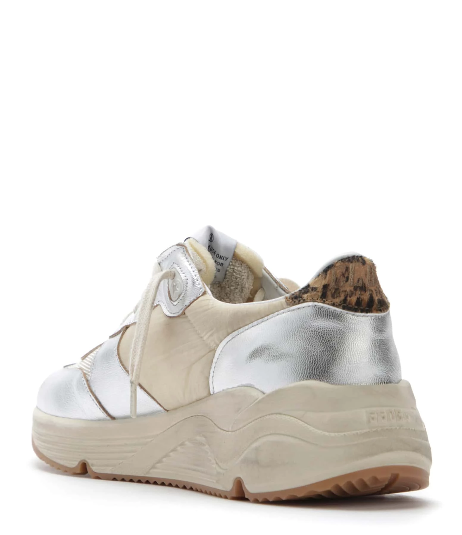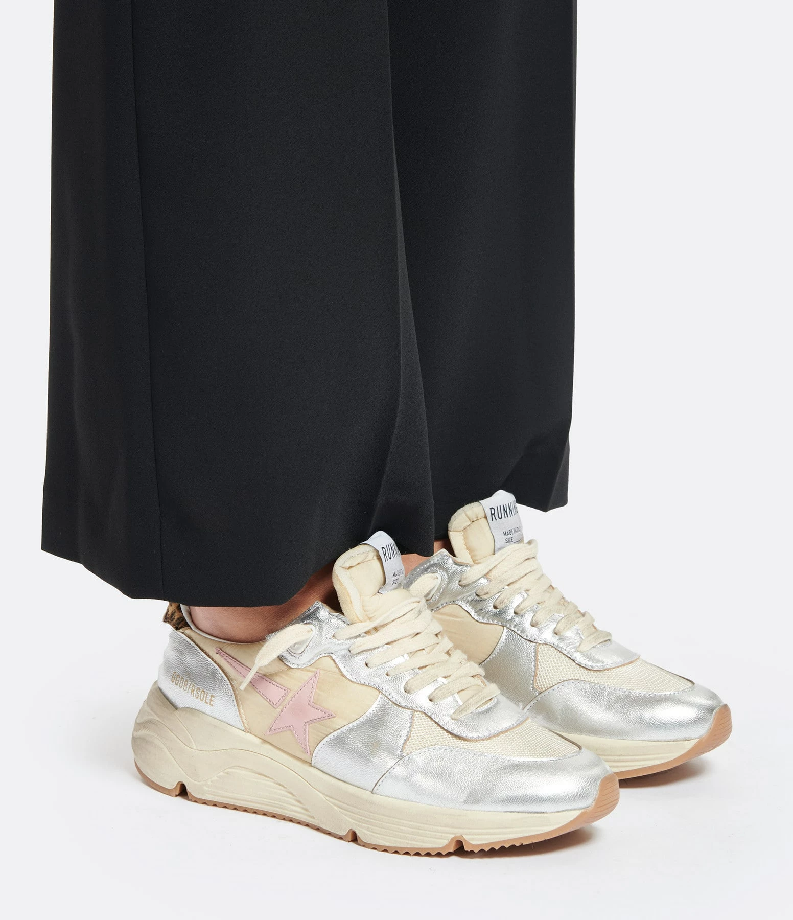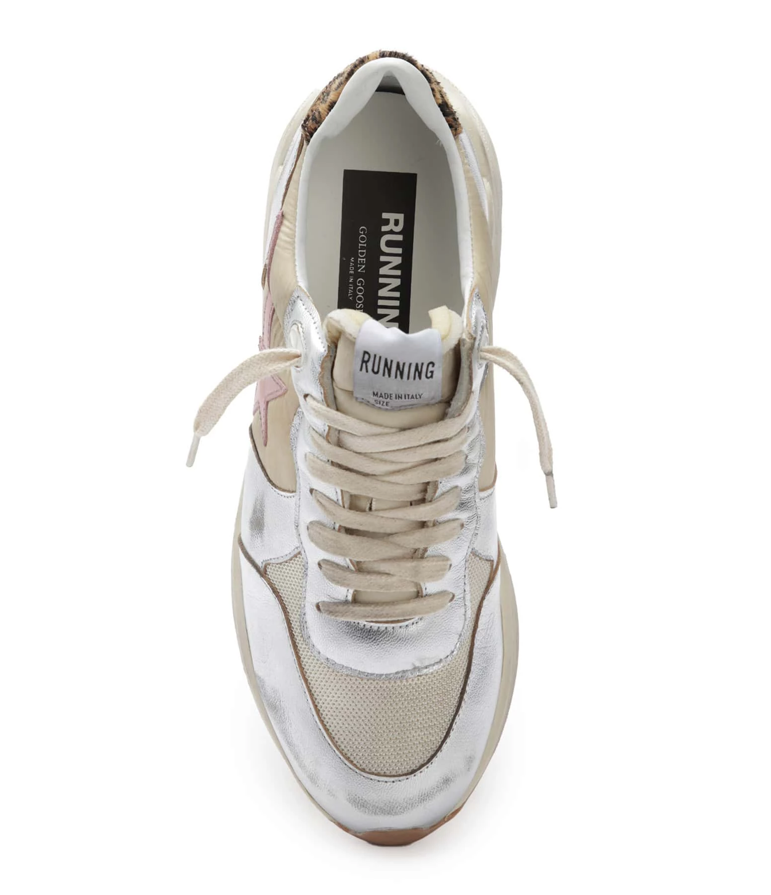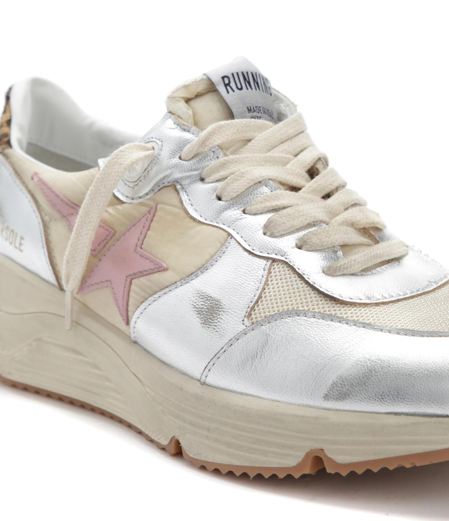 Baskets running en cuir multi-matière et maille argentée et beige. Empiècement étoile rose et renfort talon en cuir façon poulain léopard. Lacets écru. Intérieur en maille bouclette et cuir. Effets usés par endroits. Le soin apporté aux détails rend unique chaque modèle.