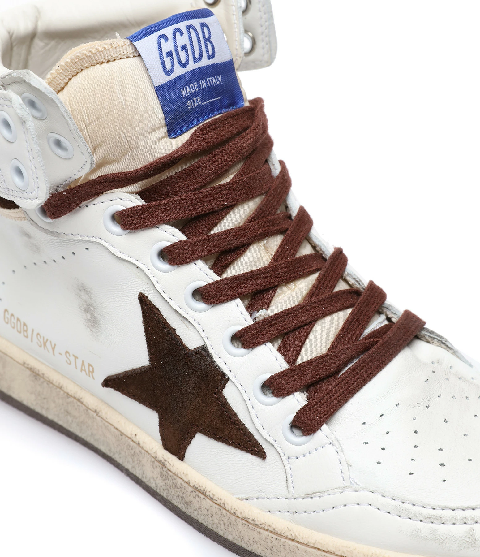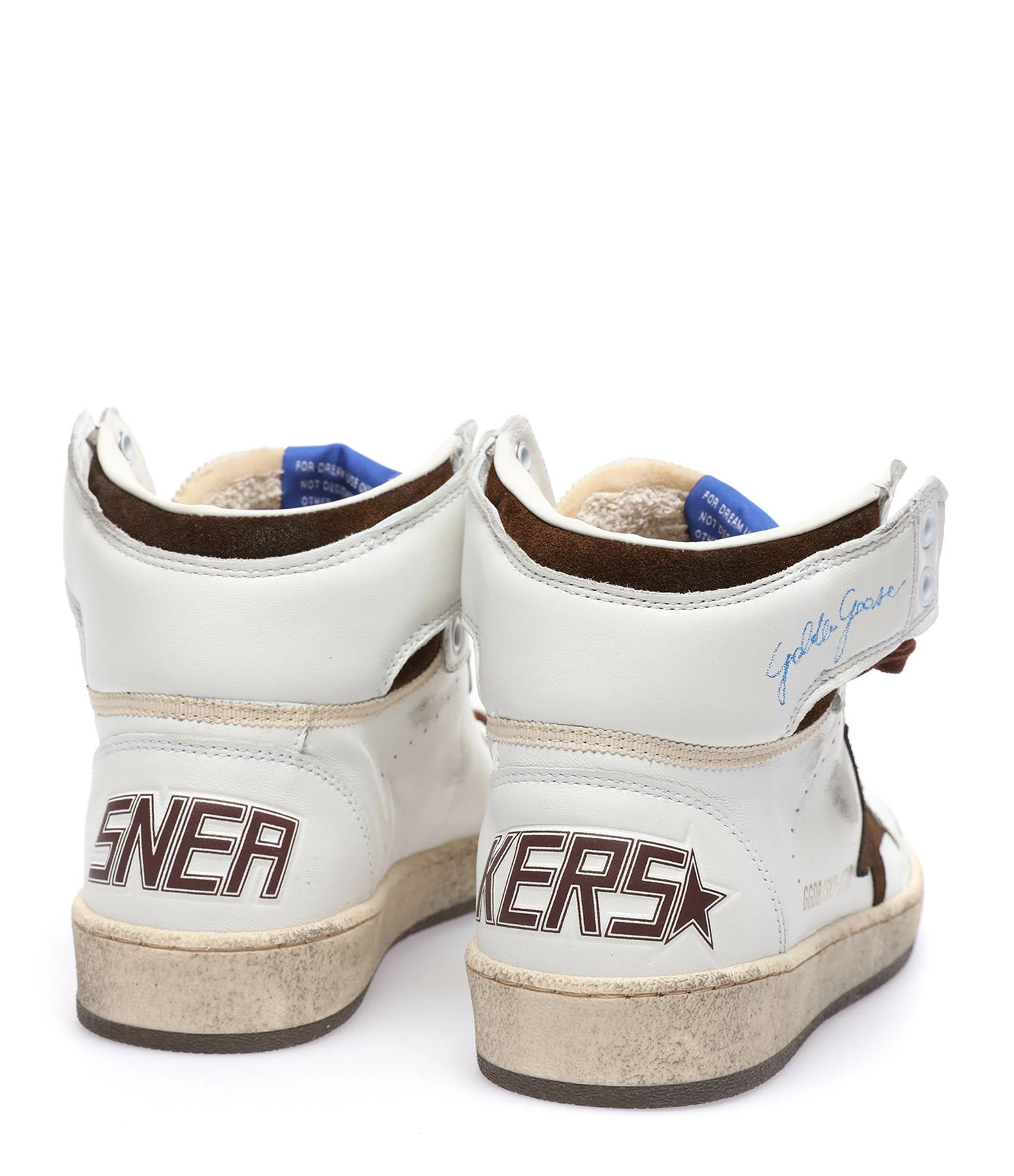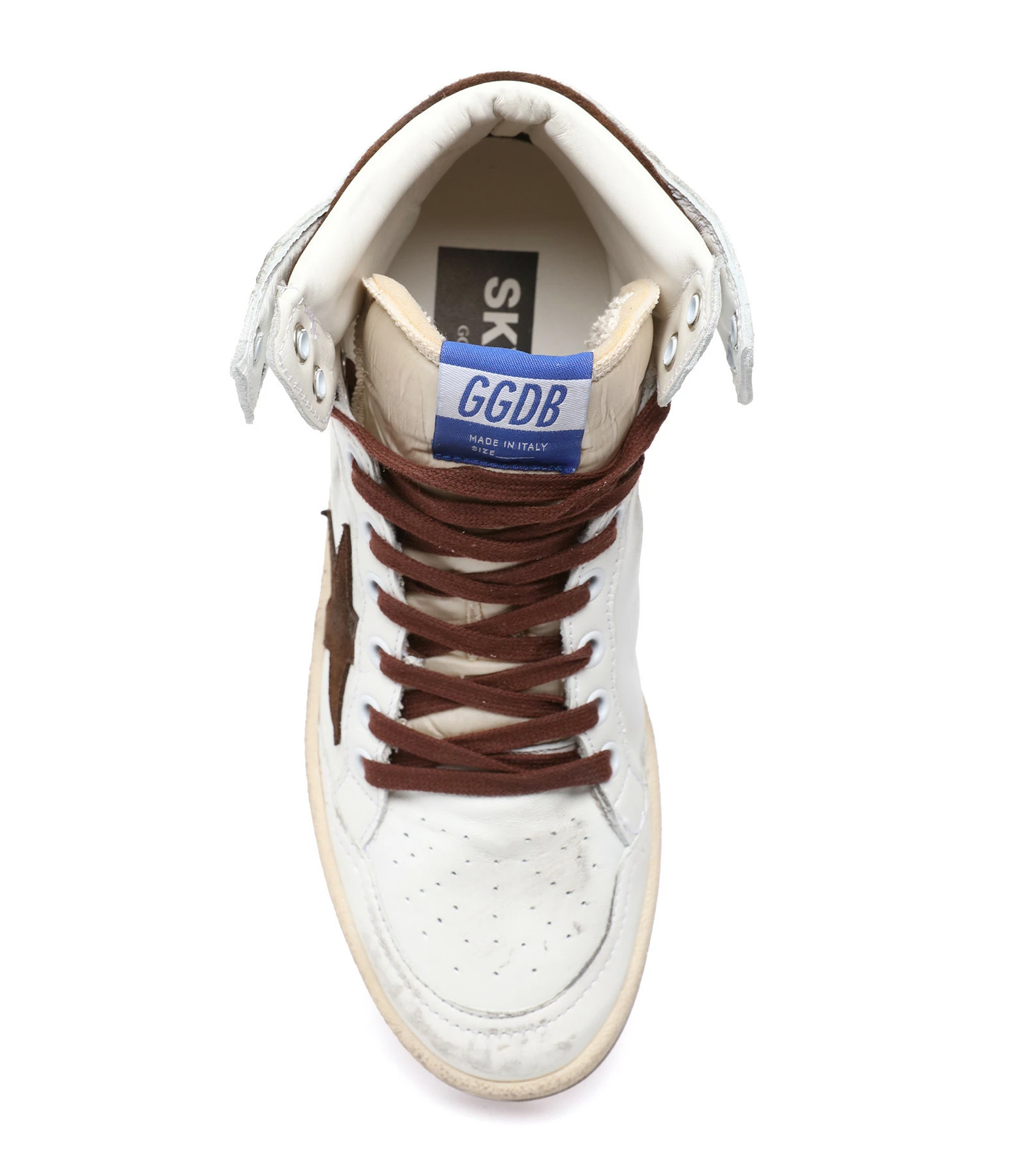 Baskets montantes pour femme en cuir lisse blanc. Empiècement étoile en cuir suédé marron. Lacets marrons. Inscription “SNEA” sur le talon gauche et “KERS” sur le talon droit et “GGDB / SKY-STAR” sur le côté extérieur du pied droit. Intérieur en cuir et maille bouclette.