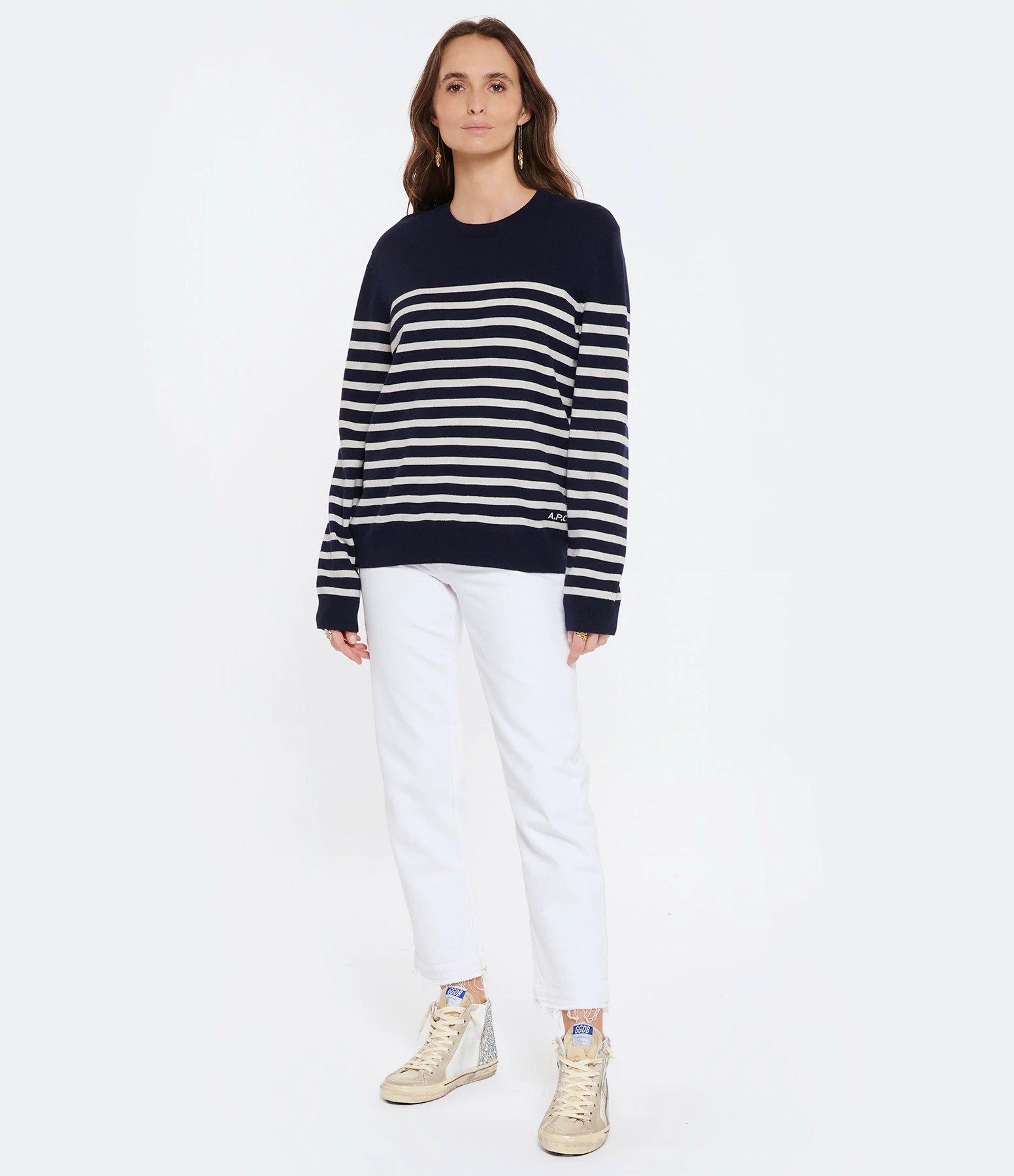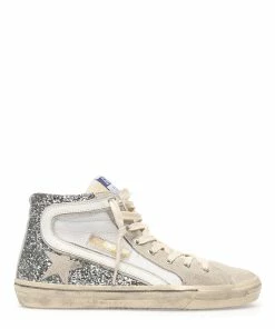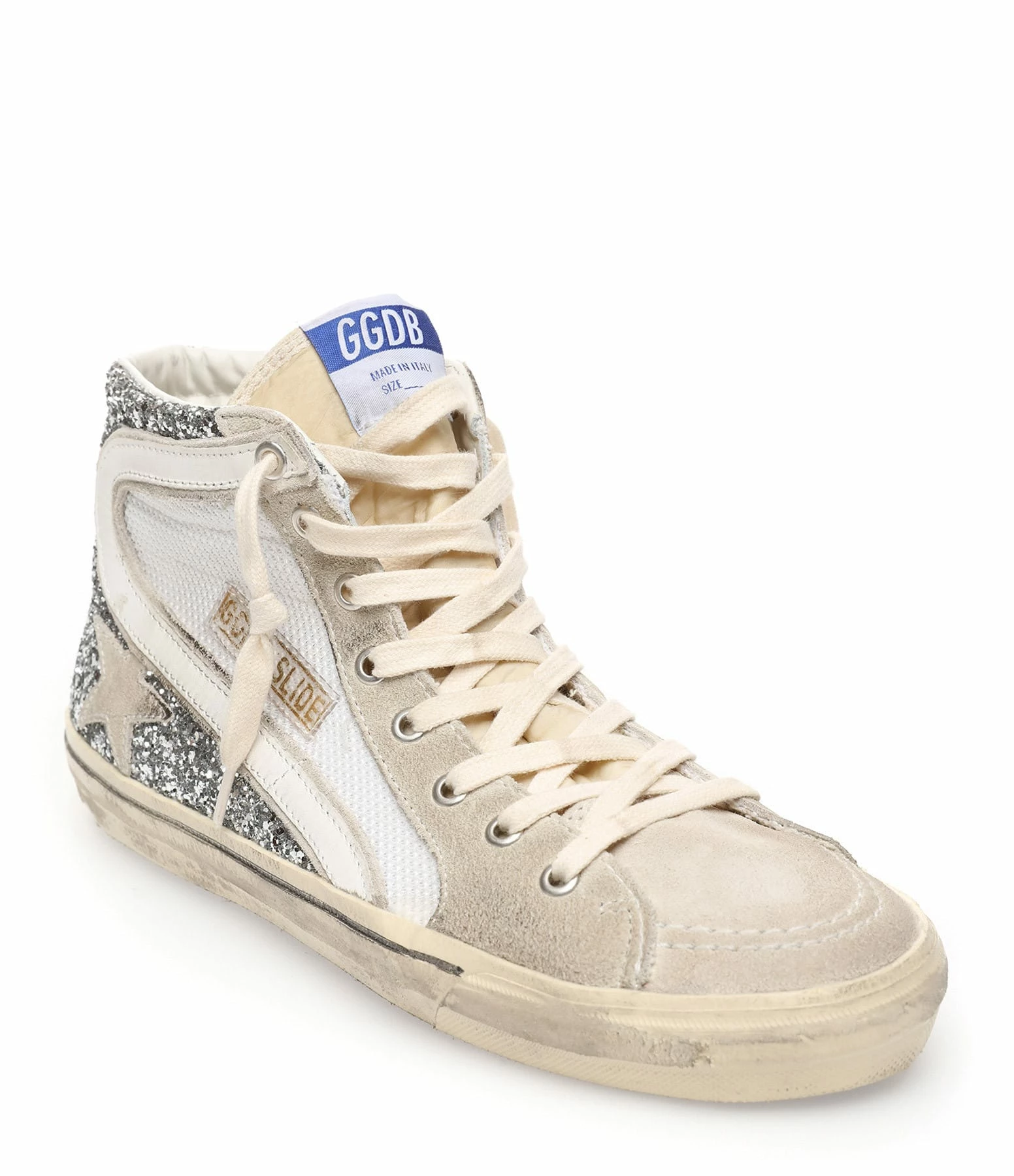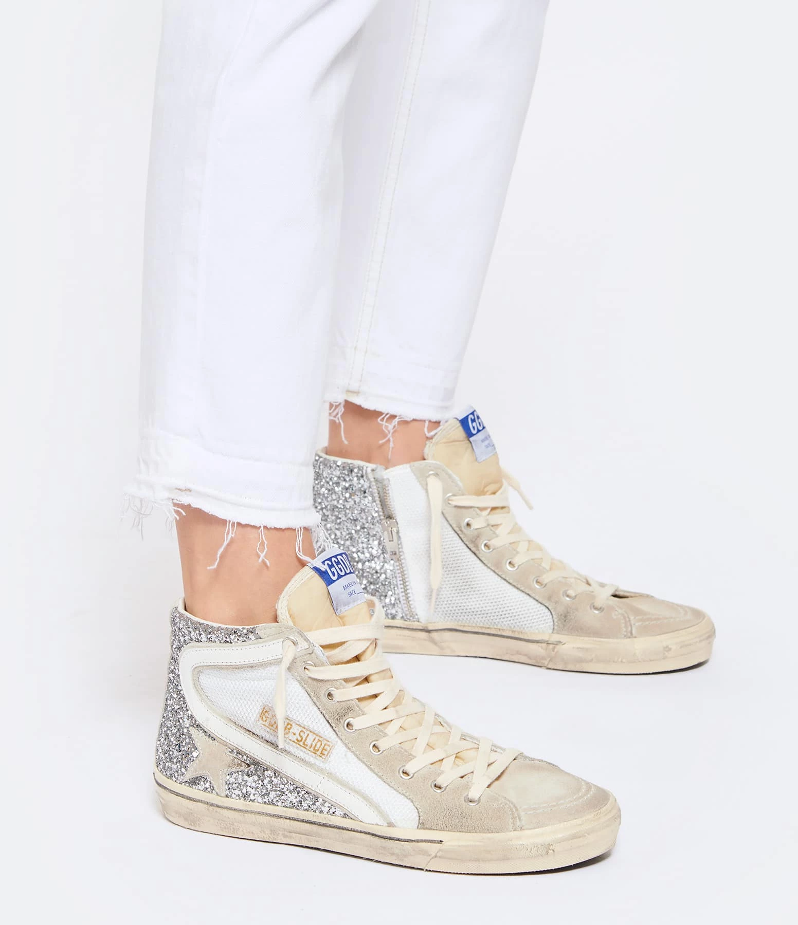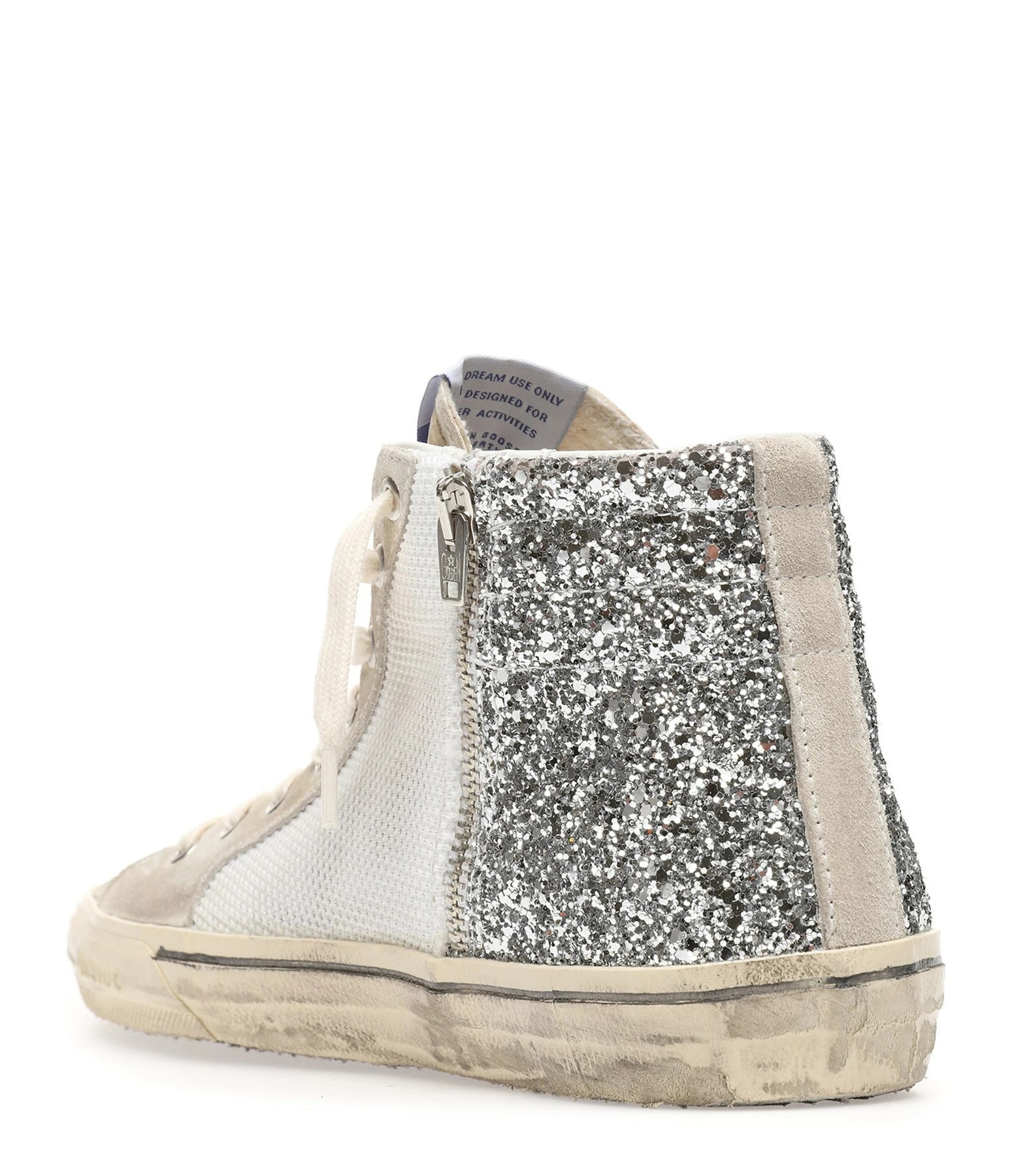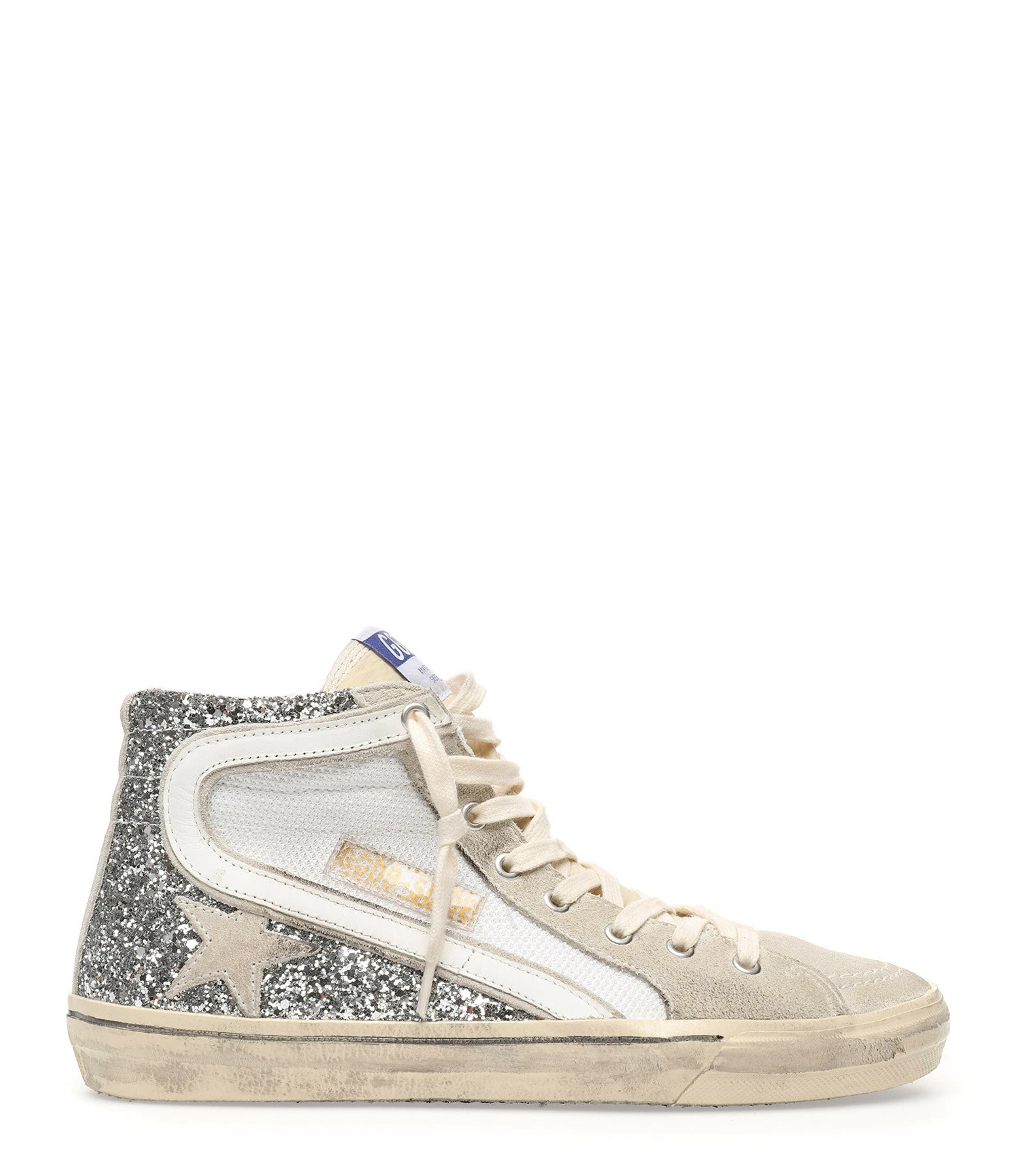 Baskets montantes en resille blanche et paillettes argentées. Virguyle en cuir lisse blanc. Empiècement étoile et languette en cuir suédé gris clair. Lacets blancs. Fermeture par zip sur le côté. Intérieur en cuir et en maille bouclette.