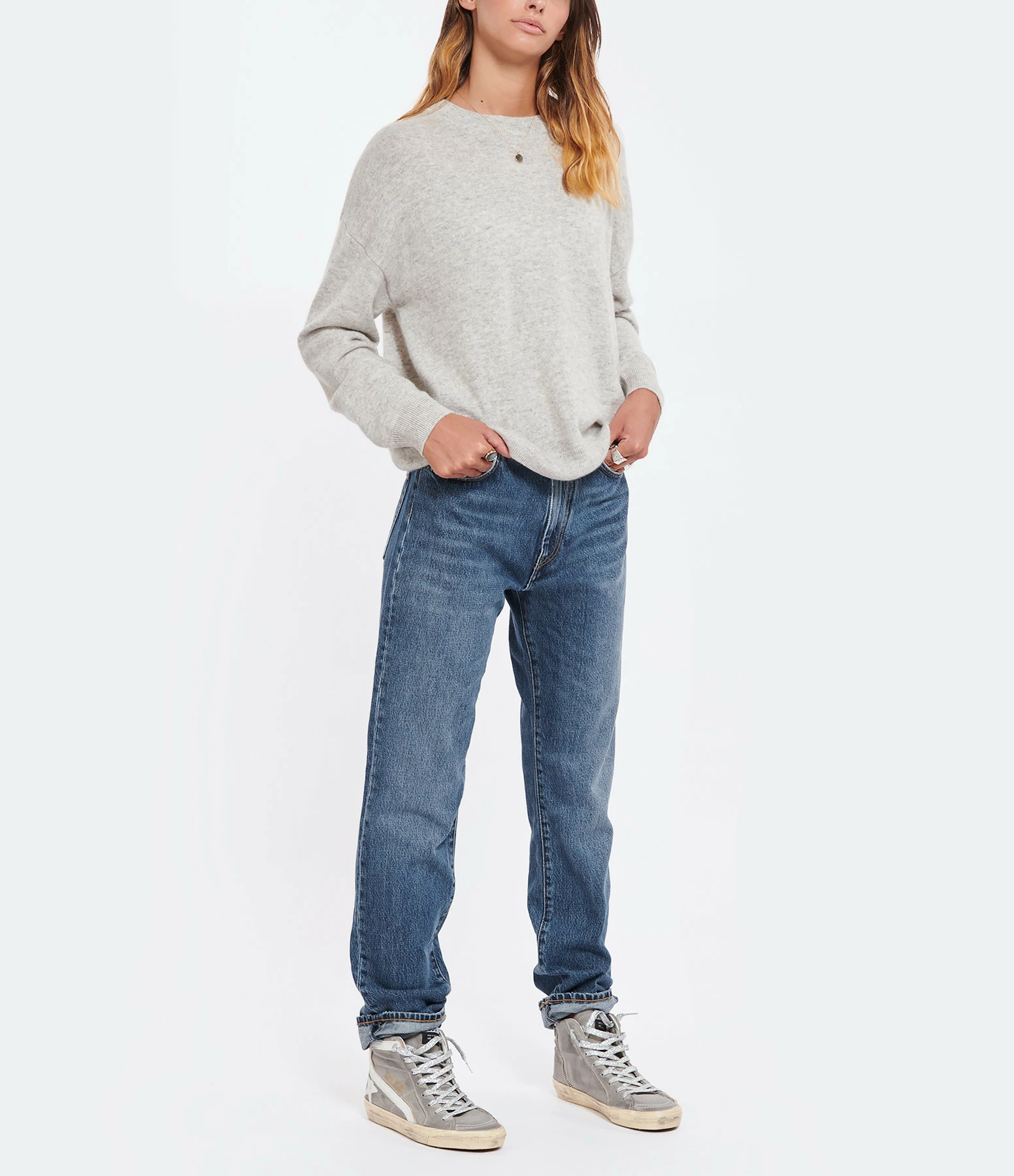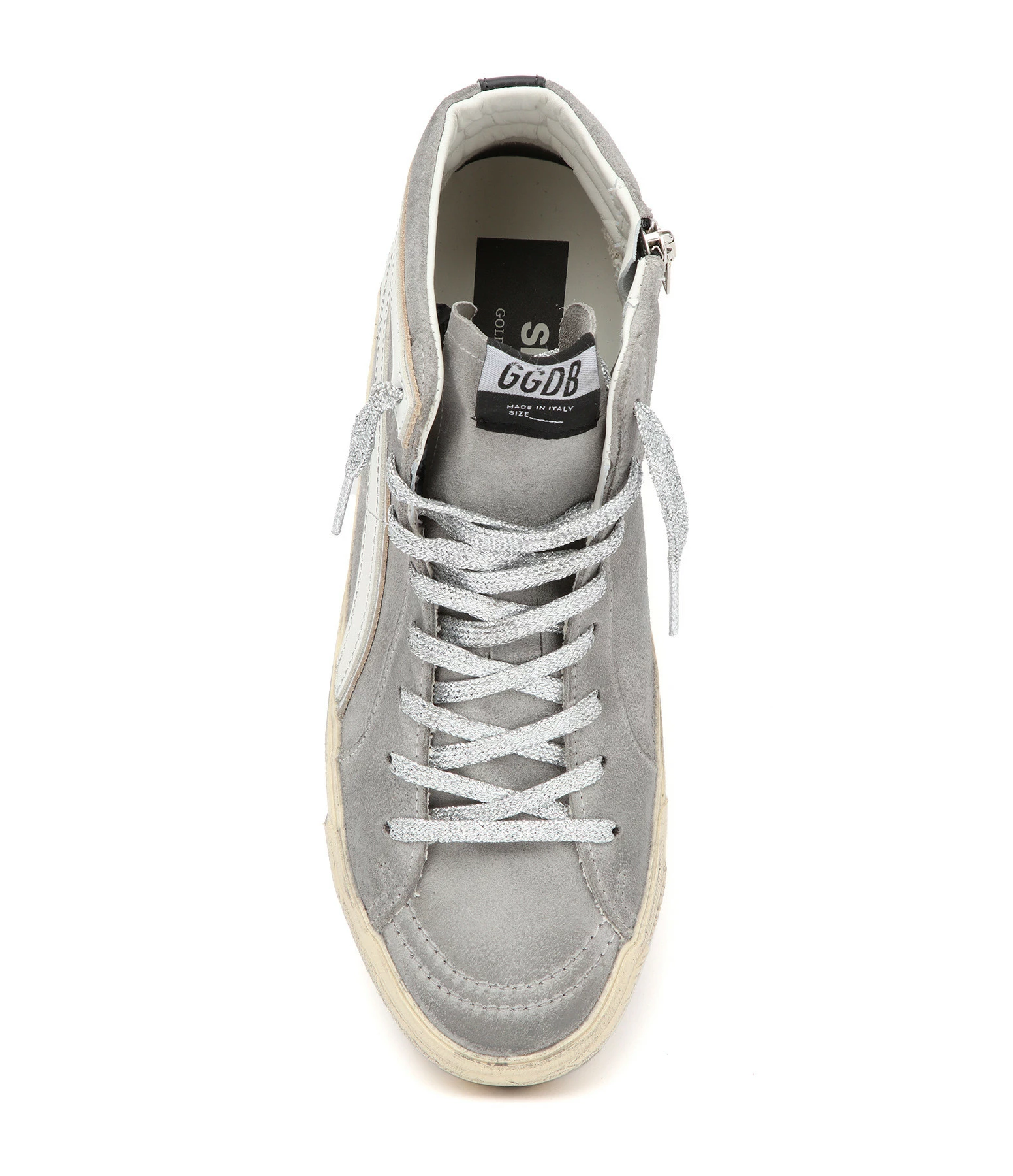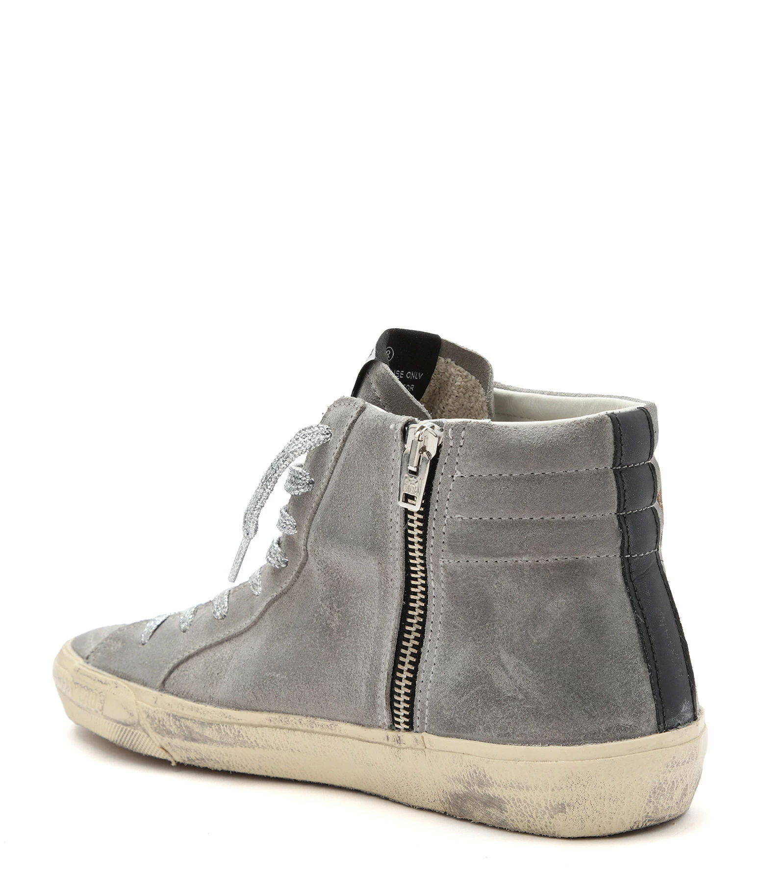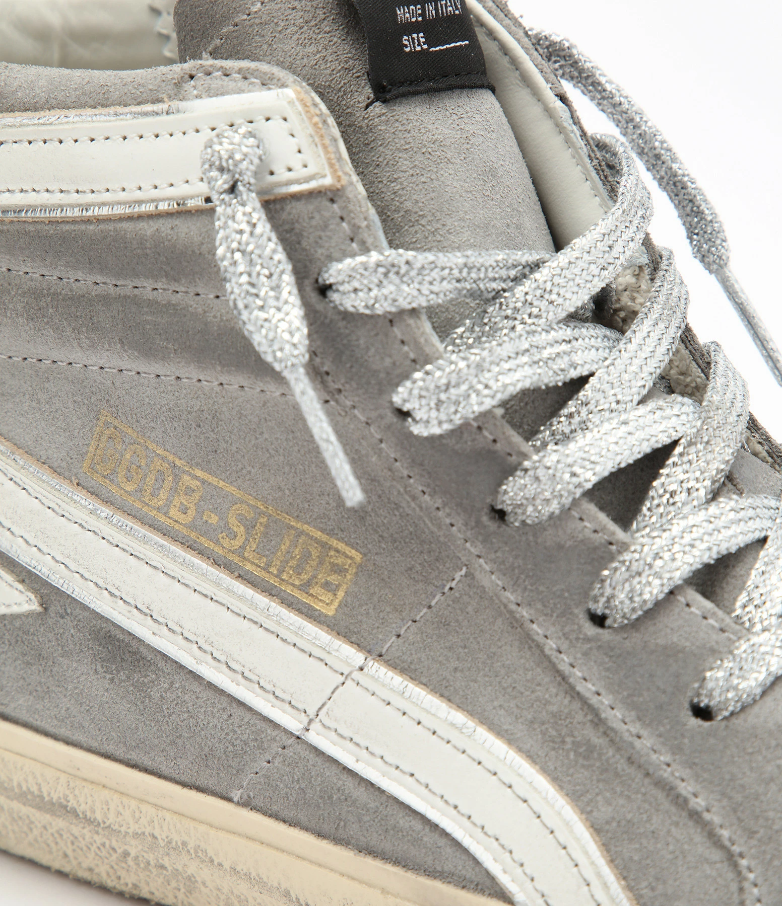 Baskets montantes en cuir suédé gris. Empiècement étoile et “slide” en cuir blanc. Fermeture par zip sur le côté. Intérieur en cuir et en maille bouclette.