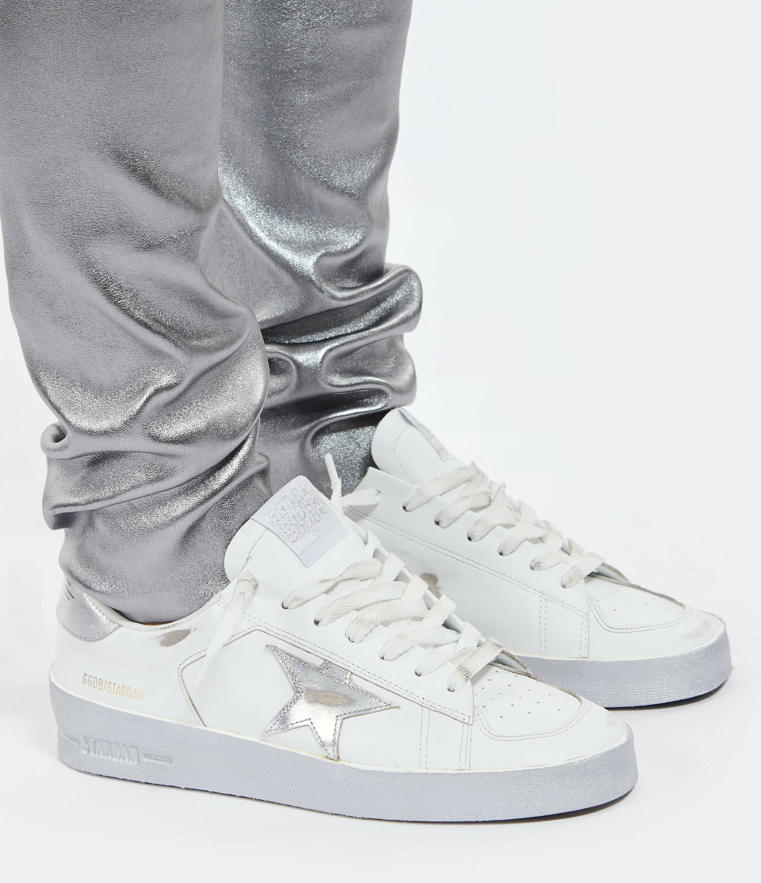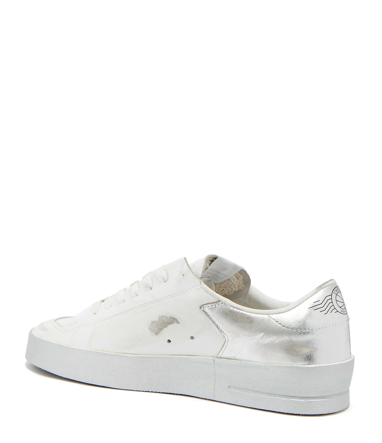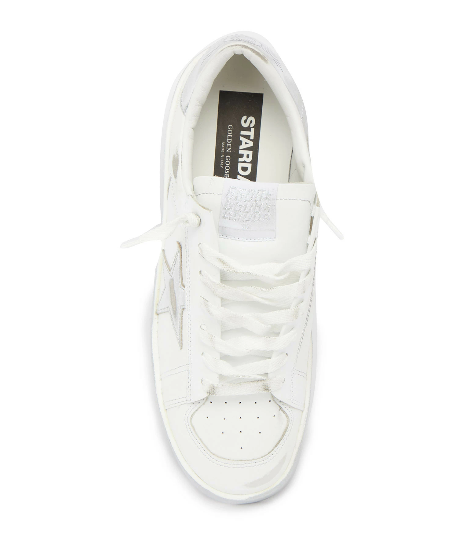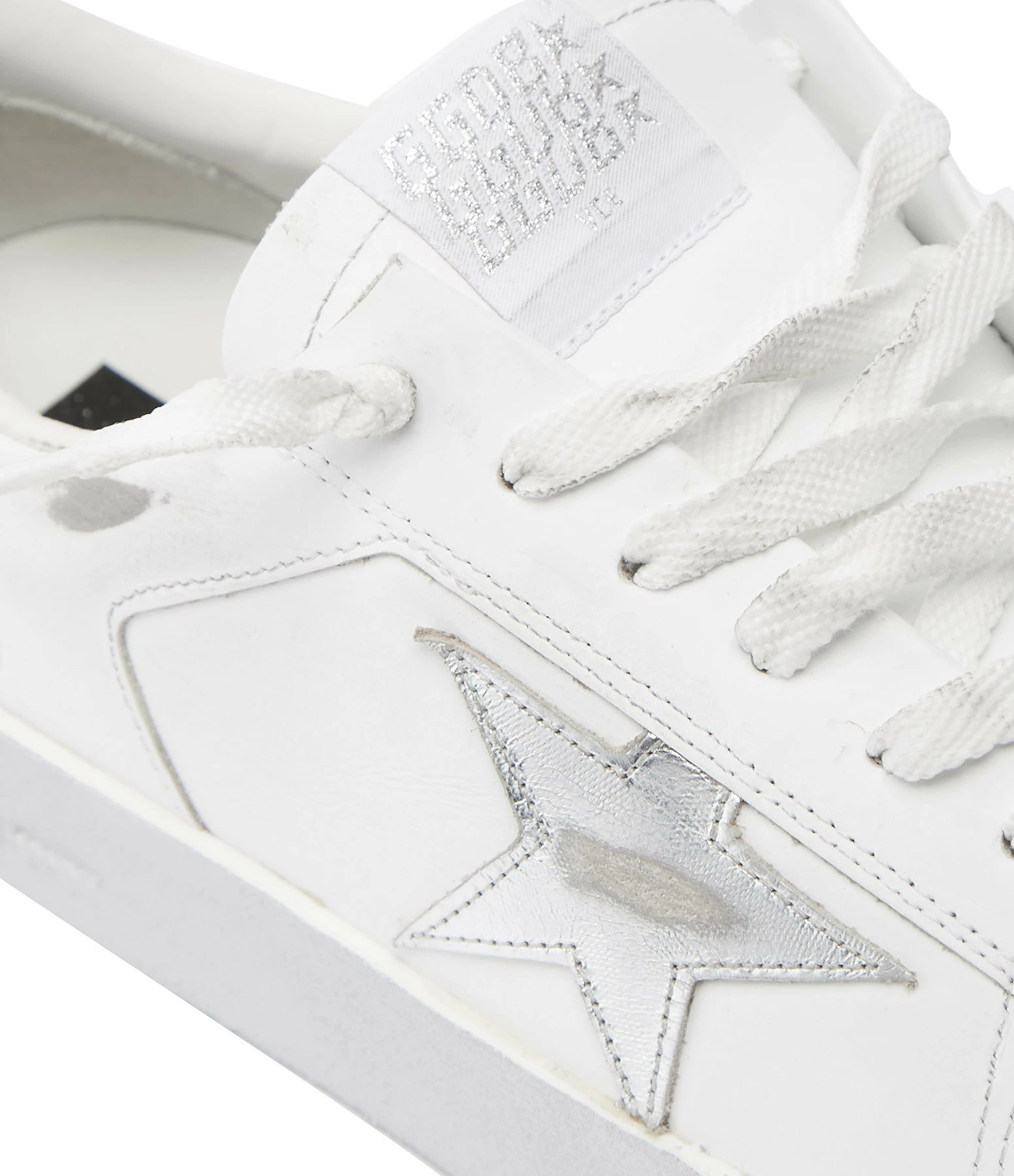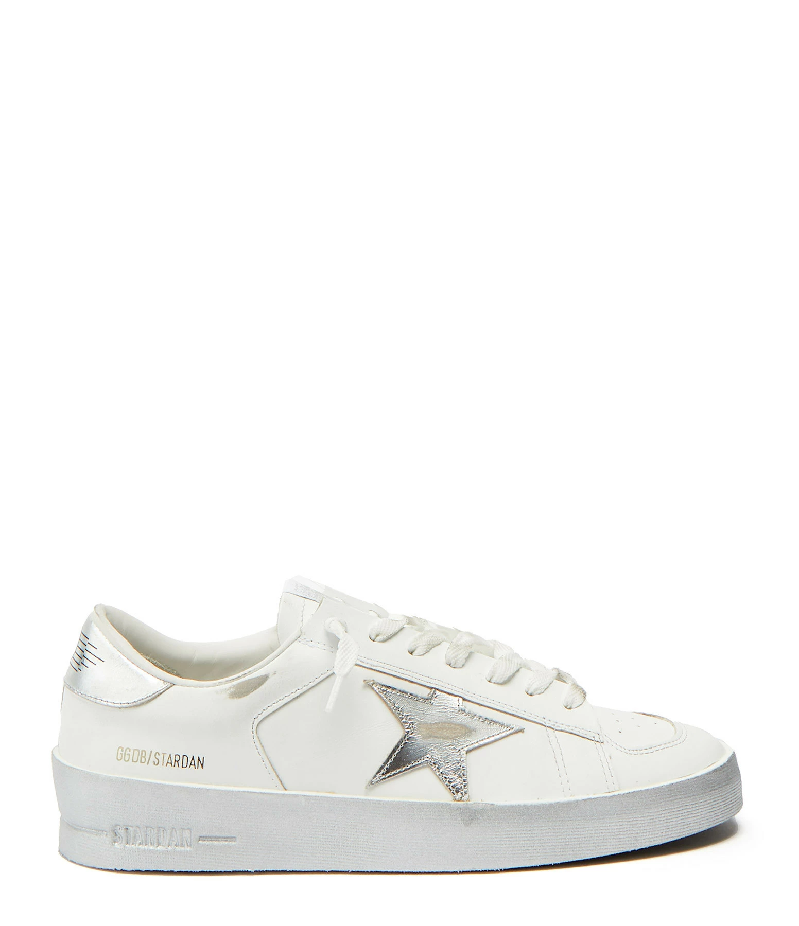 Baskets basses en cuir lisse blanc. Empiècement étoile en cuir argenté. Renfort talon en cuir lisse argenté avec logo “Stardan”. Inscription “STARDAN” sur la semelle extérieure droite et “GGDB/STARDAN” sur le côté extérieur du pied droit. Intérieur en cuir et maille bouclette.