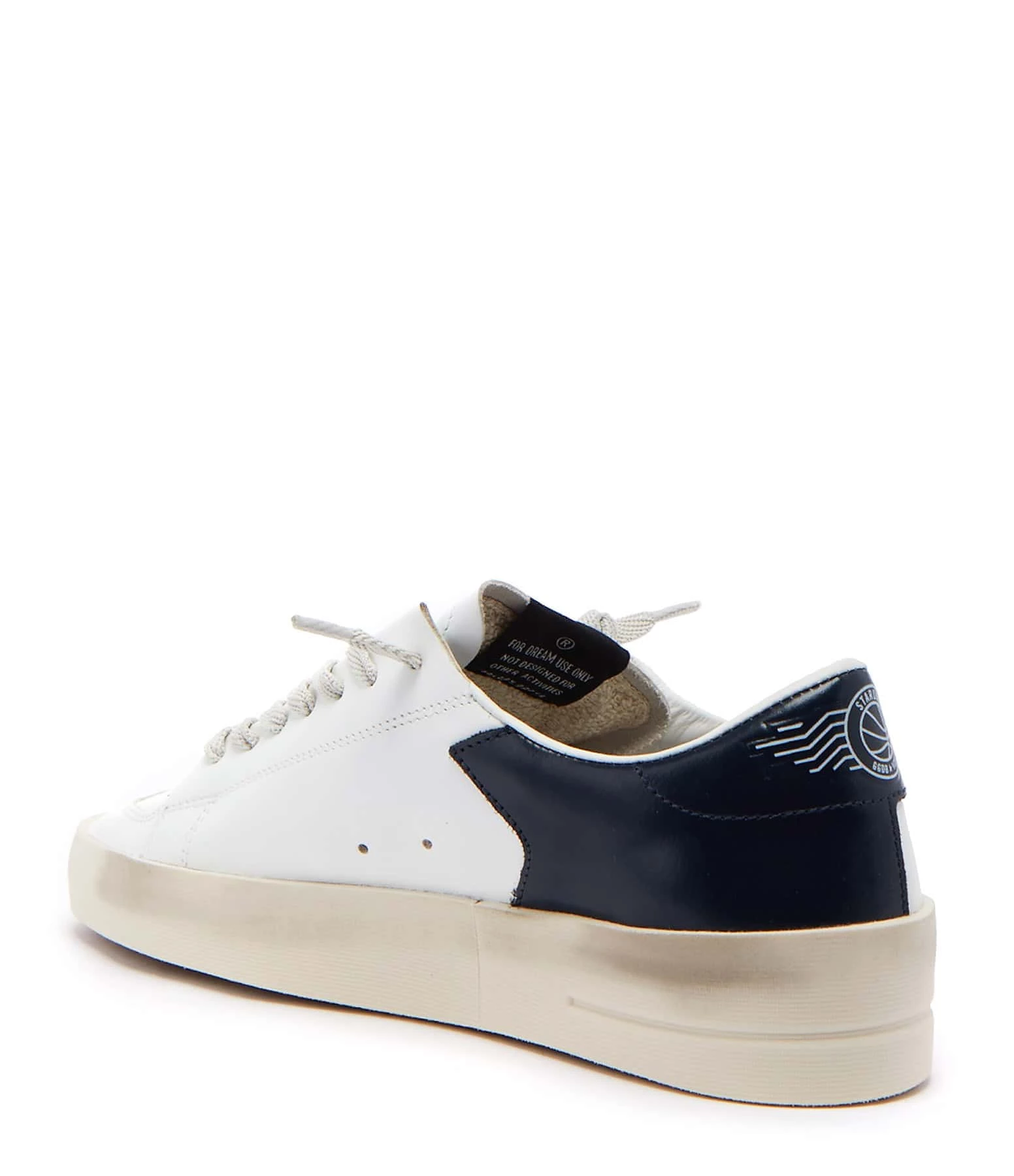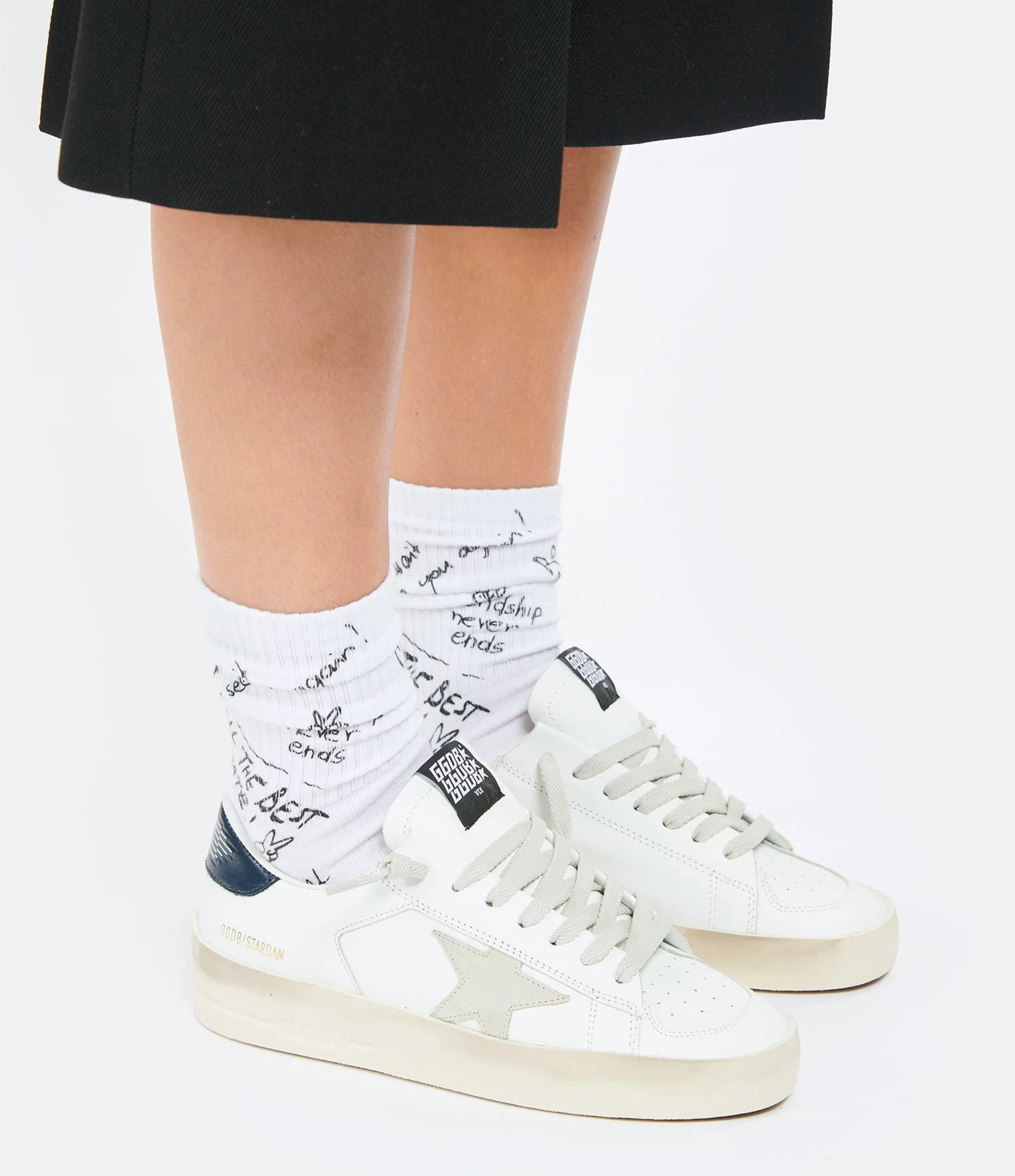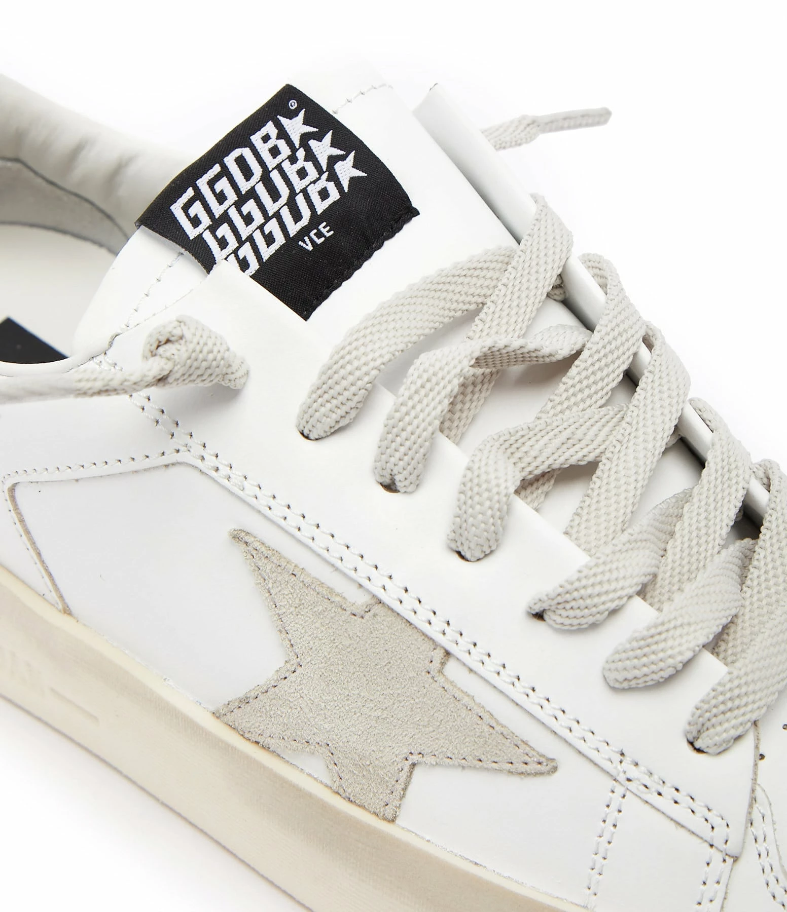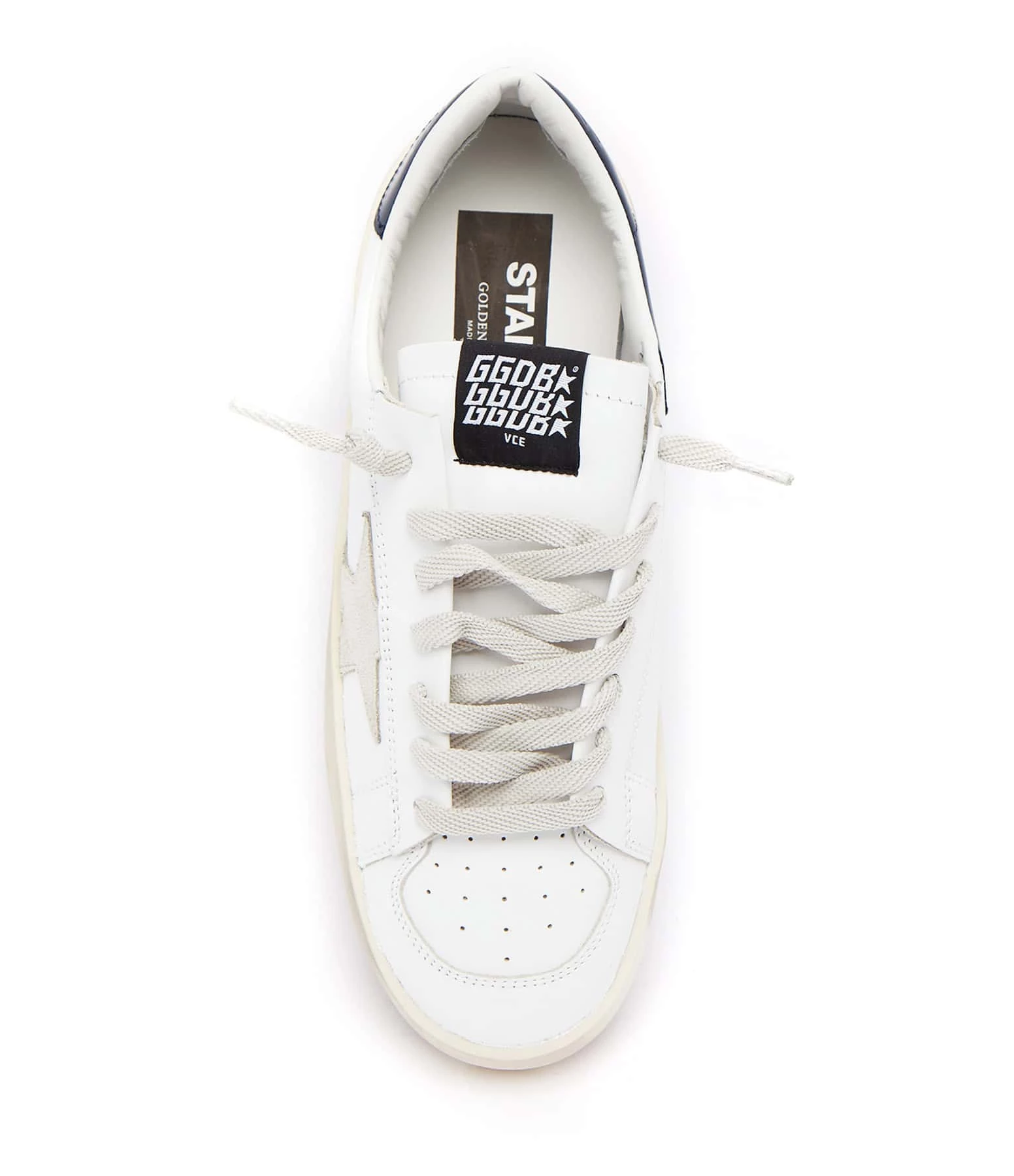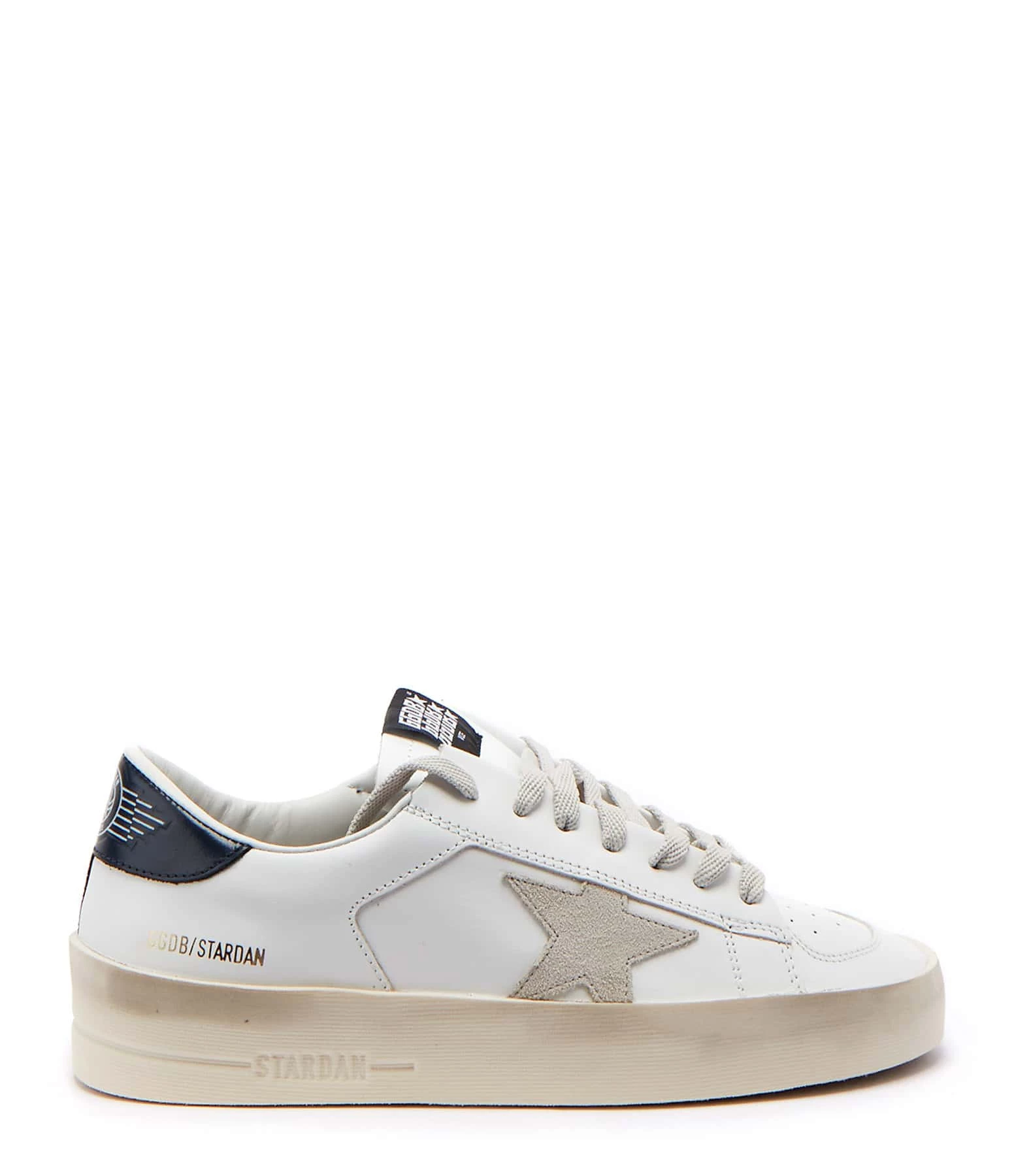 Baskets basses en cuir lisse blanc. Empiècement étoile en cuir suédé gris. Renfort talon en cuir lisse noir avec logo “Stardan”. Inscription “STARDAN” sur la semelle extérieure droite et “GGDB/STARDAN” sur le côté extérieur du pied droit. Intérieur en cuir et maille bouclette.