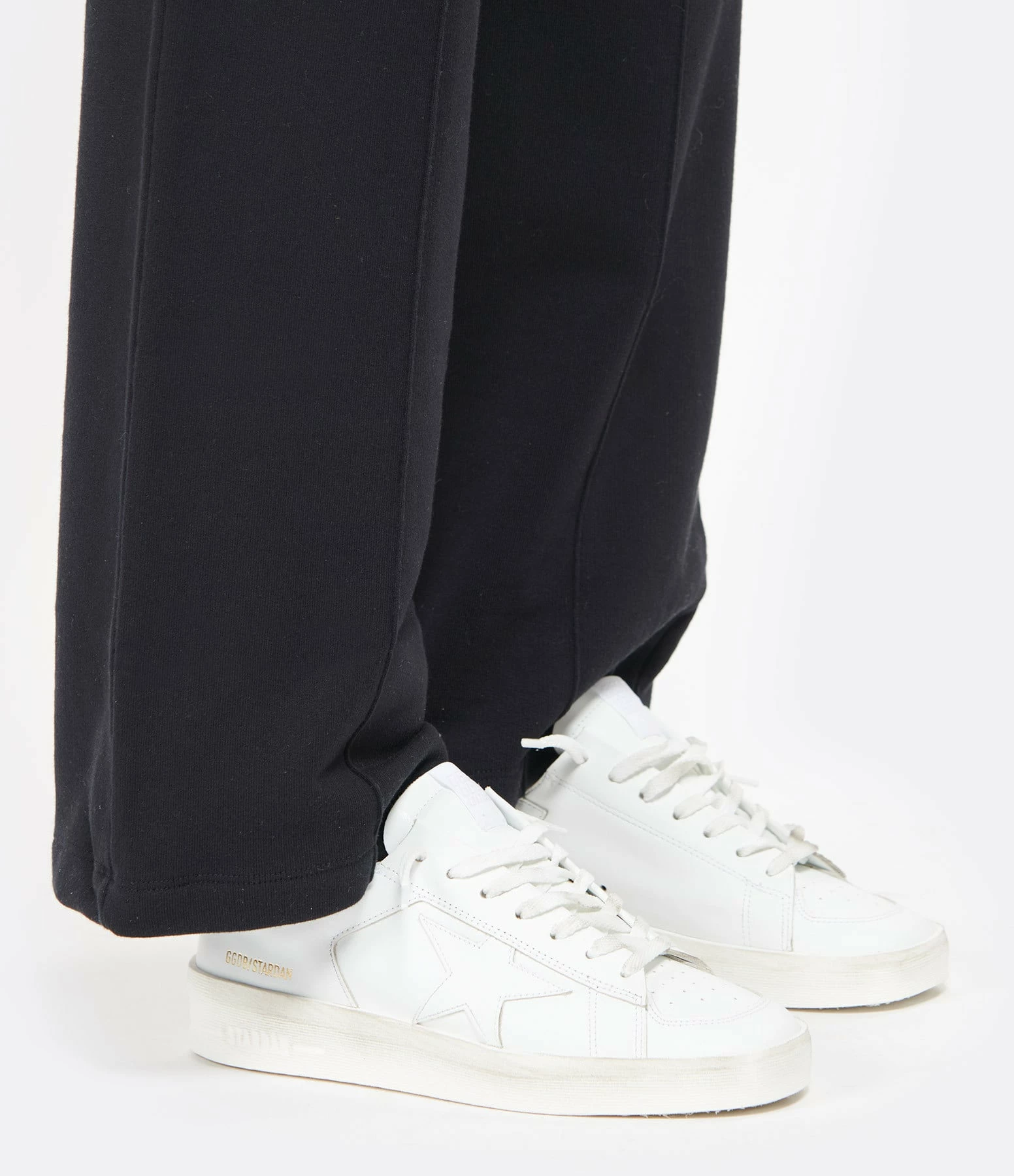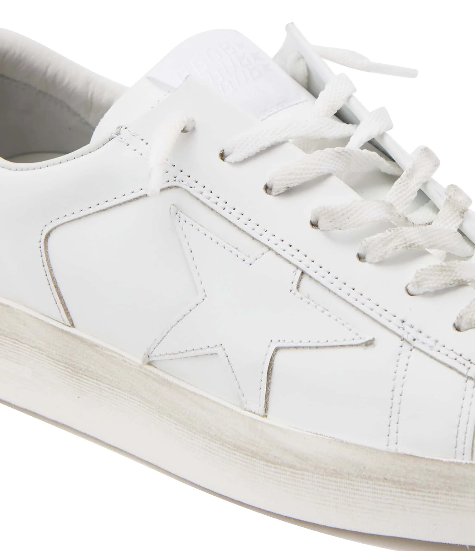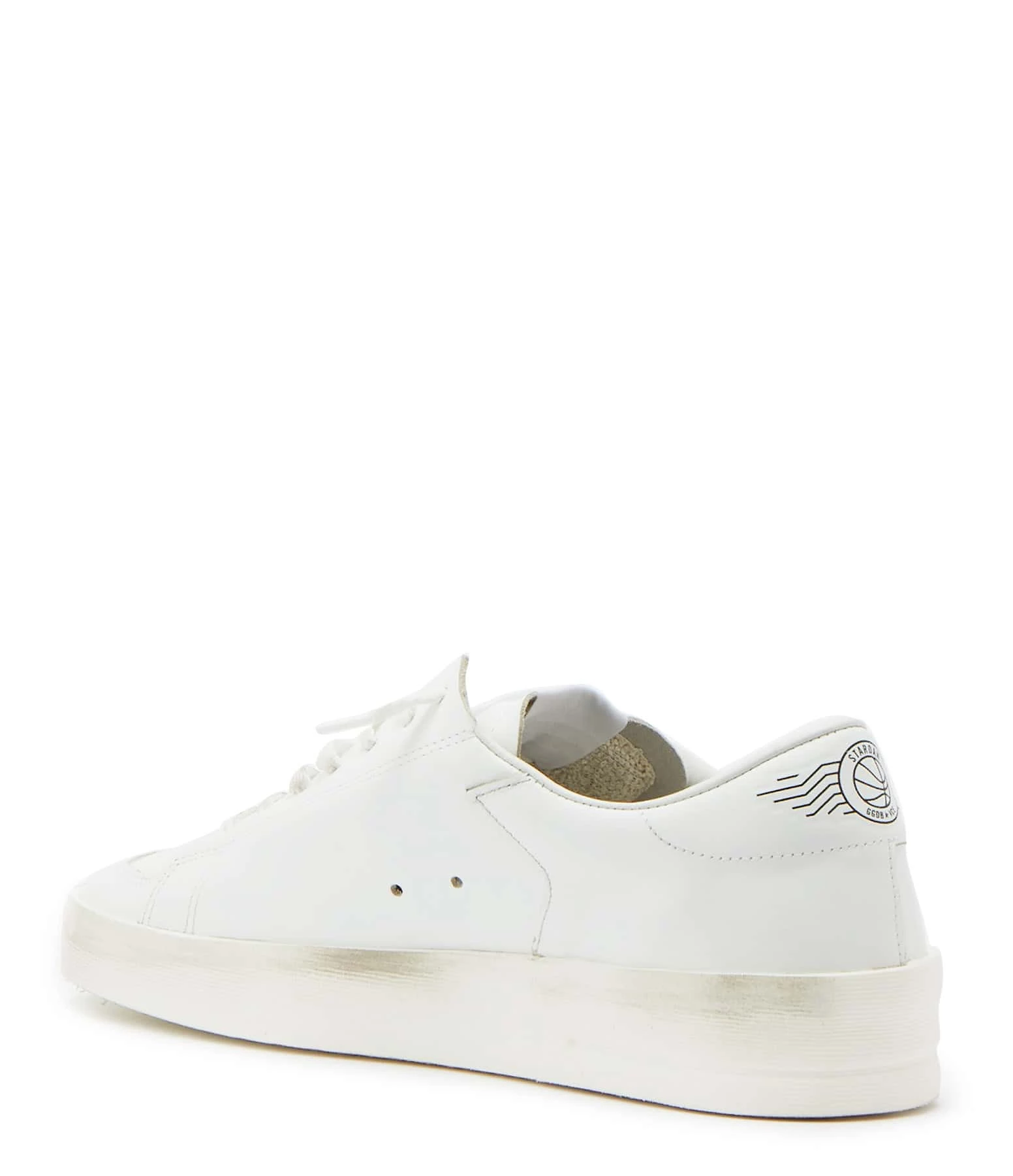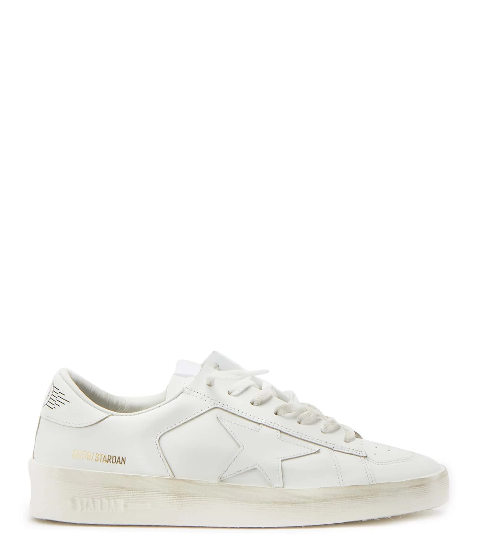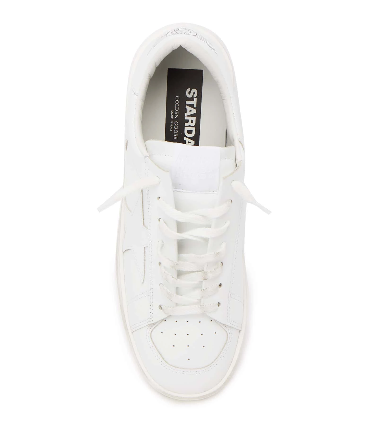 Baskets basses en cuir lisse blanc. Empiècement étoile. Renfort talon avec logo “Stardan”. Inscription “STARDAN” sur la semelle extérieure droite et “GGDB/STARDAN” sur le côté extérieur du pied droit. Intérieur en cuir et maille bouclette.