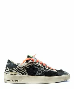 Baskets basses en cuir pony zébré. Empiècement étoile en cuir lisse blanc avec effet filet au dessus. Renfort talon en cuir lisse noir avec logo “Stardan”. Inscription “STARDAN” sur la semelle extérieure droite et “GGDB/STARDAN” sur le côté extérieur du pied droit. Lacets roses fluos. Intérieur en cuir et maille bouclette.
