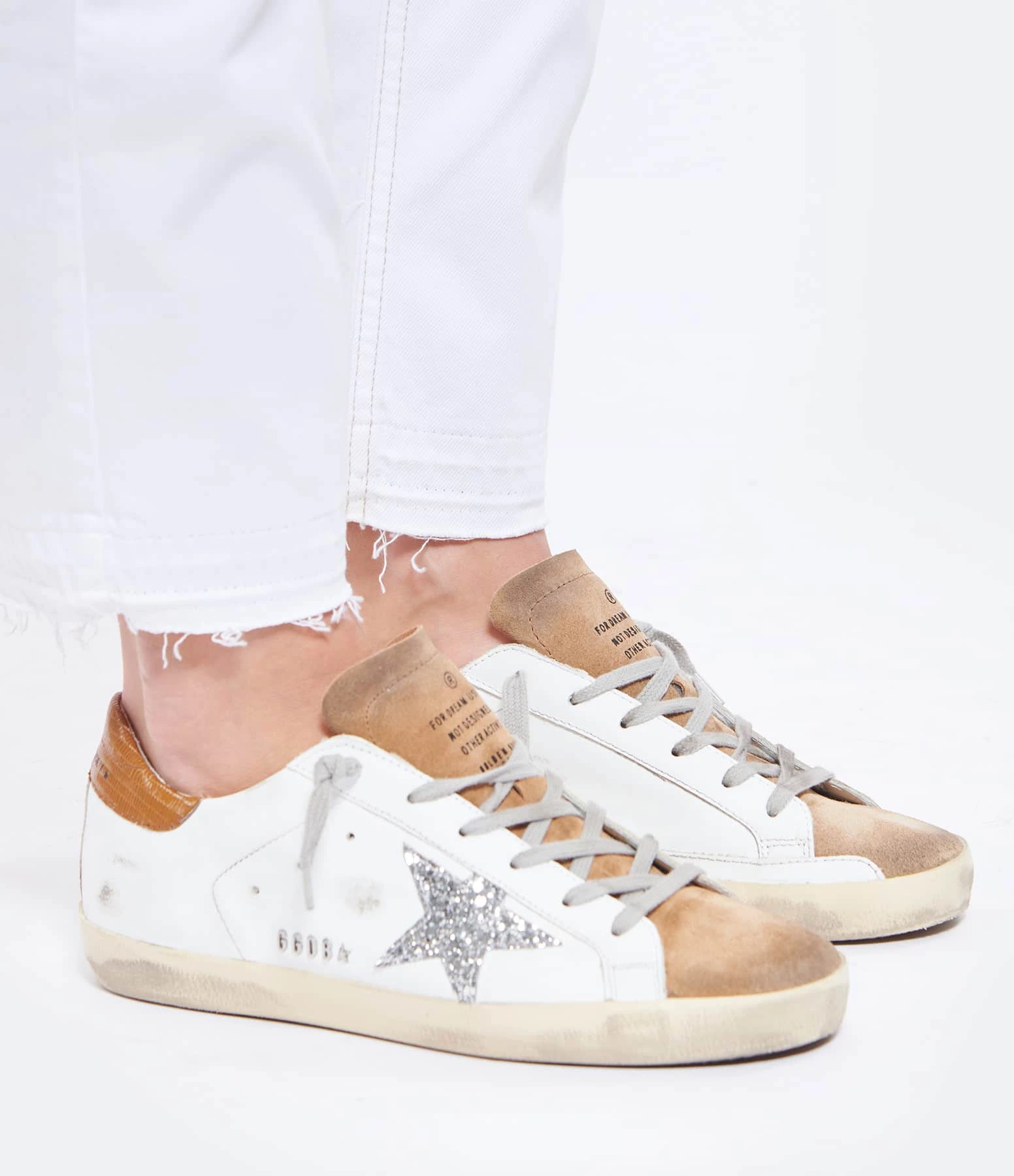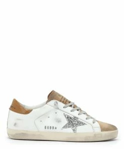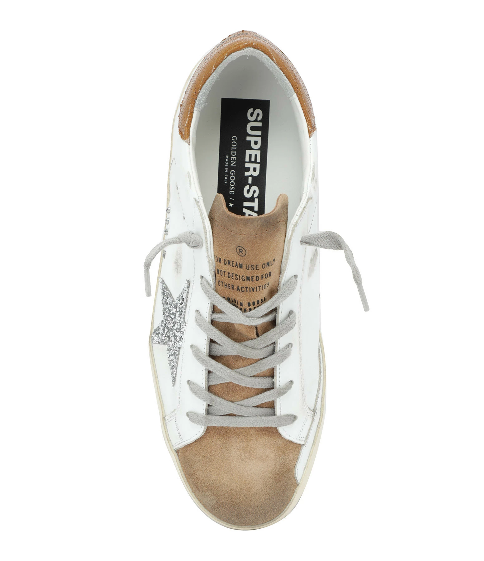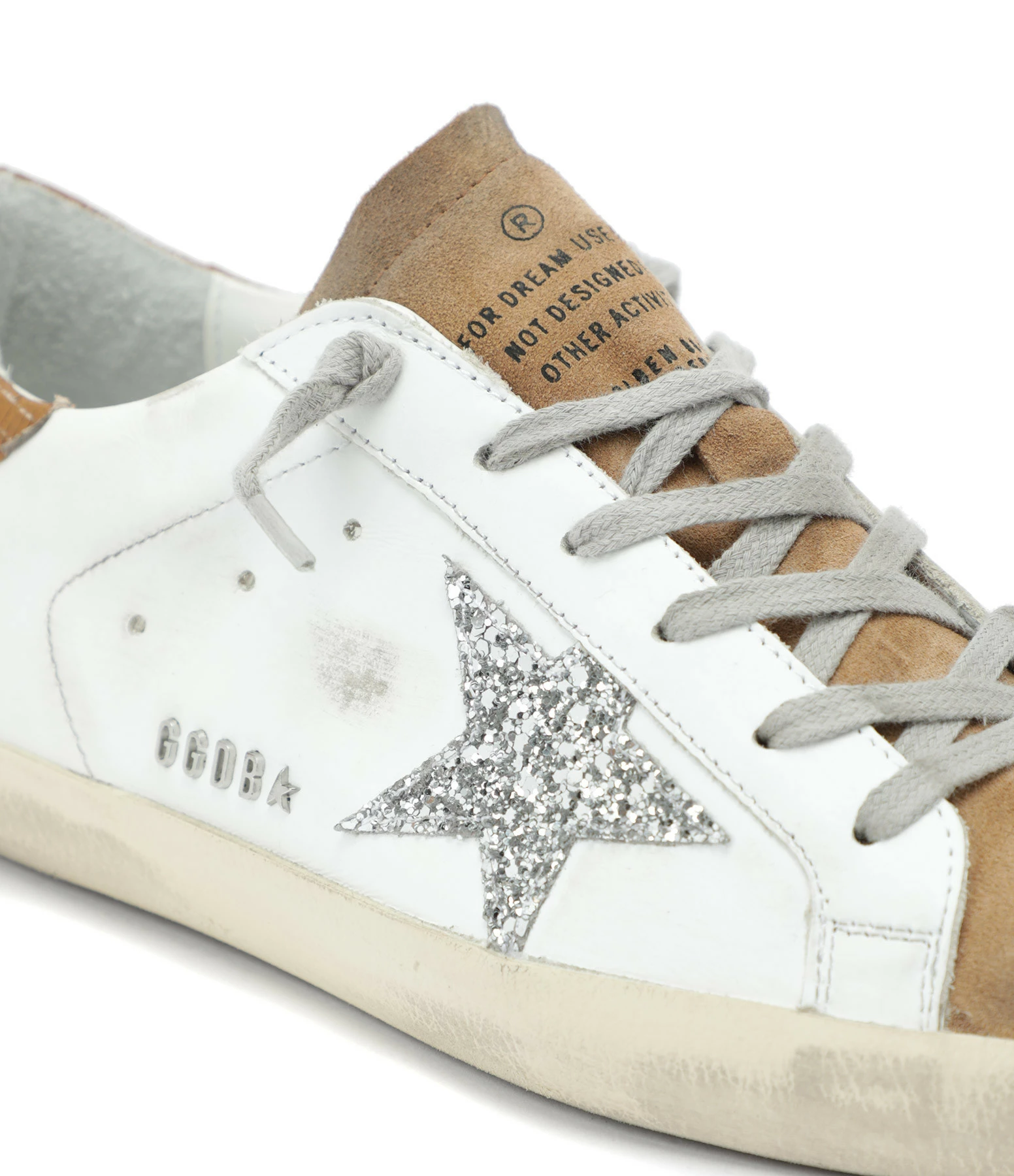 Baskets basses en cuir lisse blanc. Empiècement étoile en paillettes argentées. Renfort talon en cuir marron. Languette en cuir suédé taupe. Lacets gris. Intérieur en maille bouclette et cuir. Inscription “GGDB/SSTAR” sur le côté extérieur.