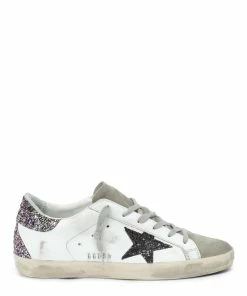 Baskets basses en cuir lisse blanc. Empiècement étoile en paillettes noires. Renfort talon en paillettes noires et violettes. Lacets gris. Intérieur en cuir et maille bouclette. Inscription “GGDB/SSTAR” sur le côté extérieur.