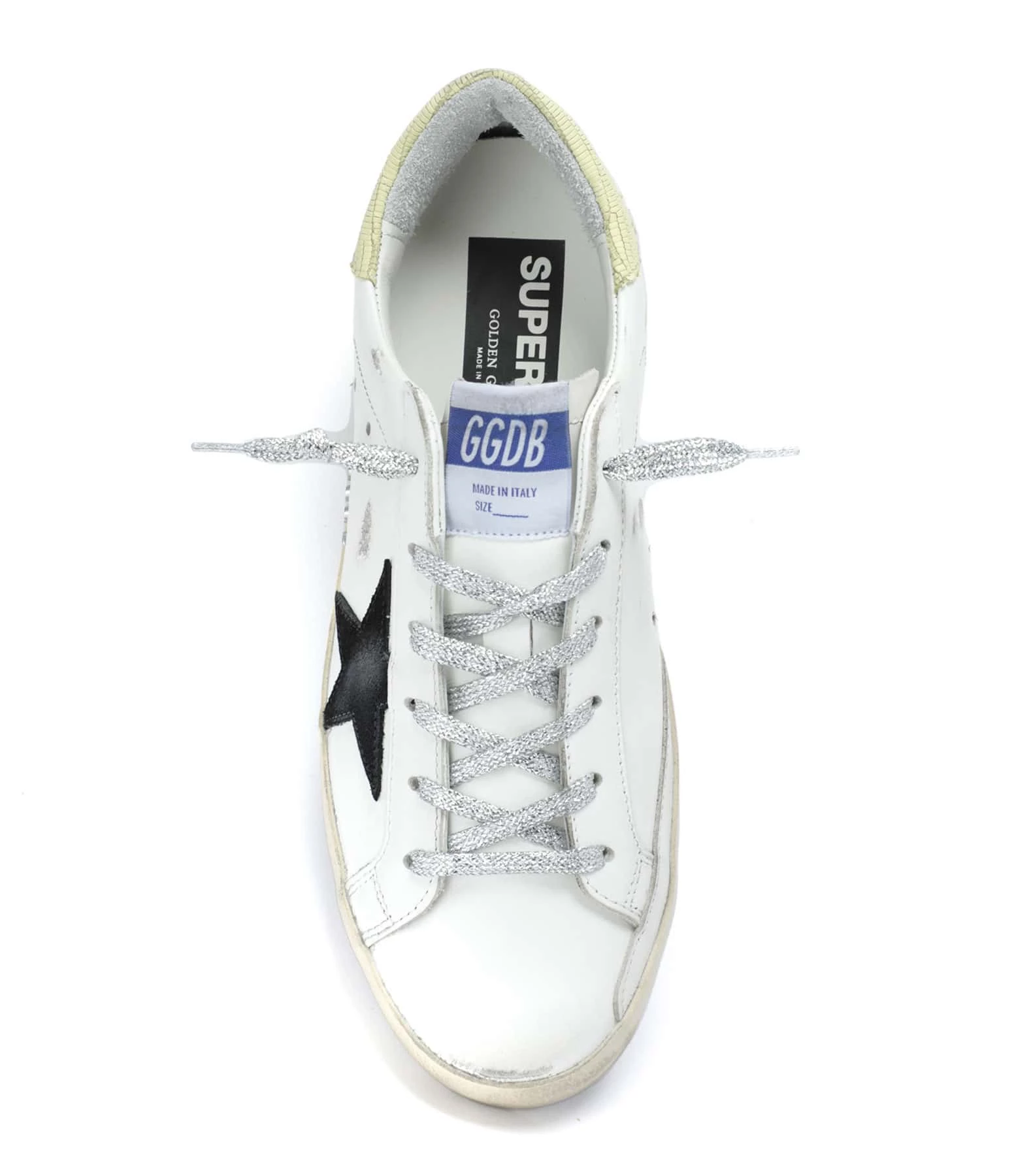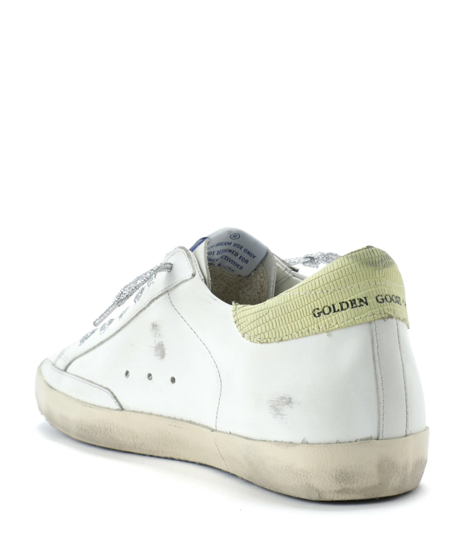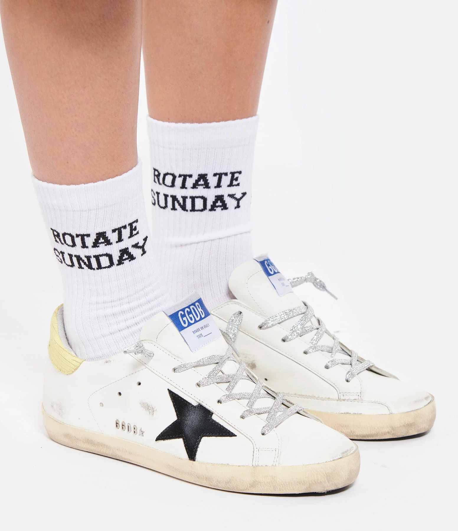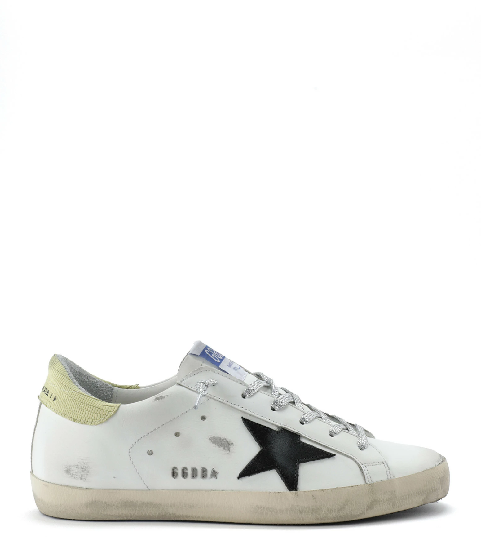 Baskets basses en cuir lisse blanc. Empiècement étoile en cuir suédé noir. Renfort talon en cuir effet croco jaune. Lacets à paillettes argentées. Intérieur en maille bouclette et cuir. Inscription “GGDB/SSTAR” sur le côté extérieur.