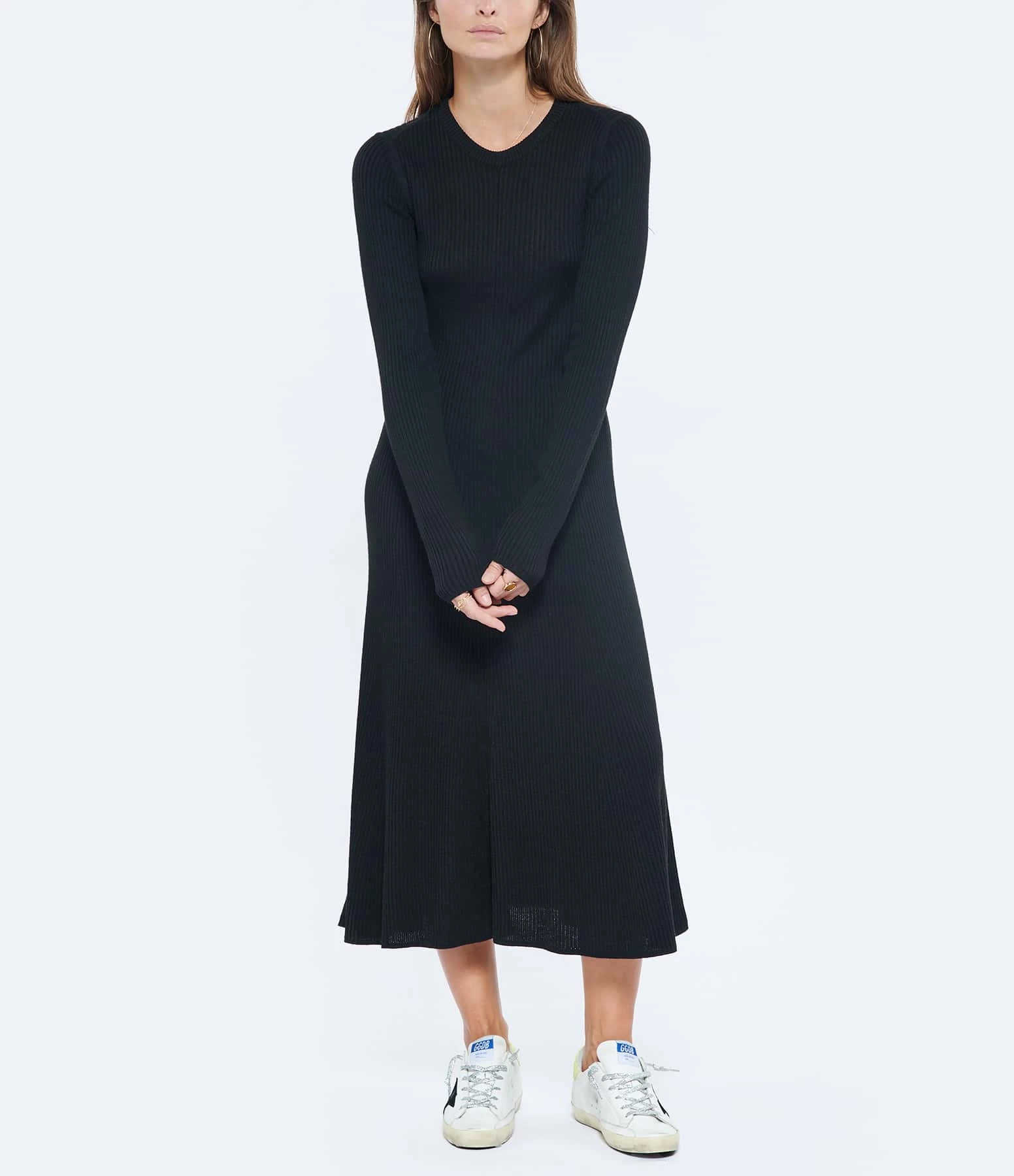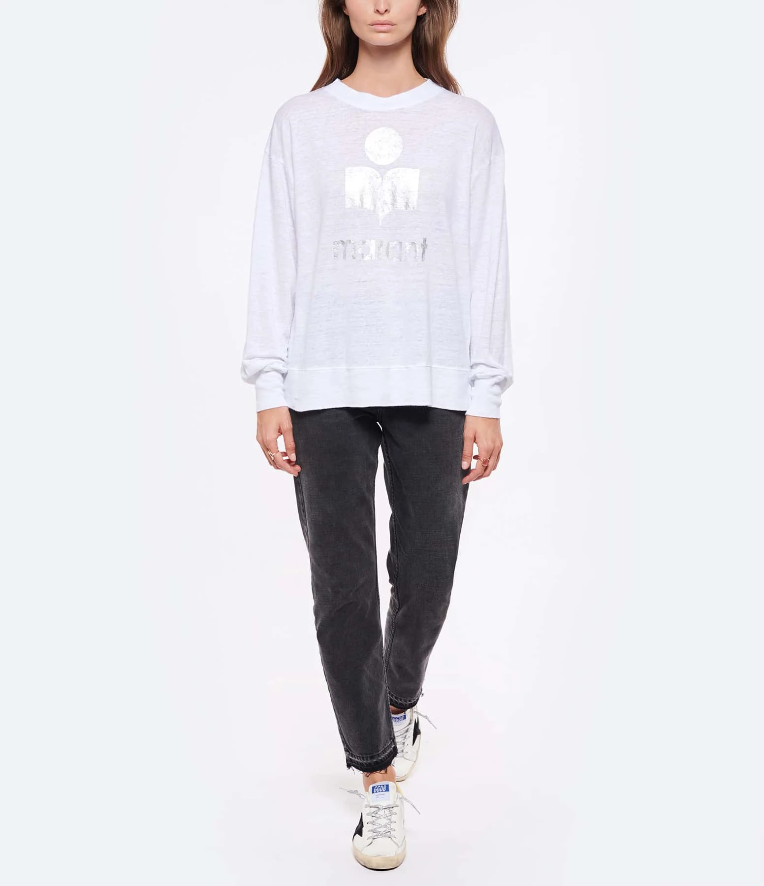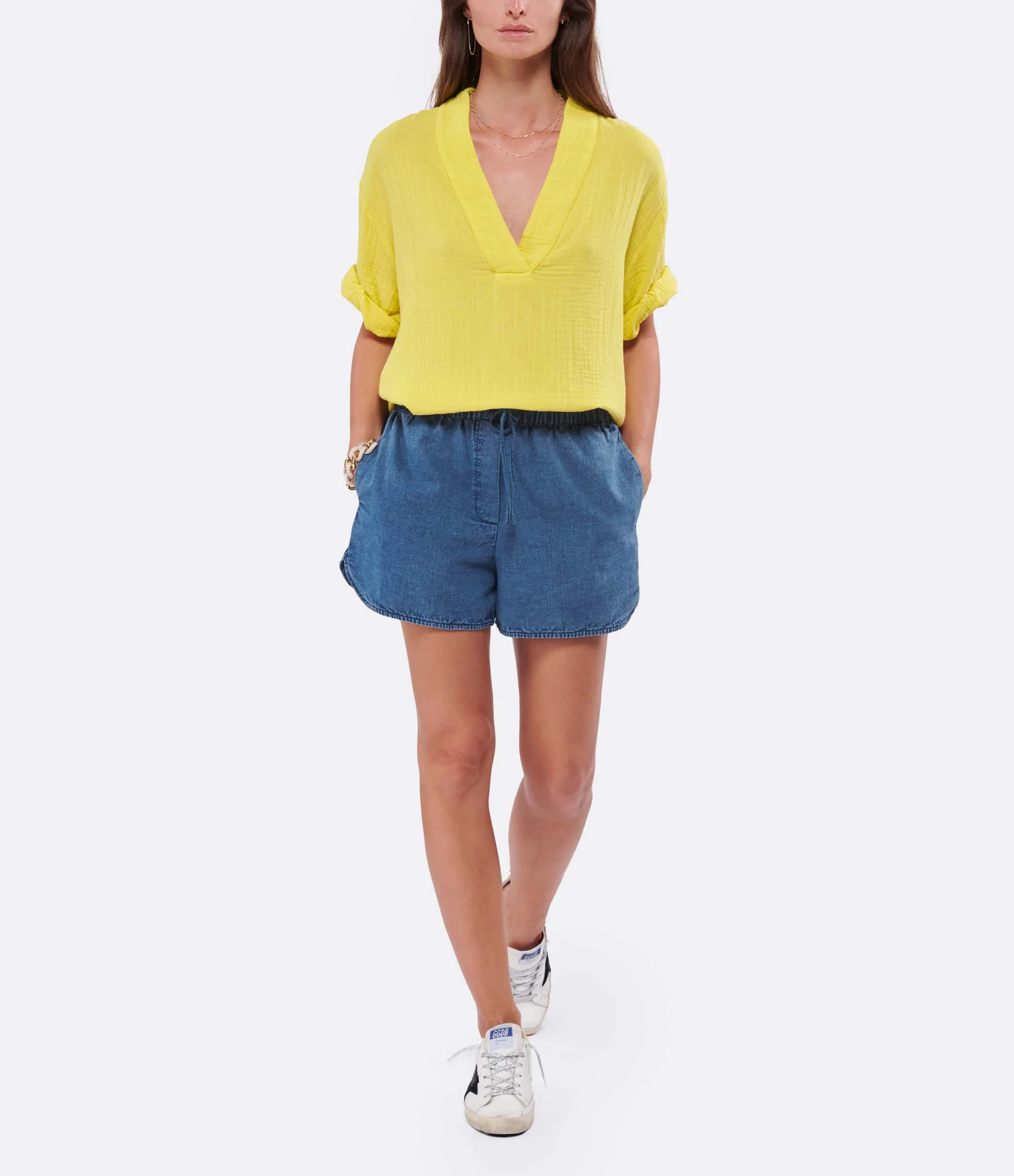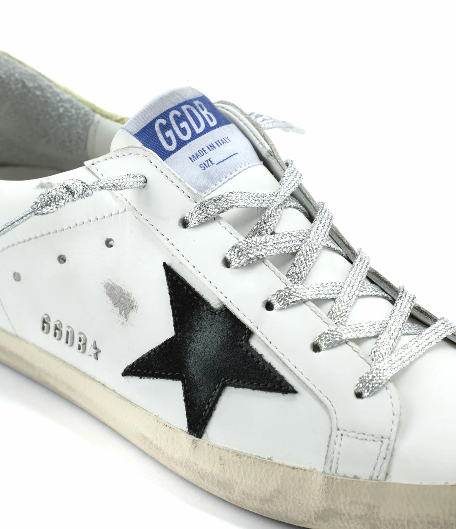 Baskets basses en cuir lisse blanc. Empiècement étoile en cuir suédé noir. Renfort talon en cuir effet croco jaune. Lacets à paillettes argentées. Intérieur en maille bouclette et cuir. Inscription “GGDB/SSTAR” sur le côté extérieur.