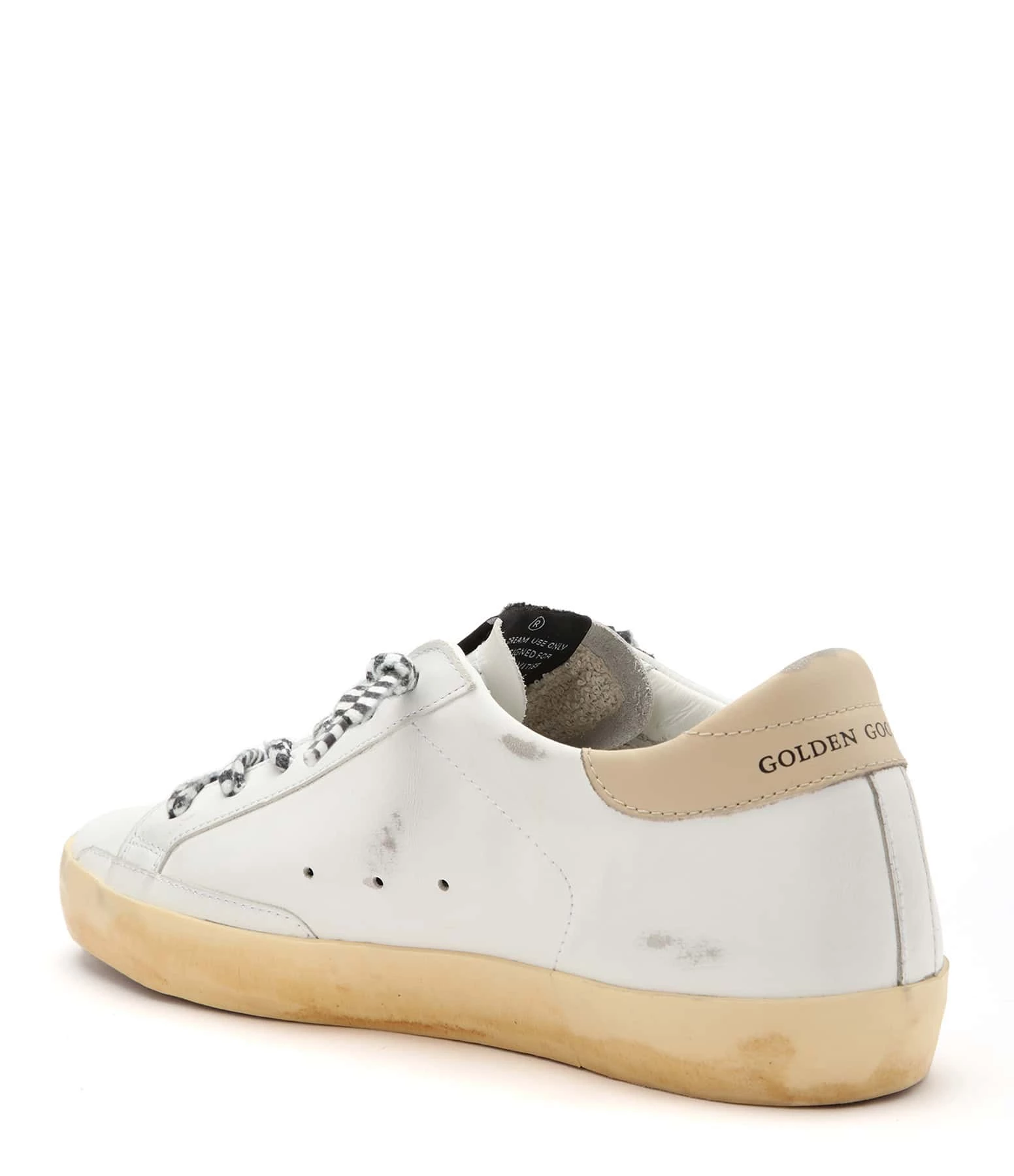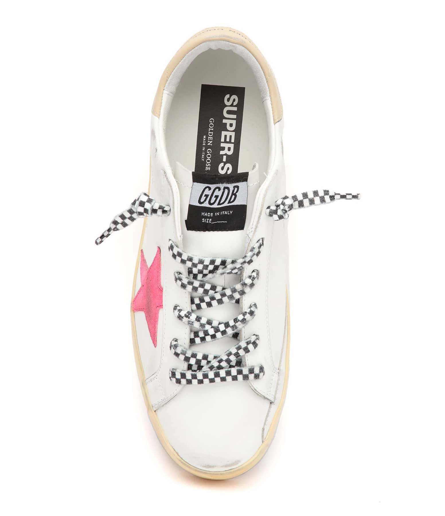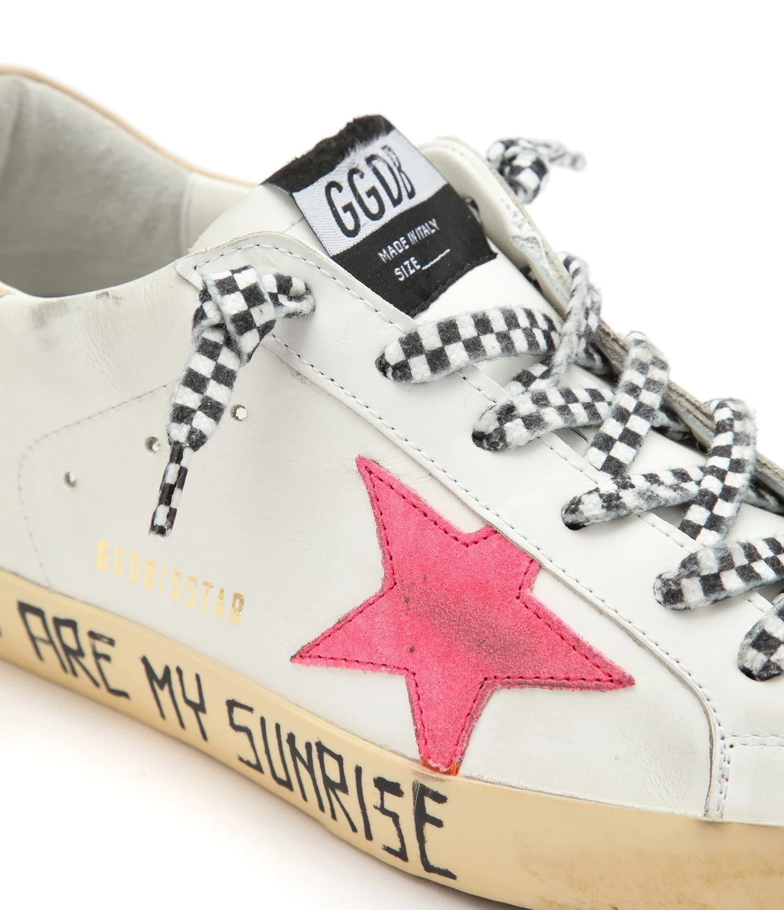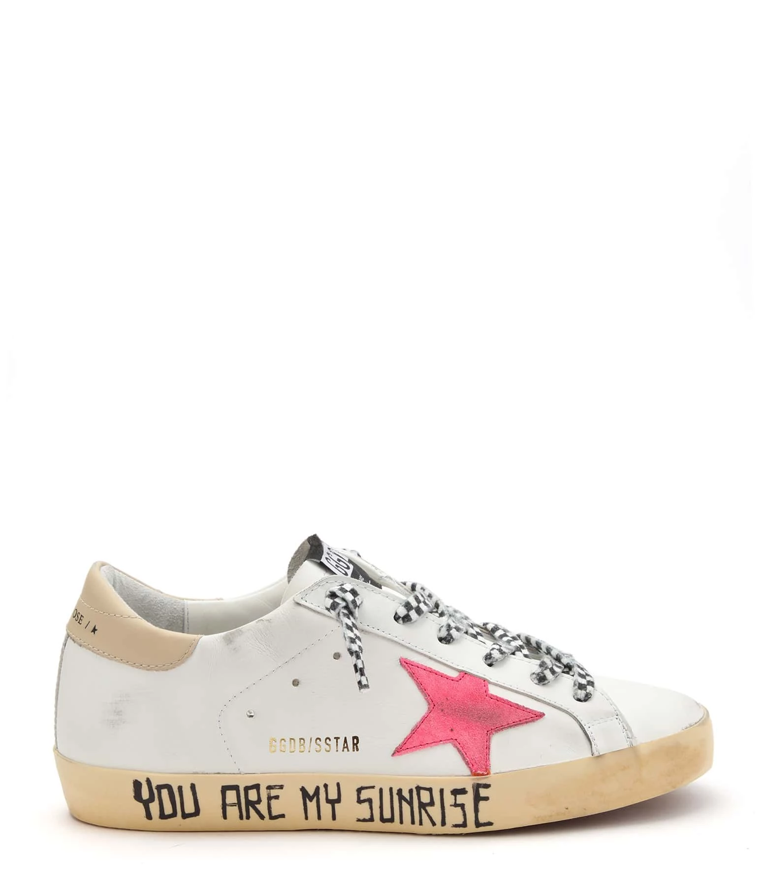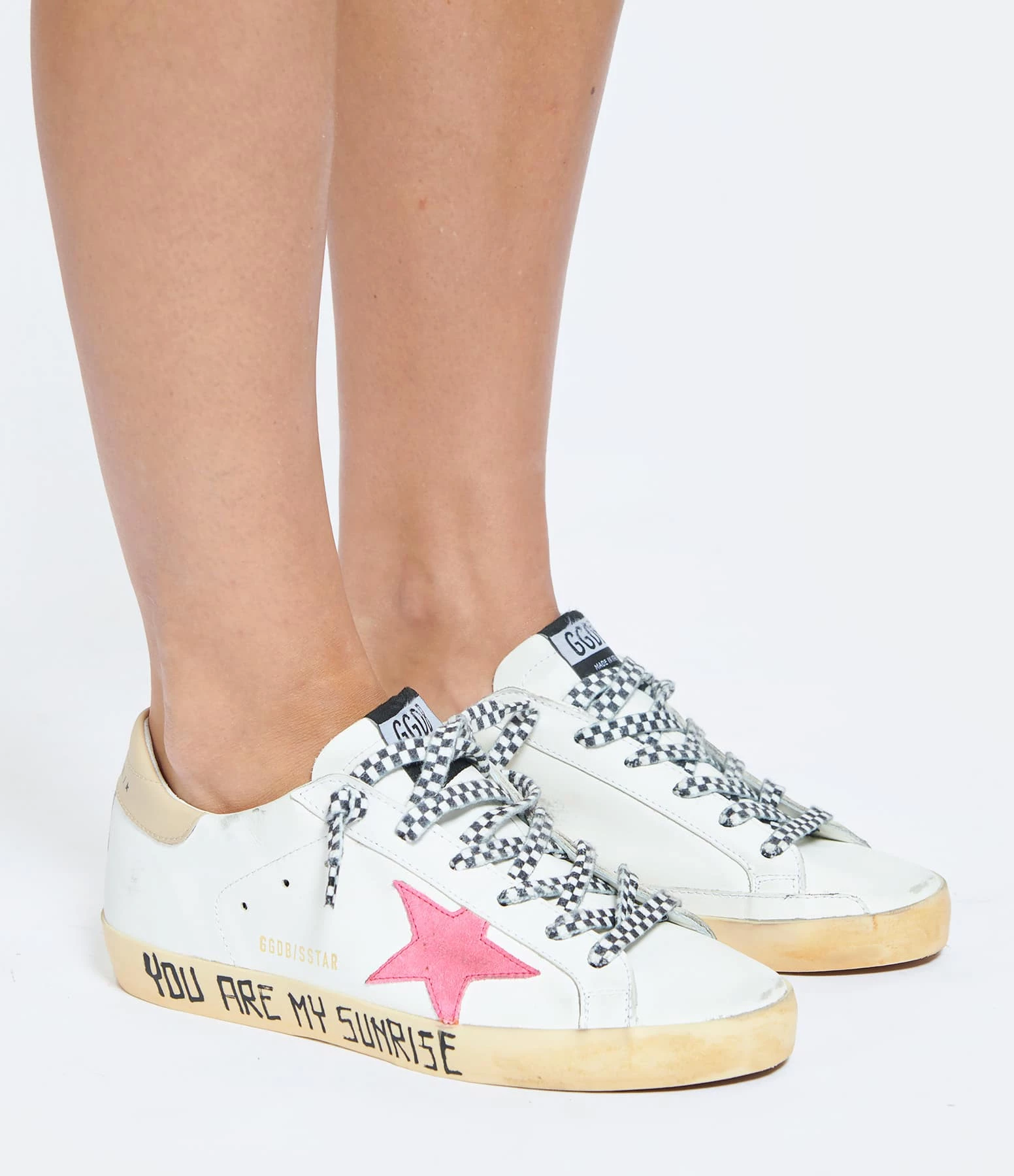 Baskets basses en cuir lisse blanc avec empiècement étoile rouge fluo et renfort talon en cuir beige. Inscription “YOU ARE MY SUNRISE” sur la semelle. Lacets à damiers. Intérieur en cuir et en maille bouclette.