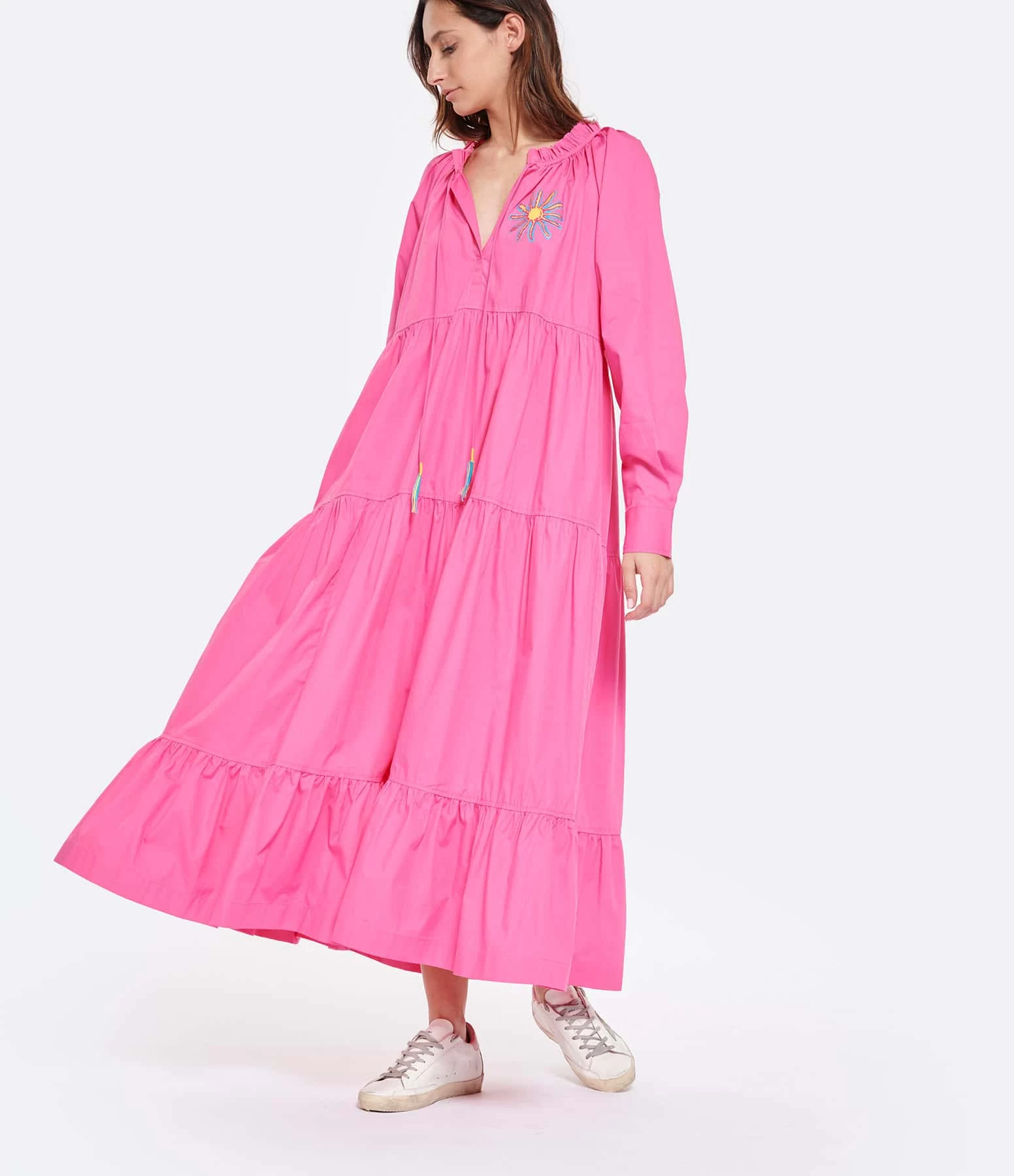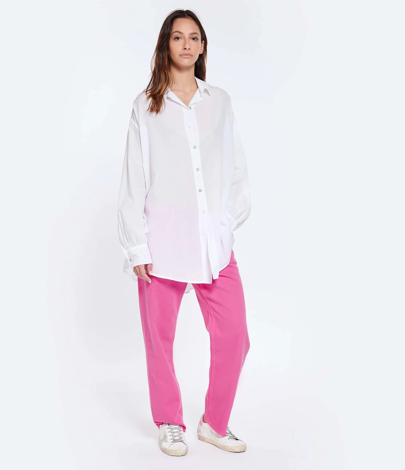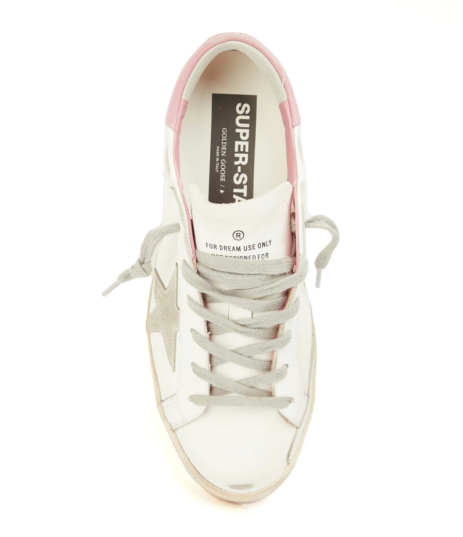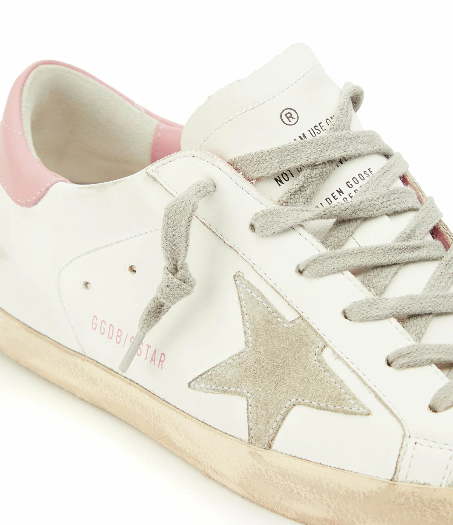 Baskets basses en cuir lisse blanc. Empiècement étoile en cuir suédé gris. Renfort talon en cuir lisse rose. Lacets gris. Intérieur en maille bouclette et cuir. Inscription “GGDB/SSTAR” sur le côté extérieur.
