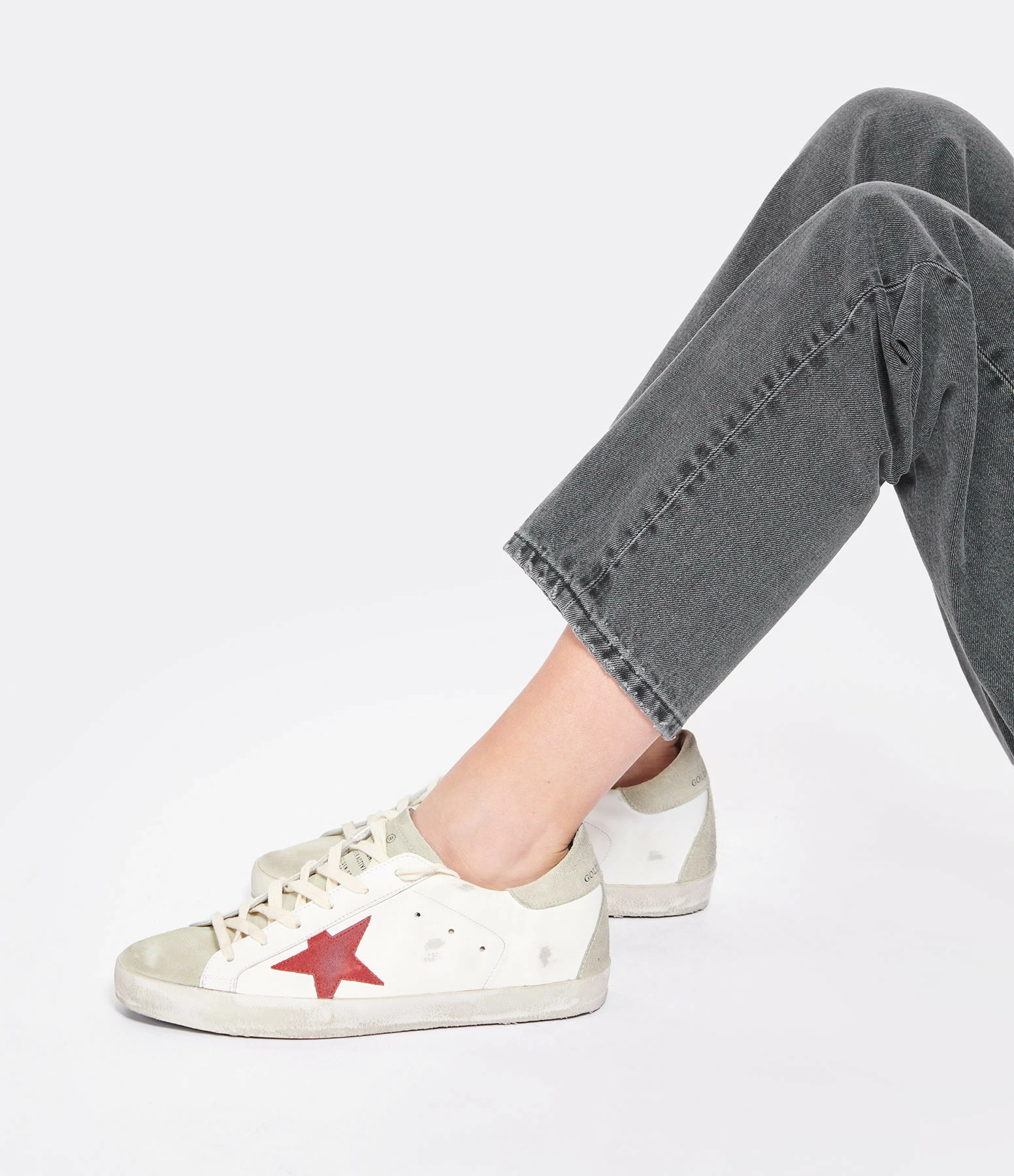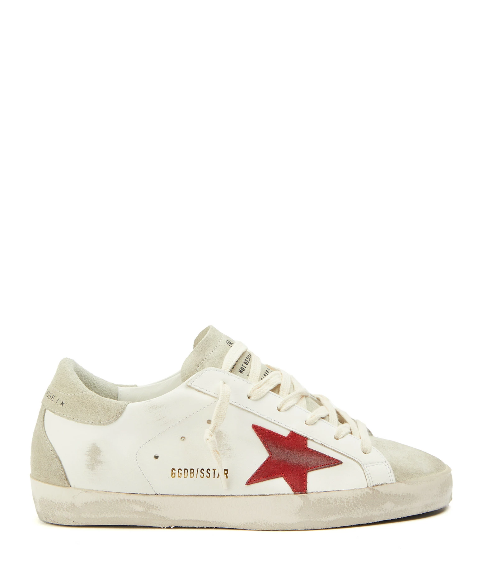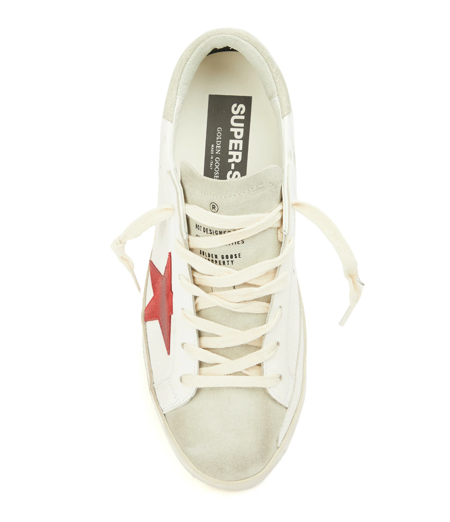 Baskets basses en cuir lisse blanc entièrement. Empiècement étoile en cuir suédé rouge. Renfort talon en cuir suédé gris. Intérieur en cuir et maille bouclette.