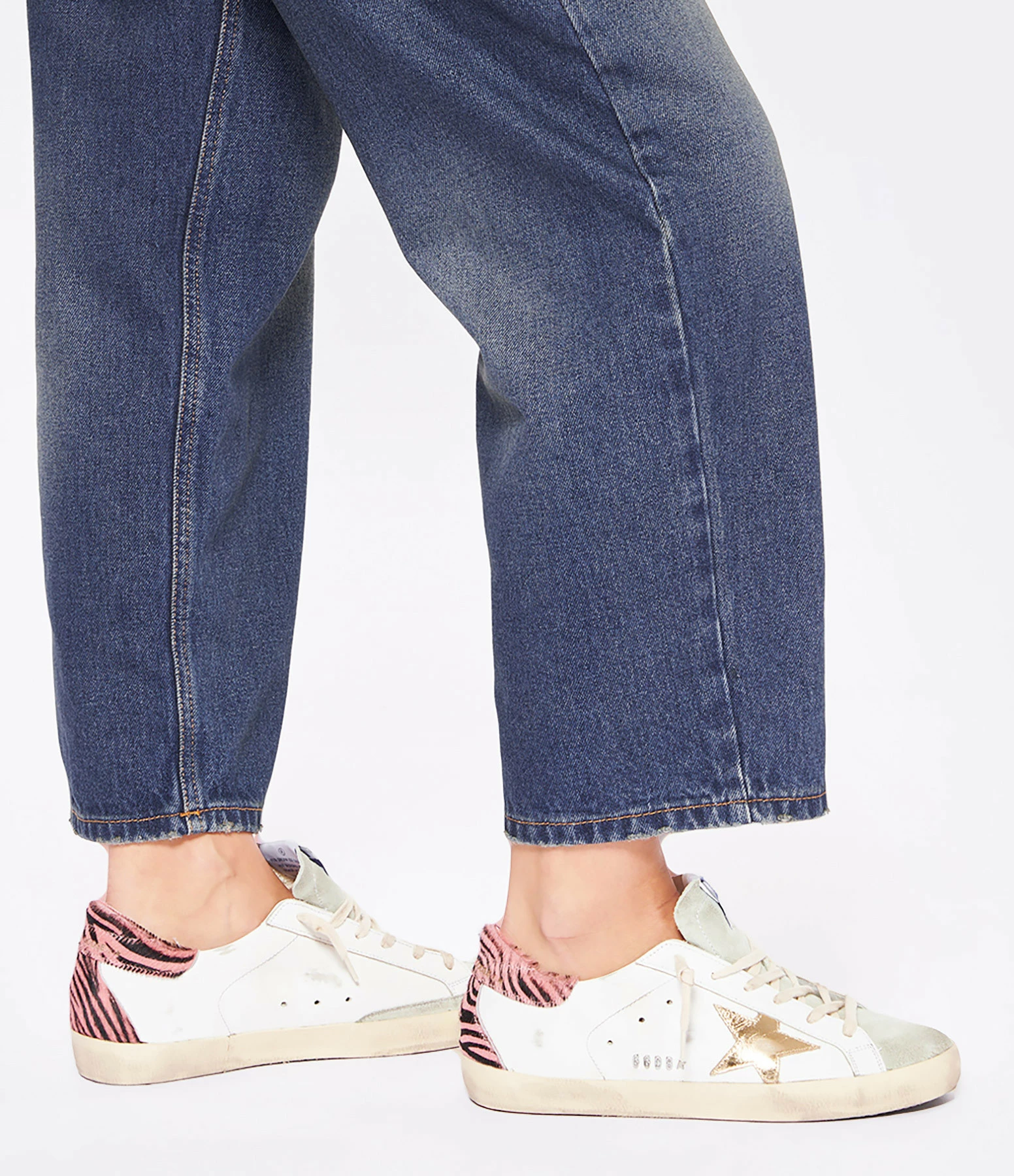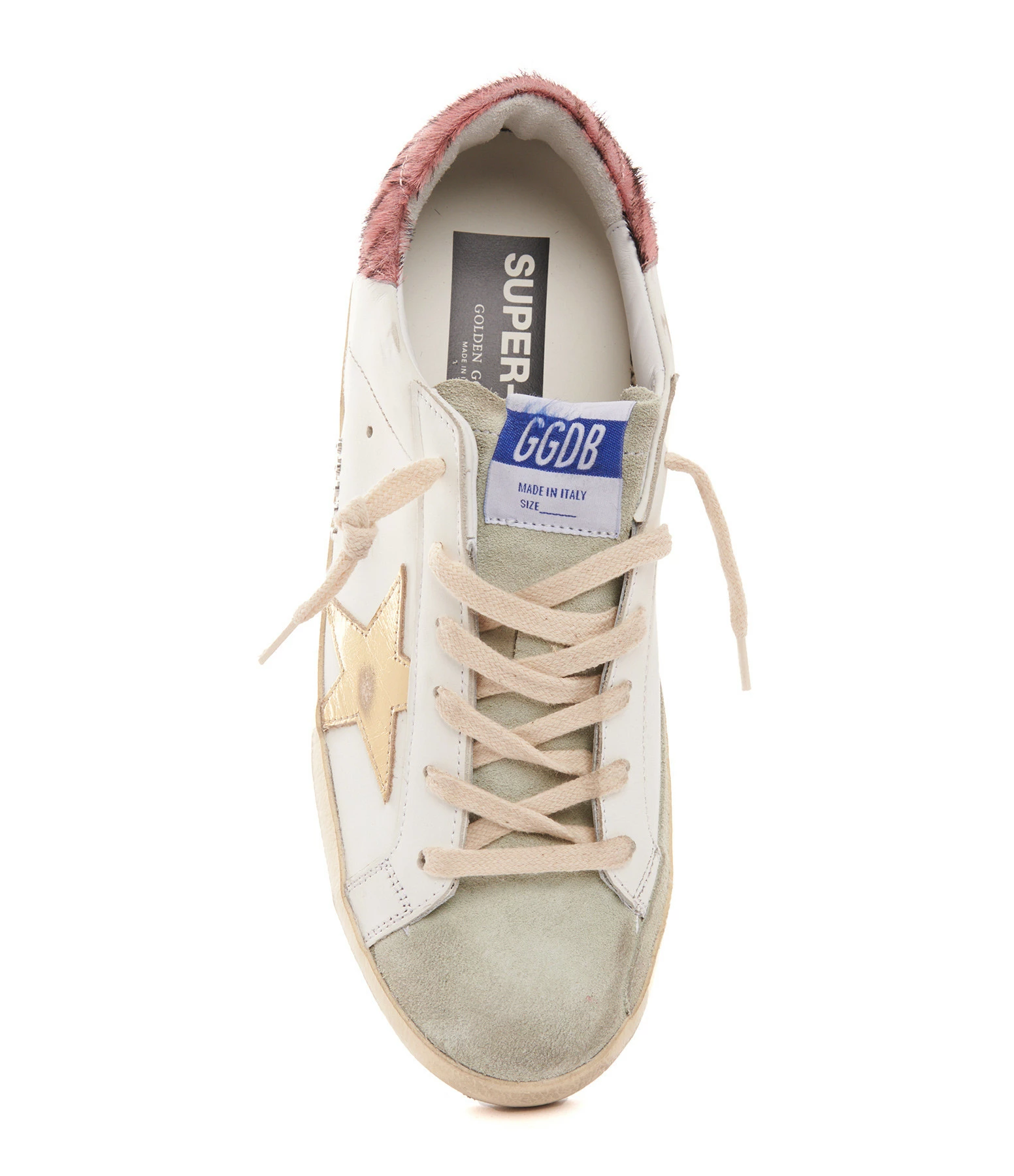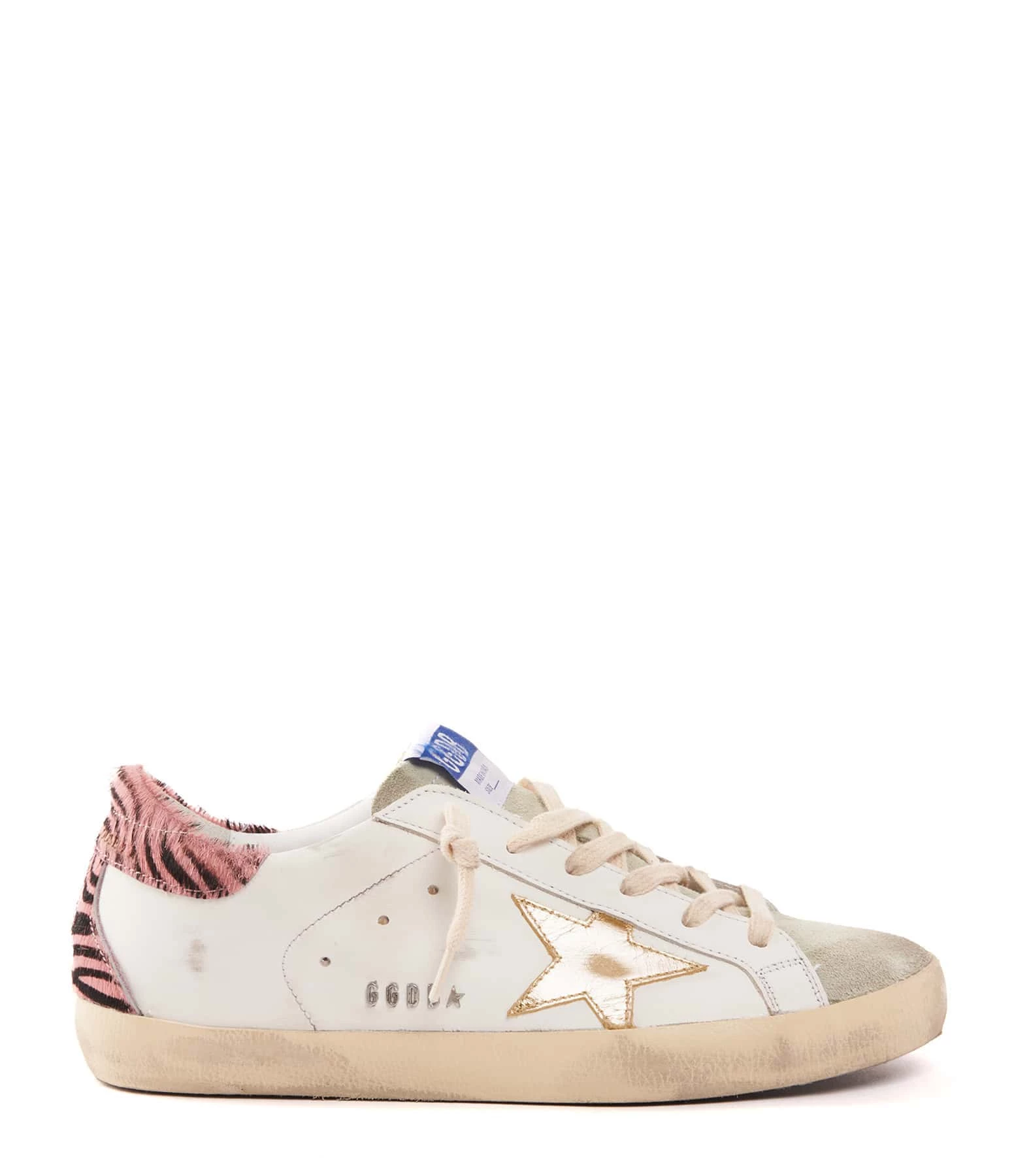 Baskets basses en cuir lisse blanc. Empiècement étoile en cuir lisse doré et renfort talon en cuir pony zèbre rose et noir. Lacets écrus. Intérieur en maille bouclette et cuir. Inscription “GGDB” sur le côté extérieur.