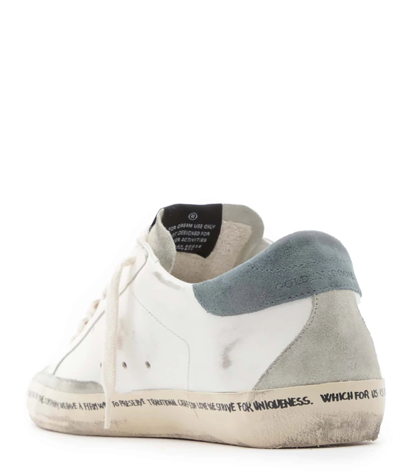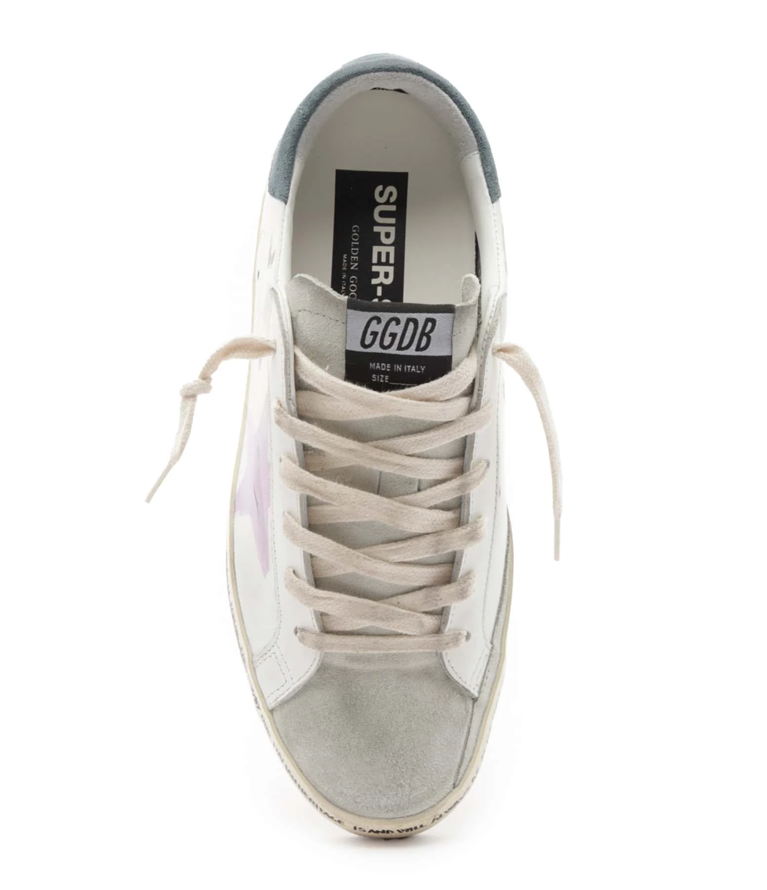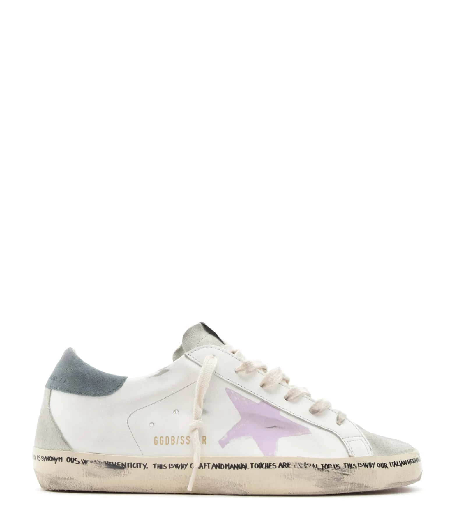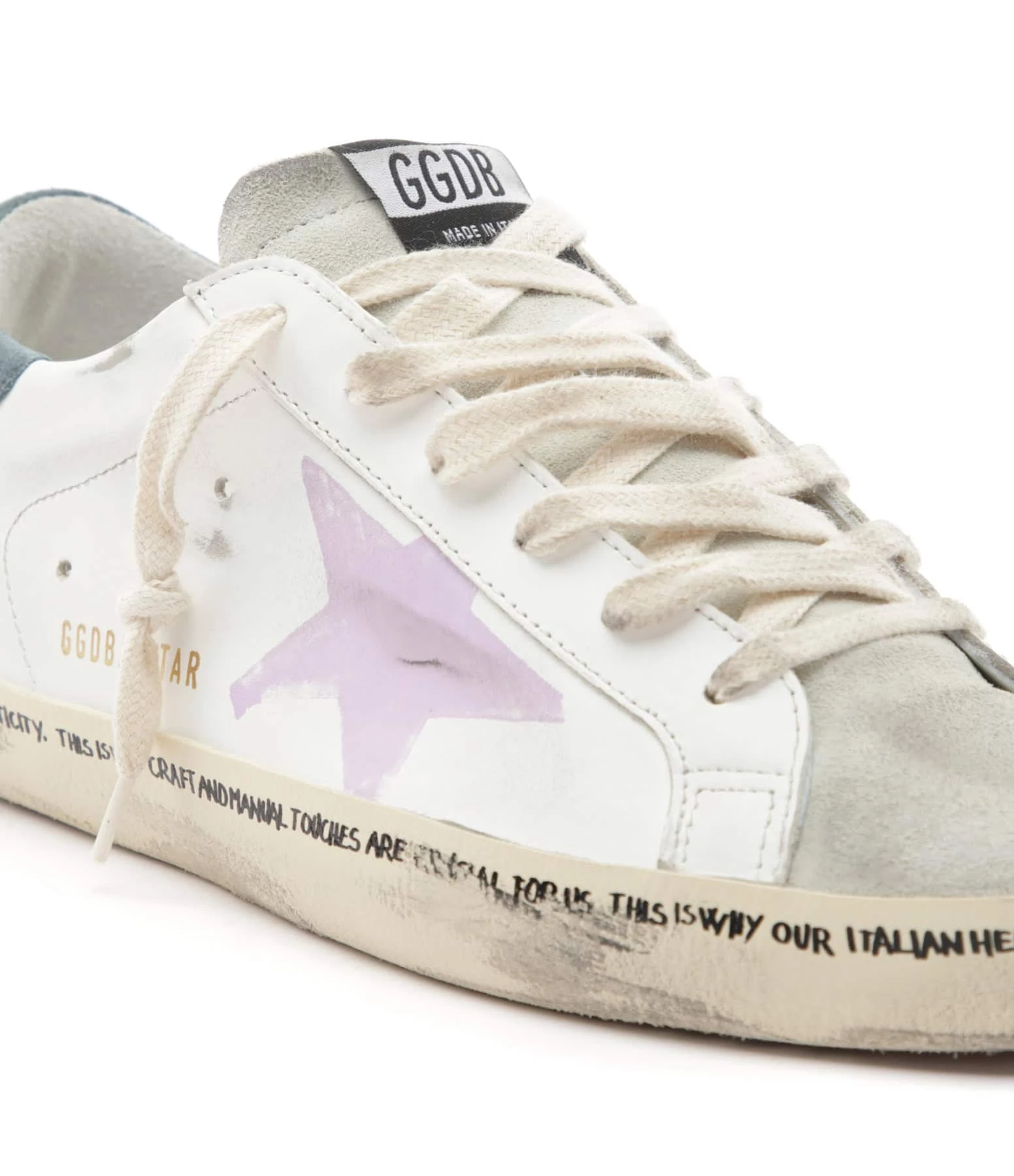 Baskets basses en cuir lisse blanc. Empiècement étoile violet. Renfort talon en cuir suédé bleu. Lacets blanc. Intérieur en maille bouclette et cuir. Inscription “GGDB/SSTAR” sur le côté extérieur. Inscription sur la semelle.