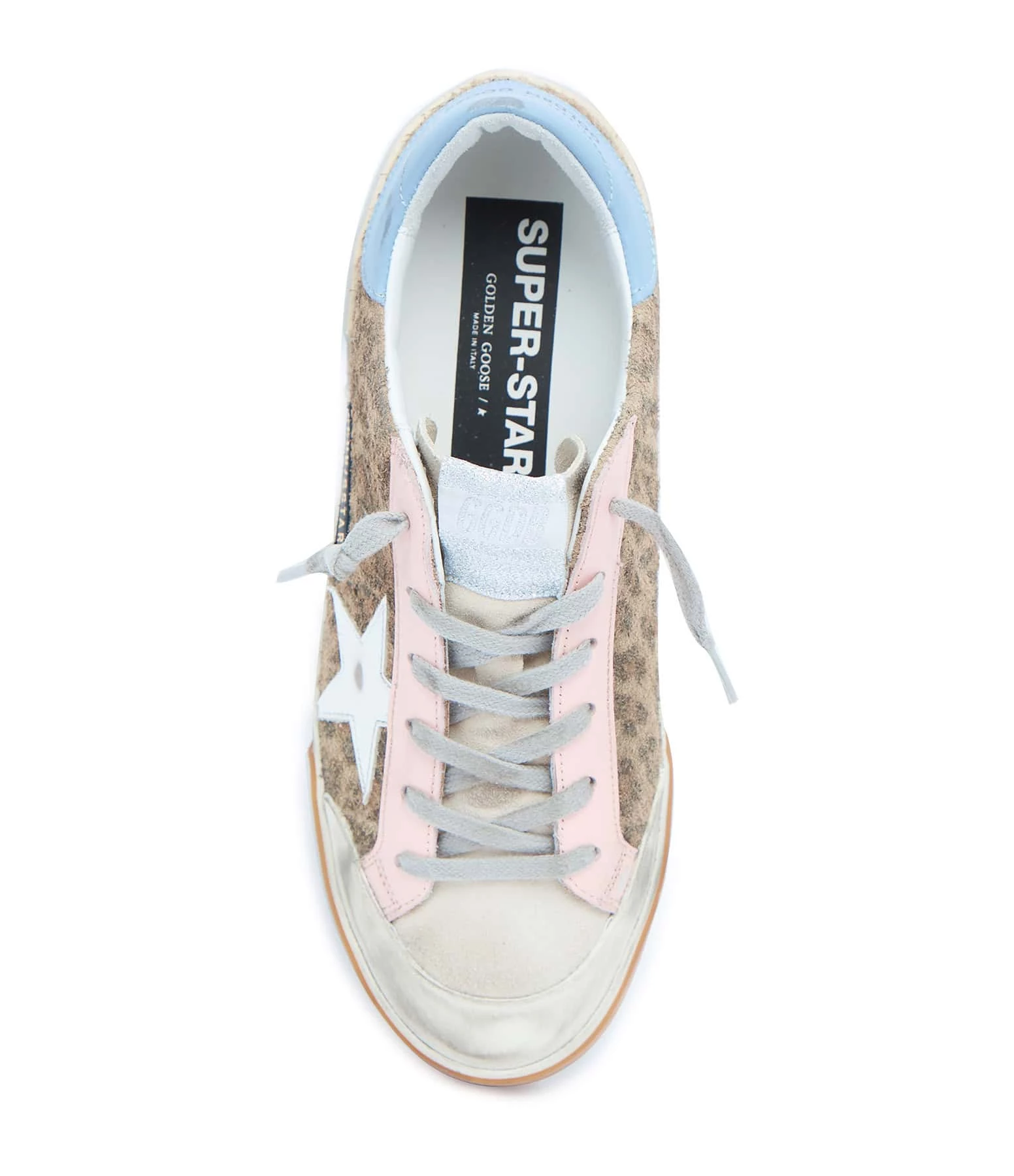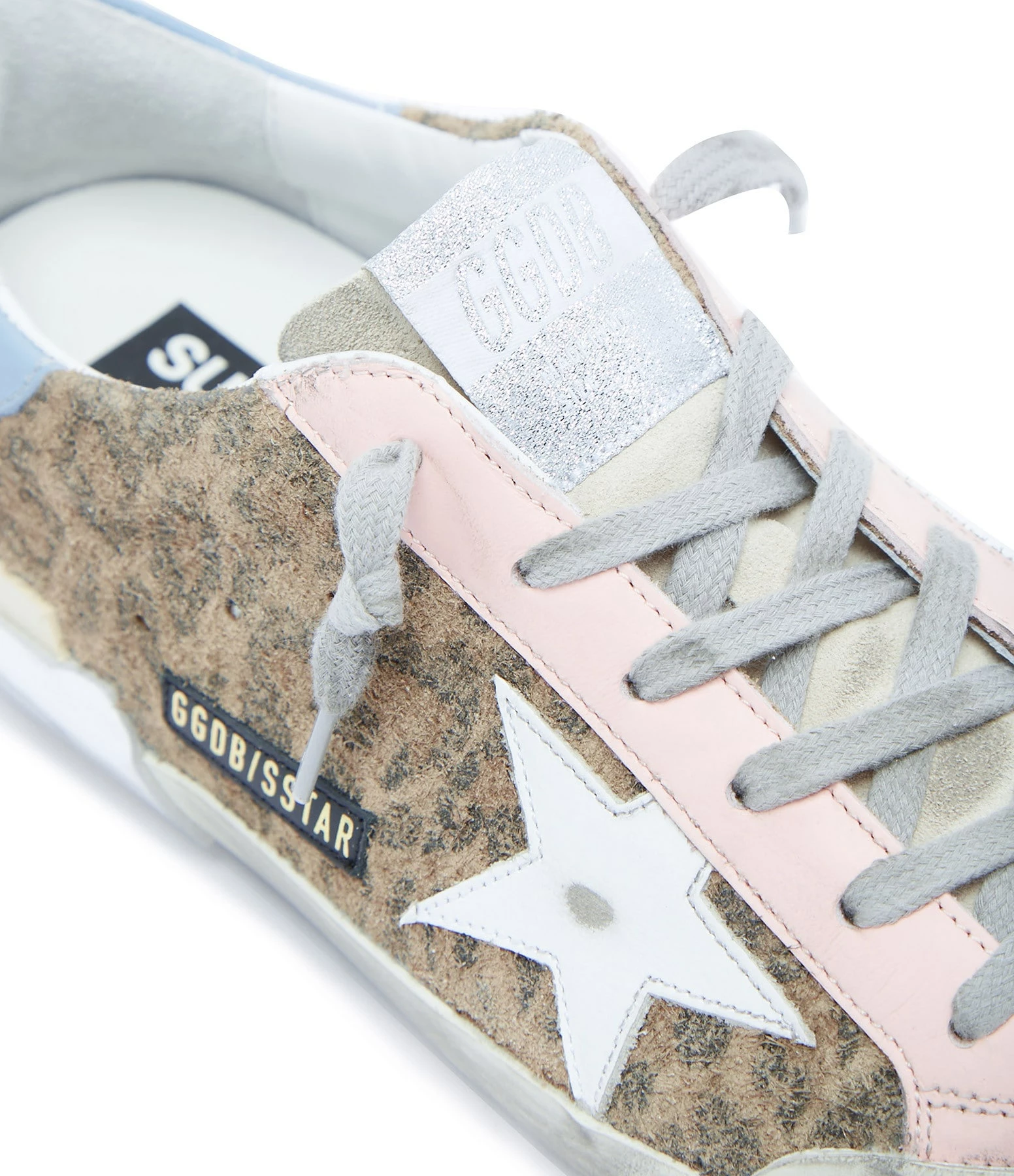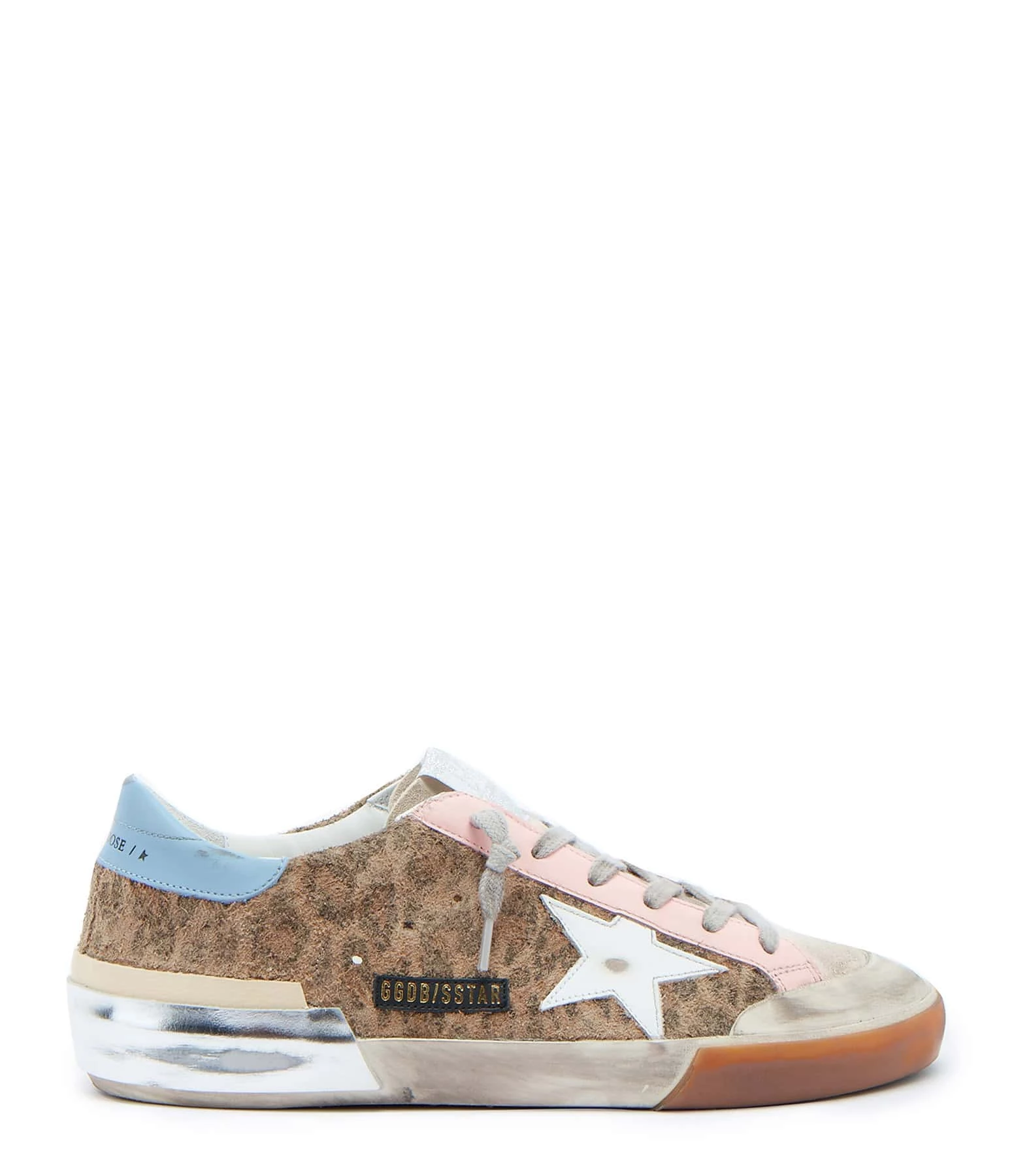 Baskets basses en cuir pony imprimé léopard, languette en cuir suédé beige. Empiècement étoile en cuir lisse blanc. Renfort talon en cuir lisse bleu. Semelles argentées. Lacets gris. Intérieur en maille bouclette et cuir.