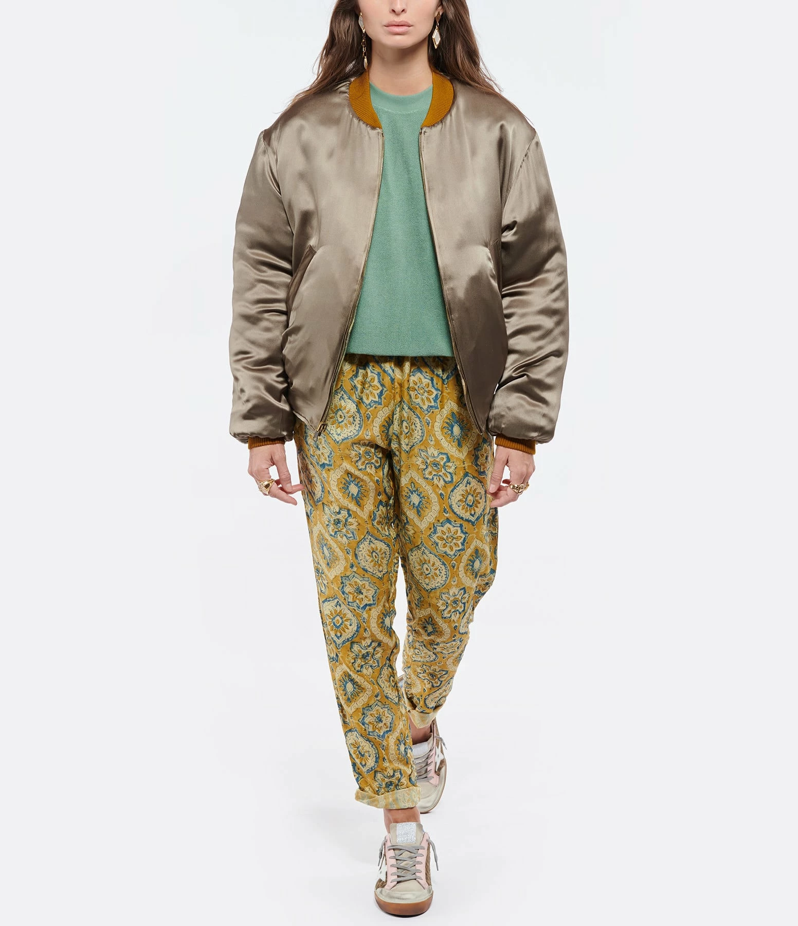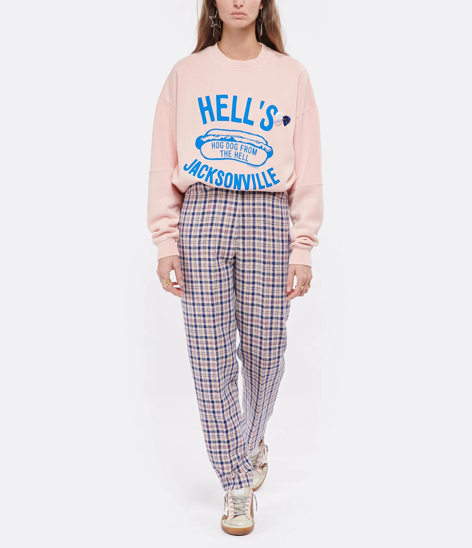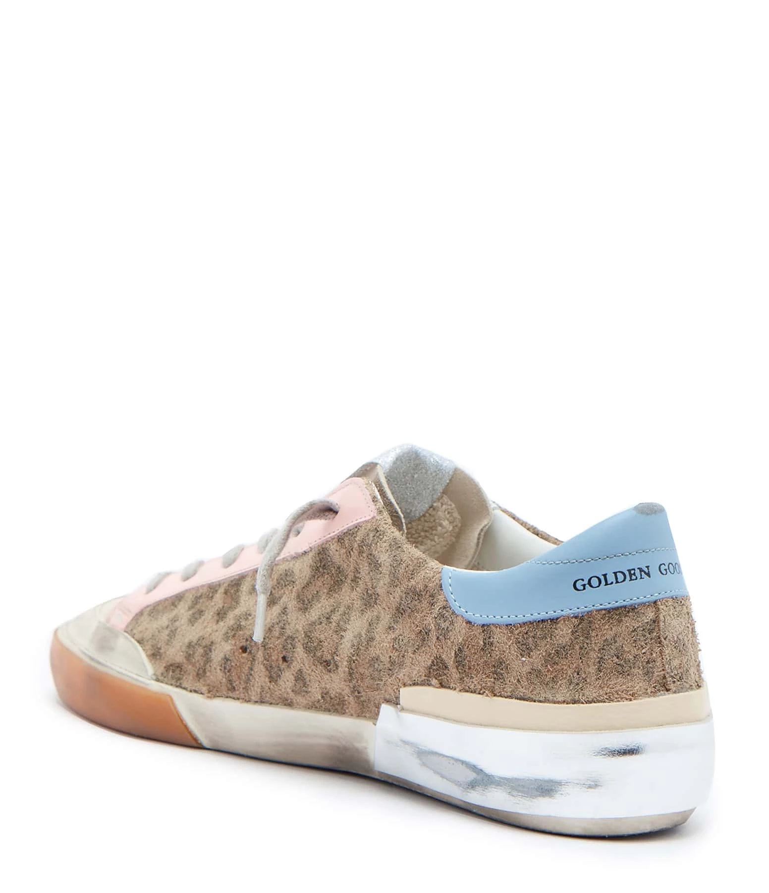 Baskets basses en cuir pony imprimé léopard, languette en cuir suédé beige. Empiècement étoile en cuir lisse blanc. Renfort talon en cuir lisse bleu. Semelles argentées. Lacets gris. Intérieur en maille bouclette et cuir.