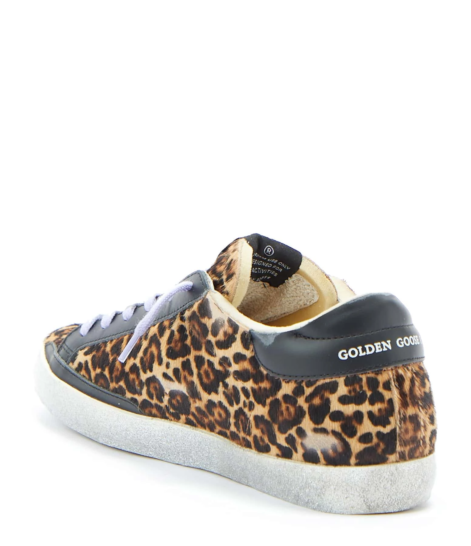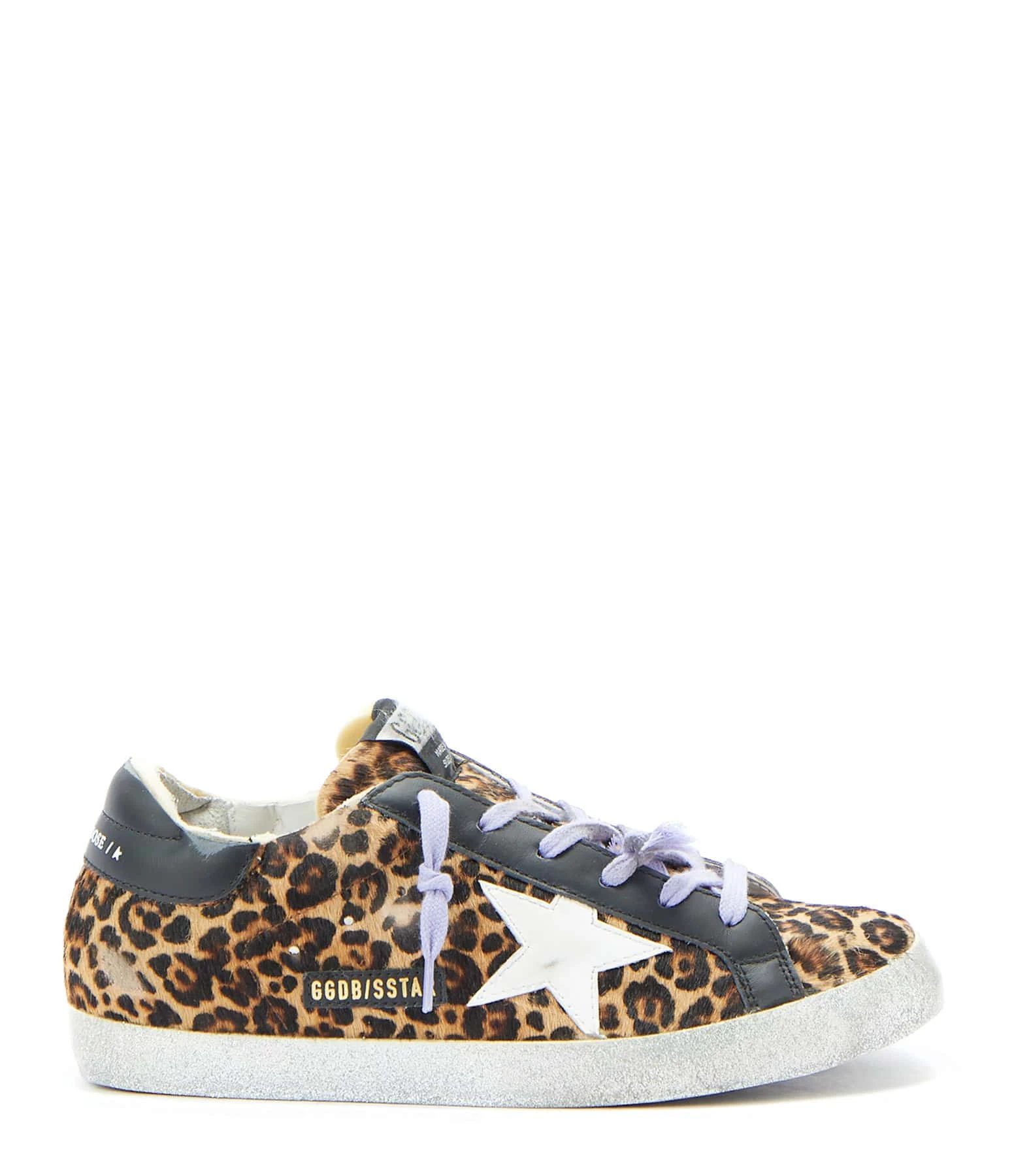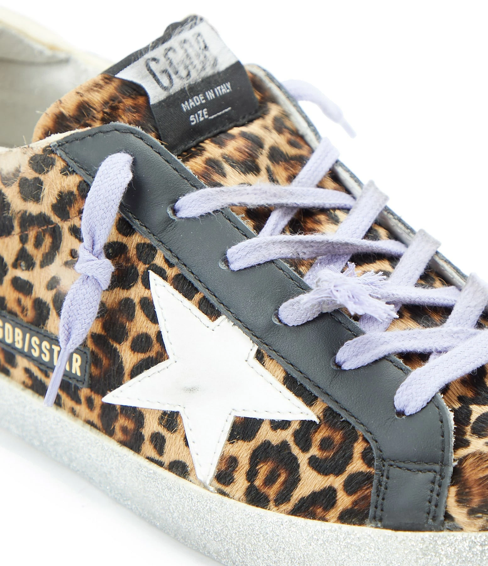 Baskets basses en cuir pony léopard. Empiècement étoile en cuir lisse blanc. Renfort talon en cuir lisse noir. Lacets violets. Semelle à paillettes argentées. Intérieur en cuir et maille bouclette. Inscription “GGDB/SSTAR” sur le côté extérieur.