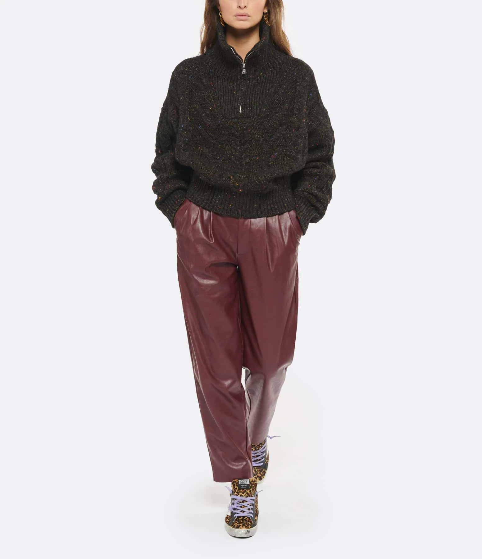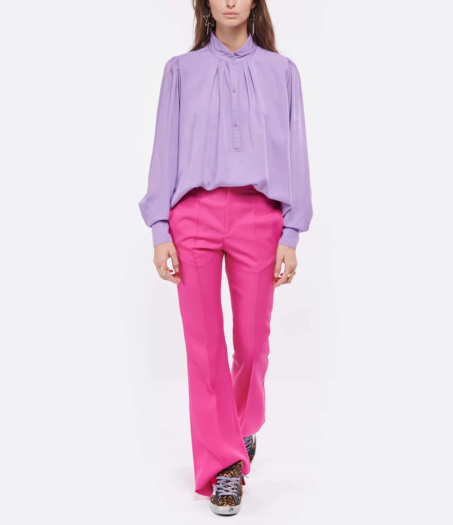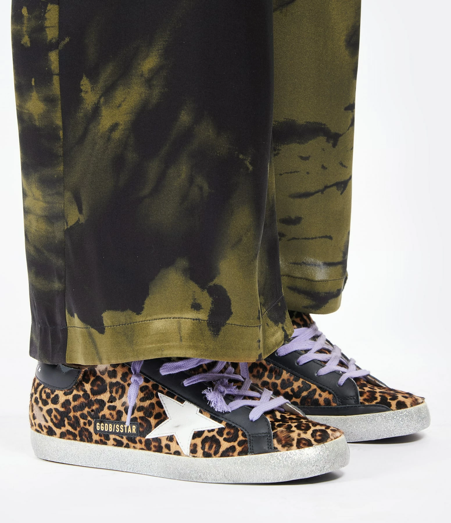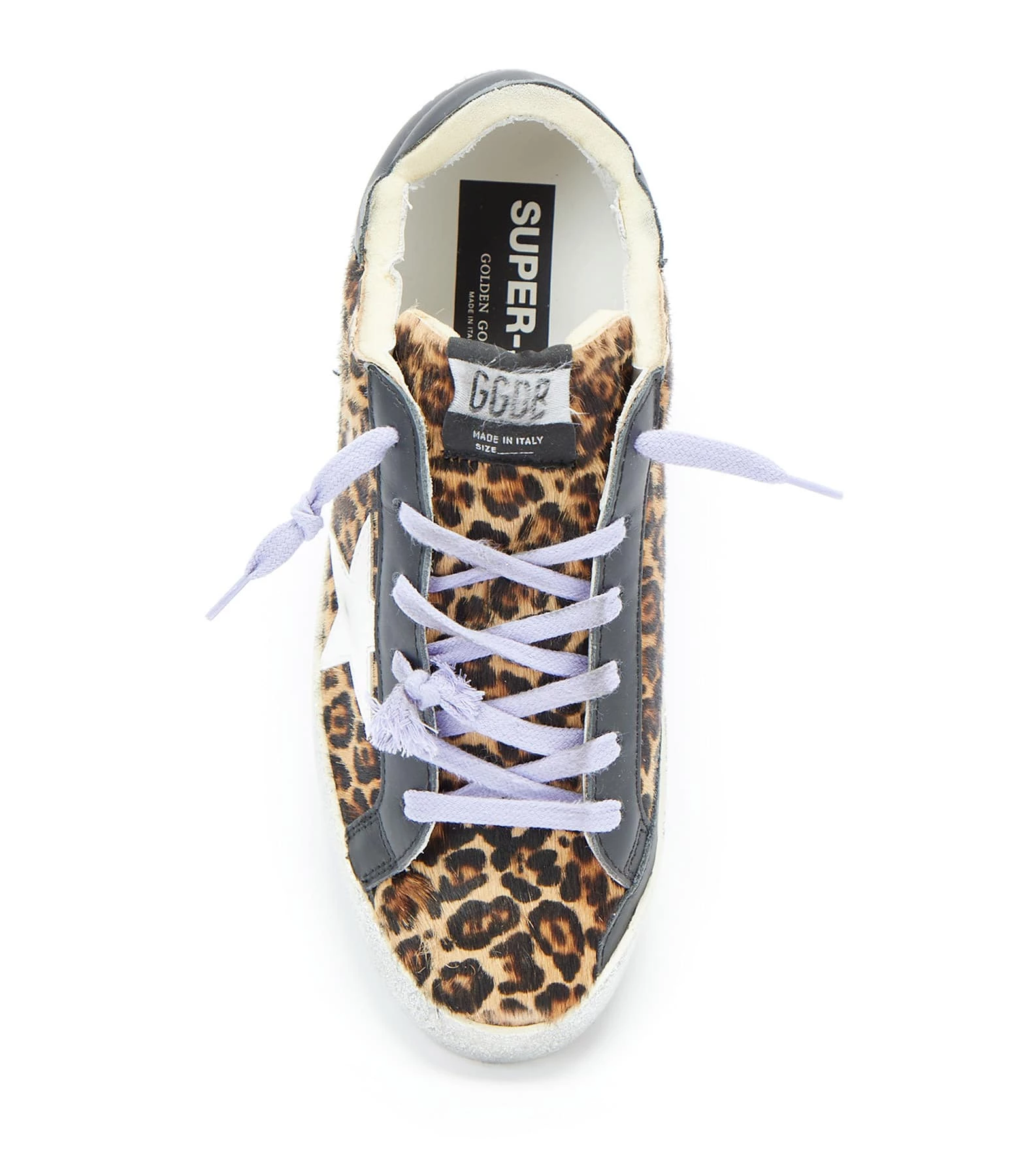 Baskets basses en cuir pony léopard. Empiècement étoile en cuir lisse blanc. Renfort talon en cuir lisse noir. Lacets violets. Semelle à paillettes argentées. Intérieur en cuir et maille bouclette. Inscription “GGDB/SSTAR” sur le côté extérieur.