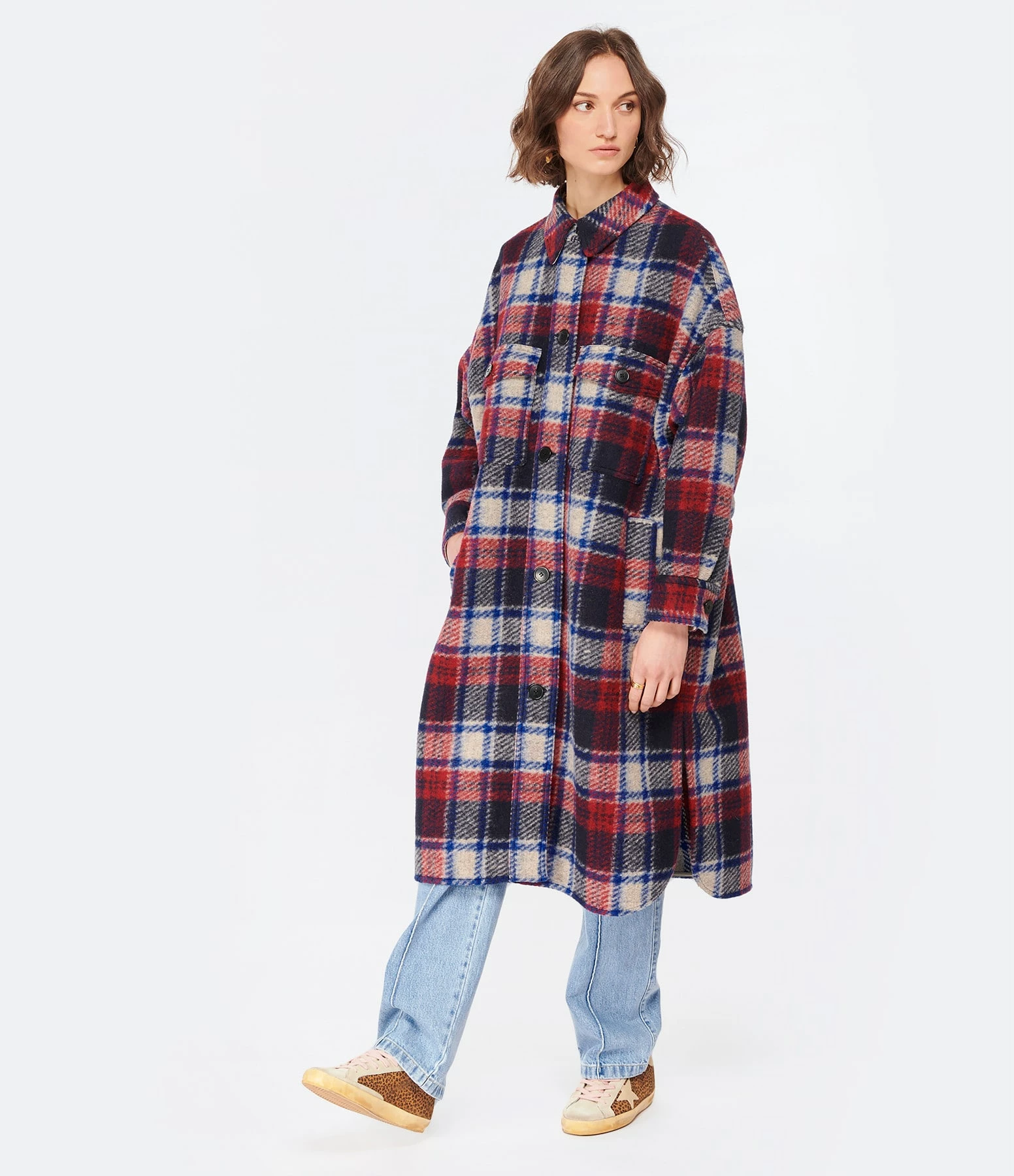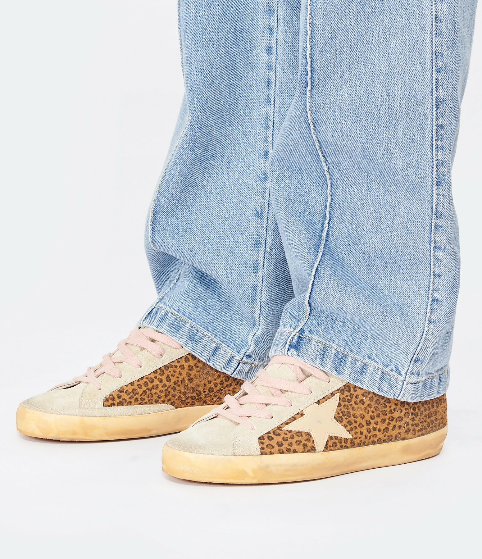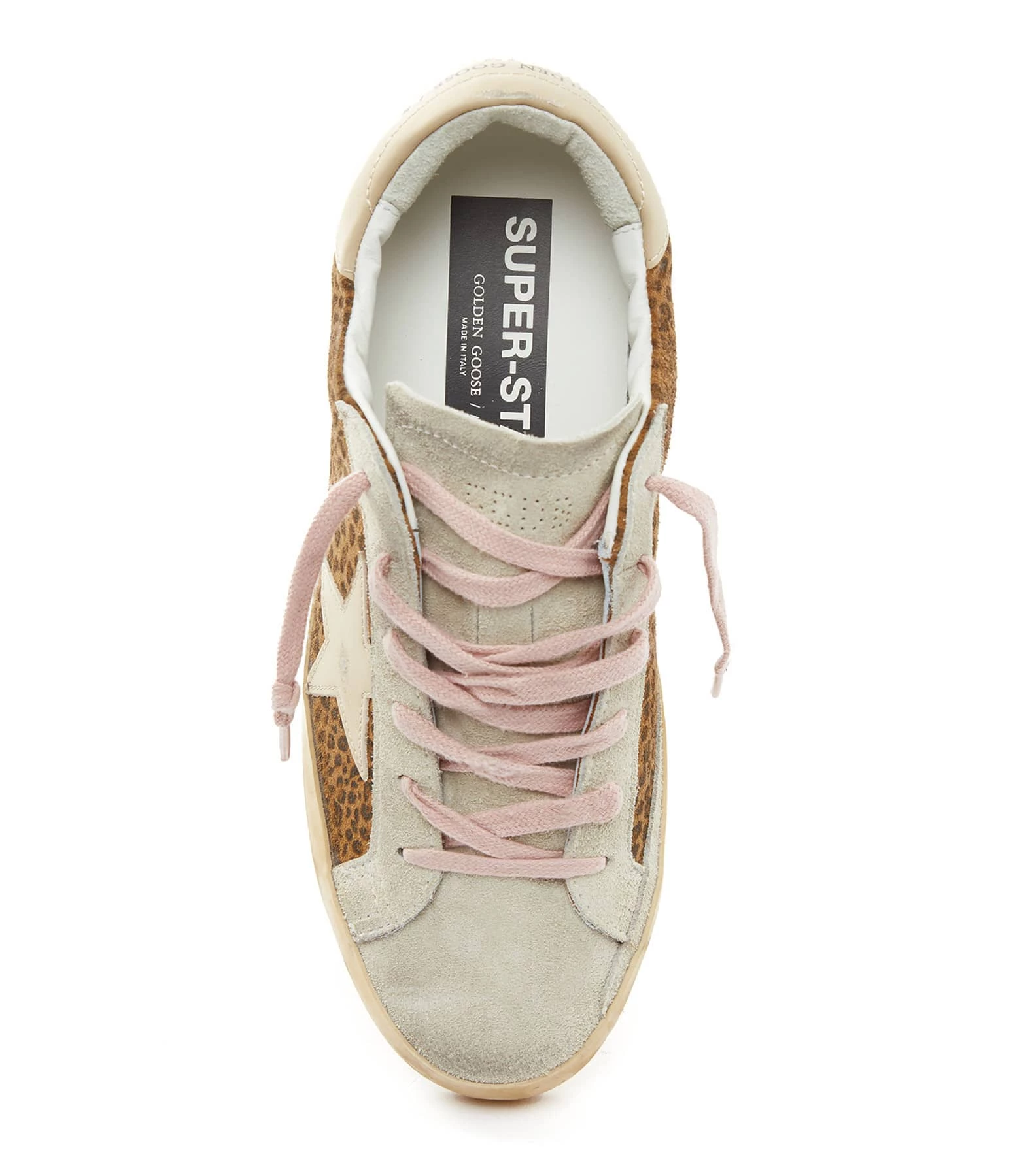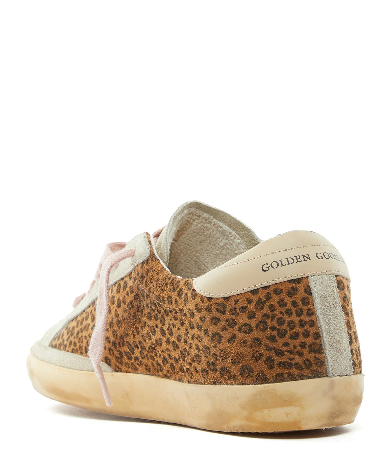 Baskets basses en cuir suédé léopard. Languette en cuir suédé gris. Renfort talon et empiècement logo étoile en cuir lisse beige. Inscription “GGDB/SSTAR” embossé sur le côté extérieur en doré. Lacets roses. Intérieur en maille bouclette et cuir.