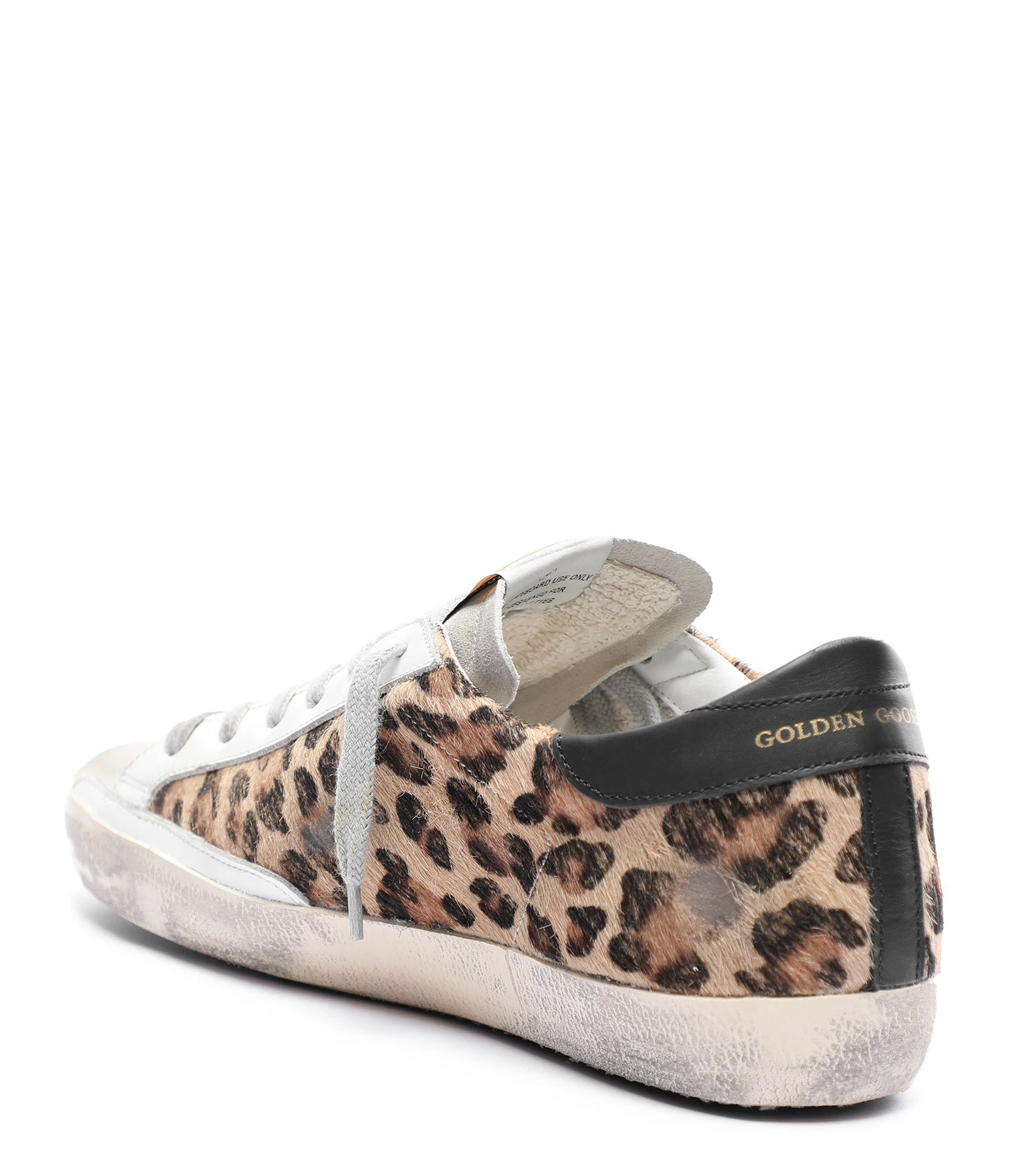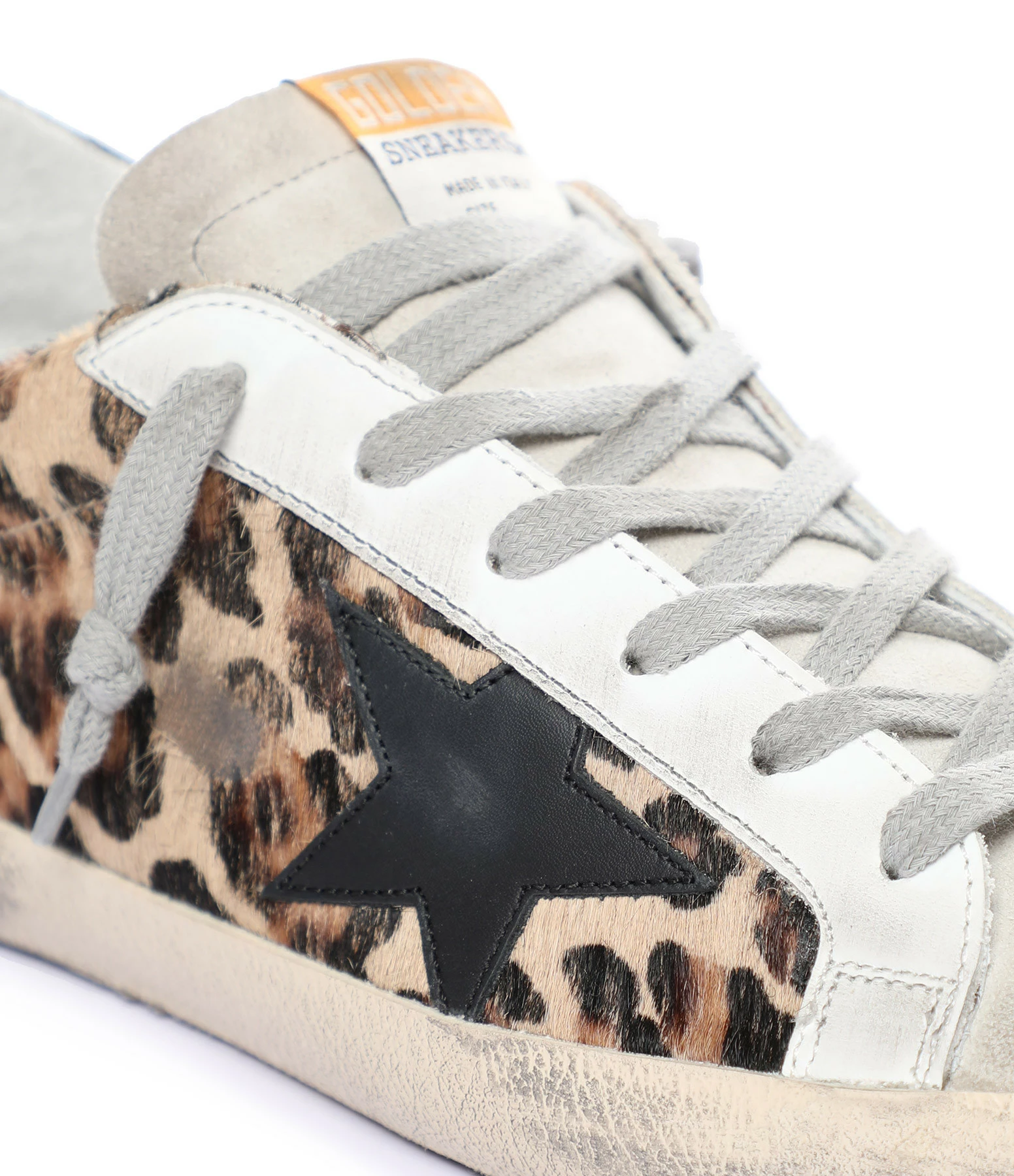 Baskets basses en cuir pony imprimé léopard, languette en cuir suédé beige. Empiècement étoile et renfort talon en cuir lisse noir. Lacets gris. Intérieur en maille bouclette et cuir.