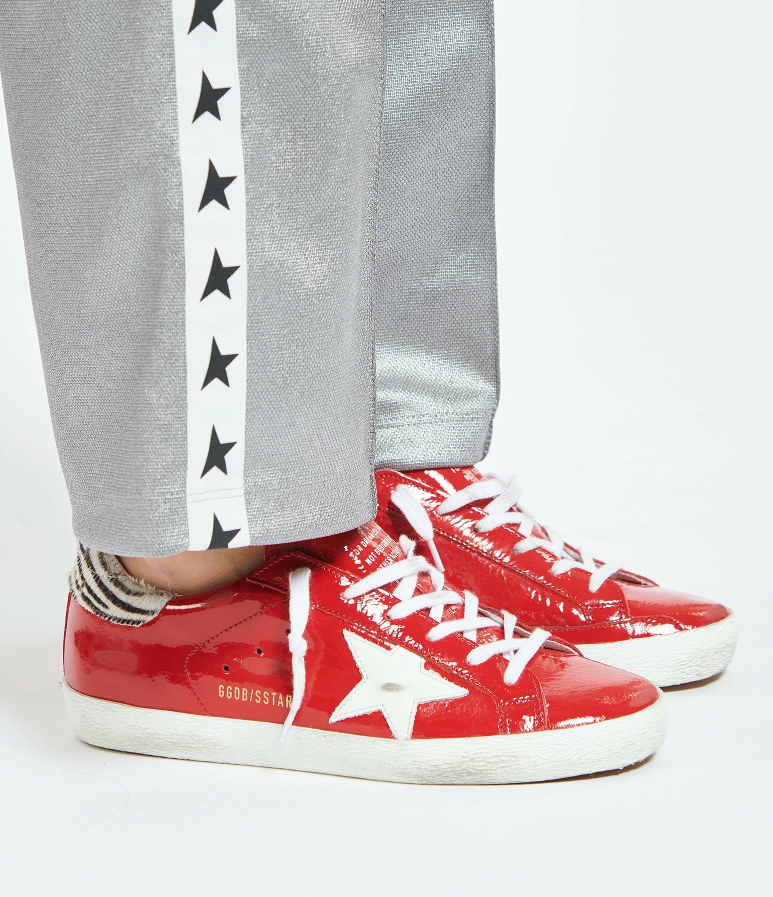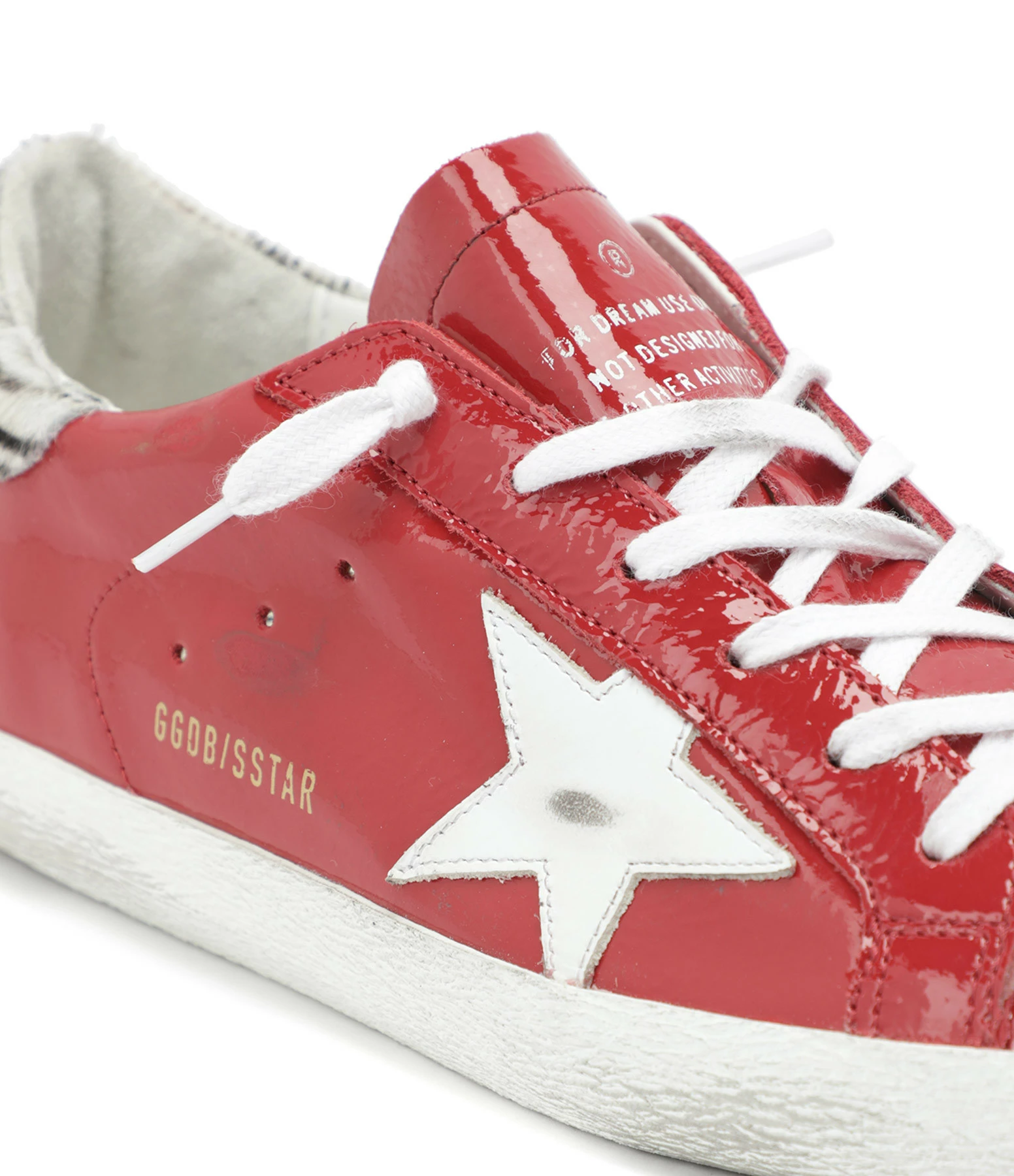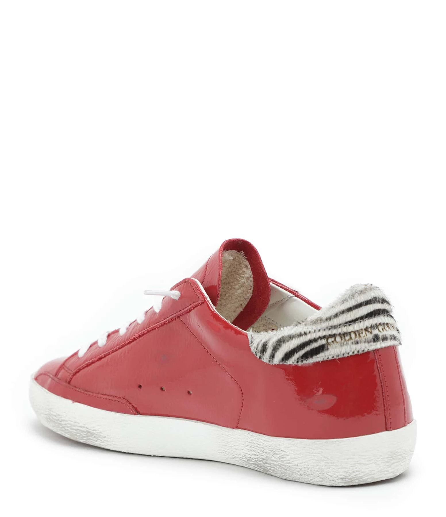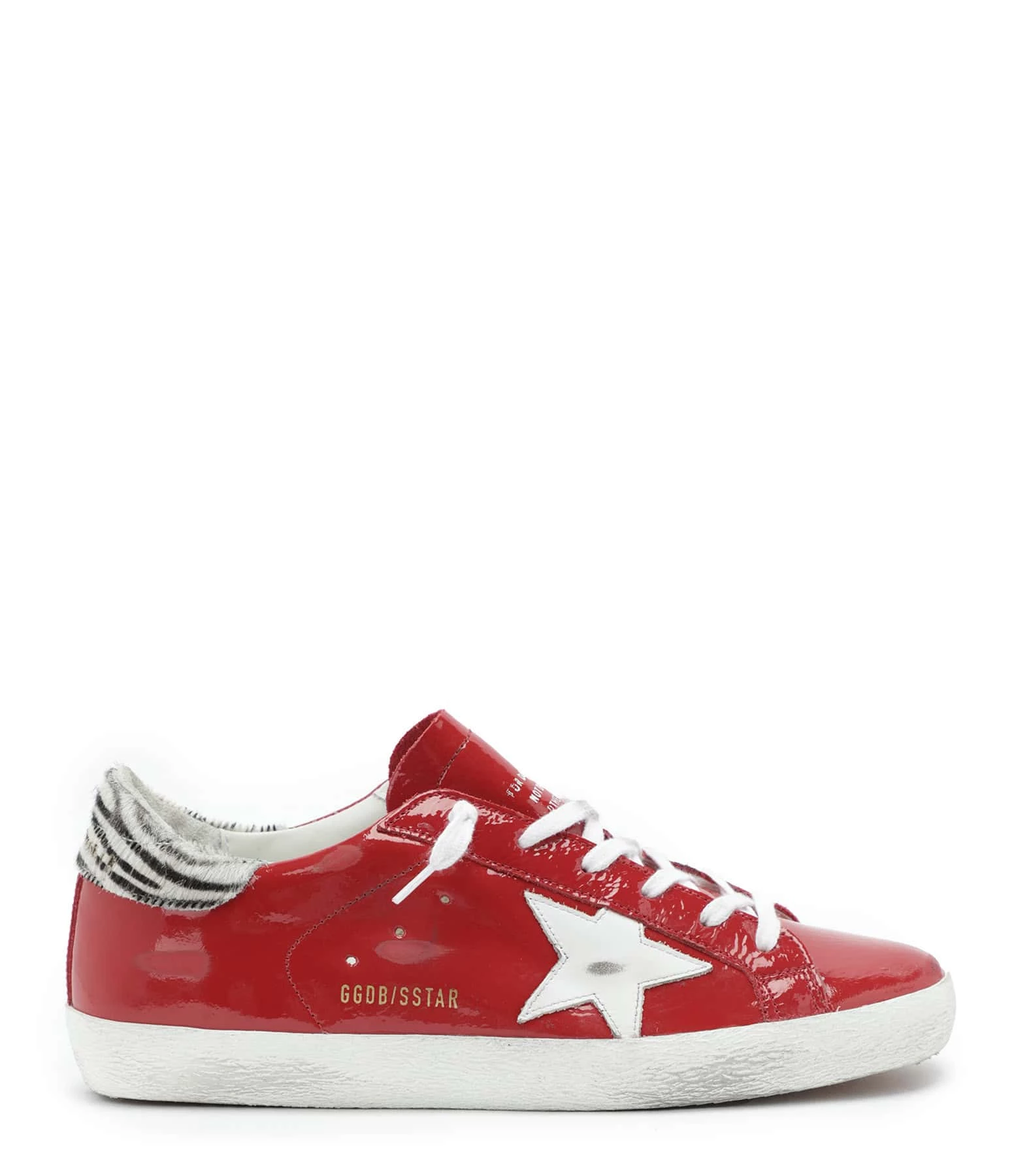 Baskets basses en cuir vernis rouge. Empiècement étoile en cuir lisse blanc. Renfort talon en pony zébré. Lacets blancs. Intérieur en maille bouclette et cuir. Inscription “GGDB/SSTAR” sur le côté extérieur.