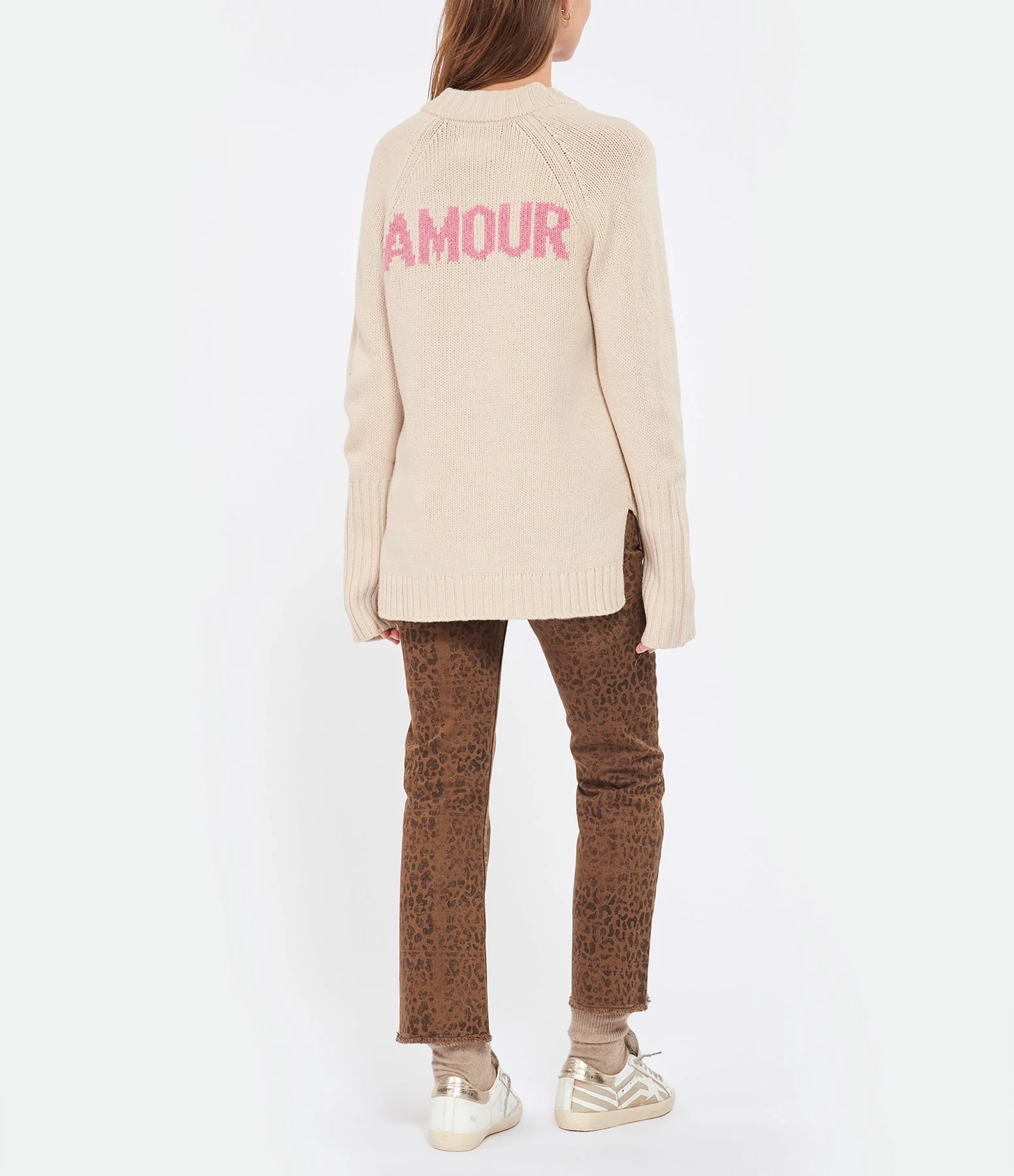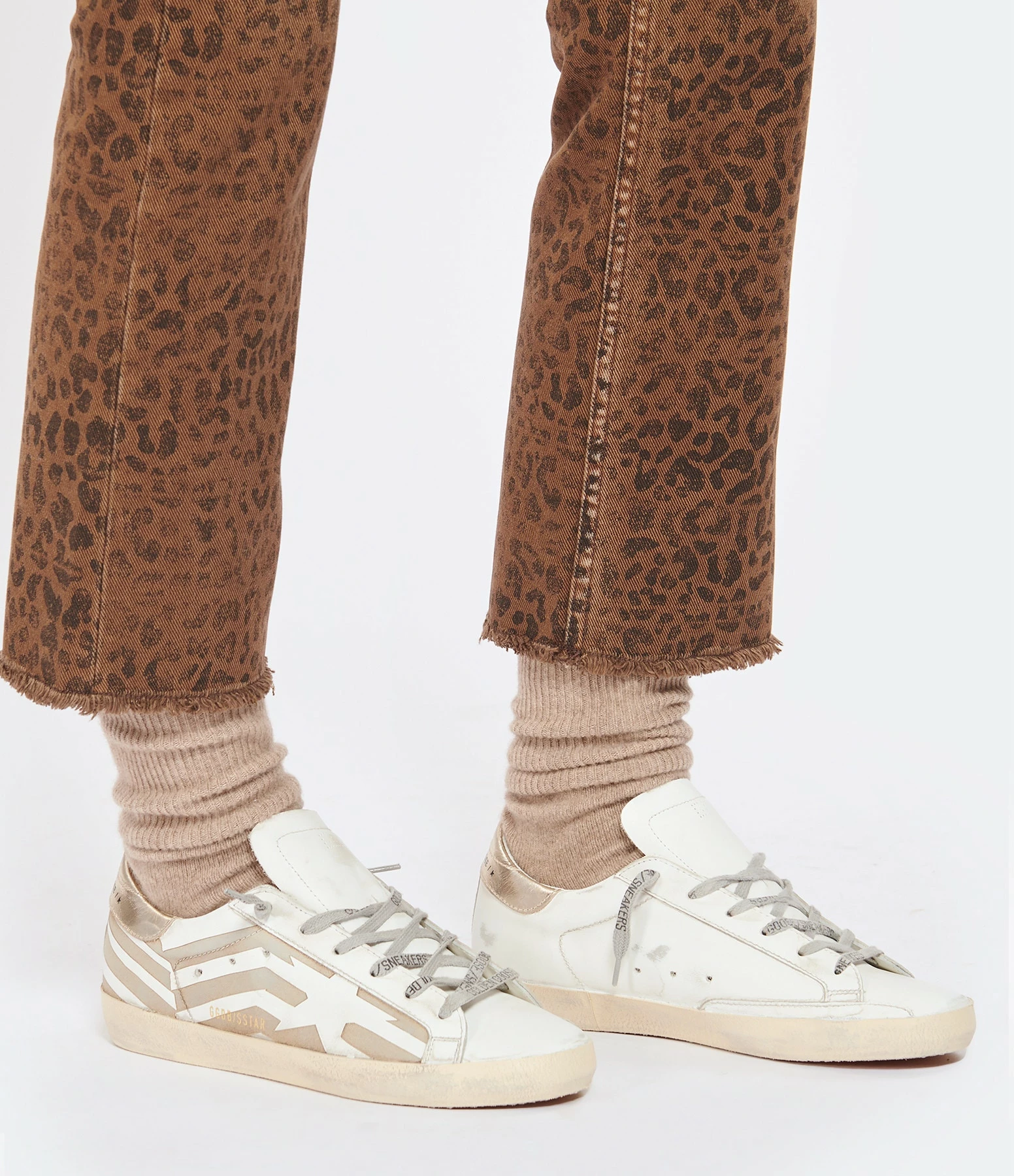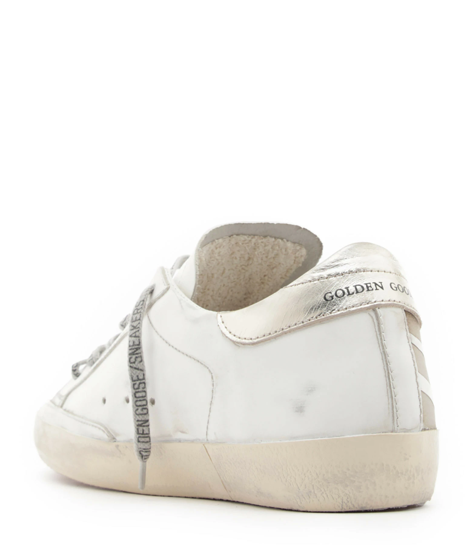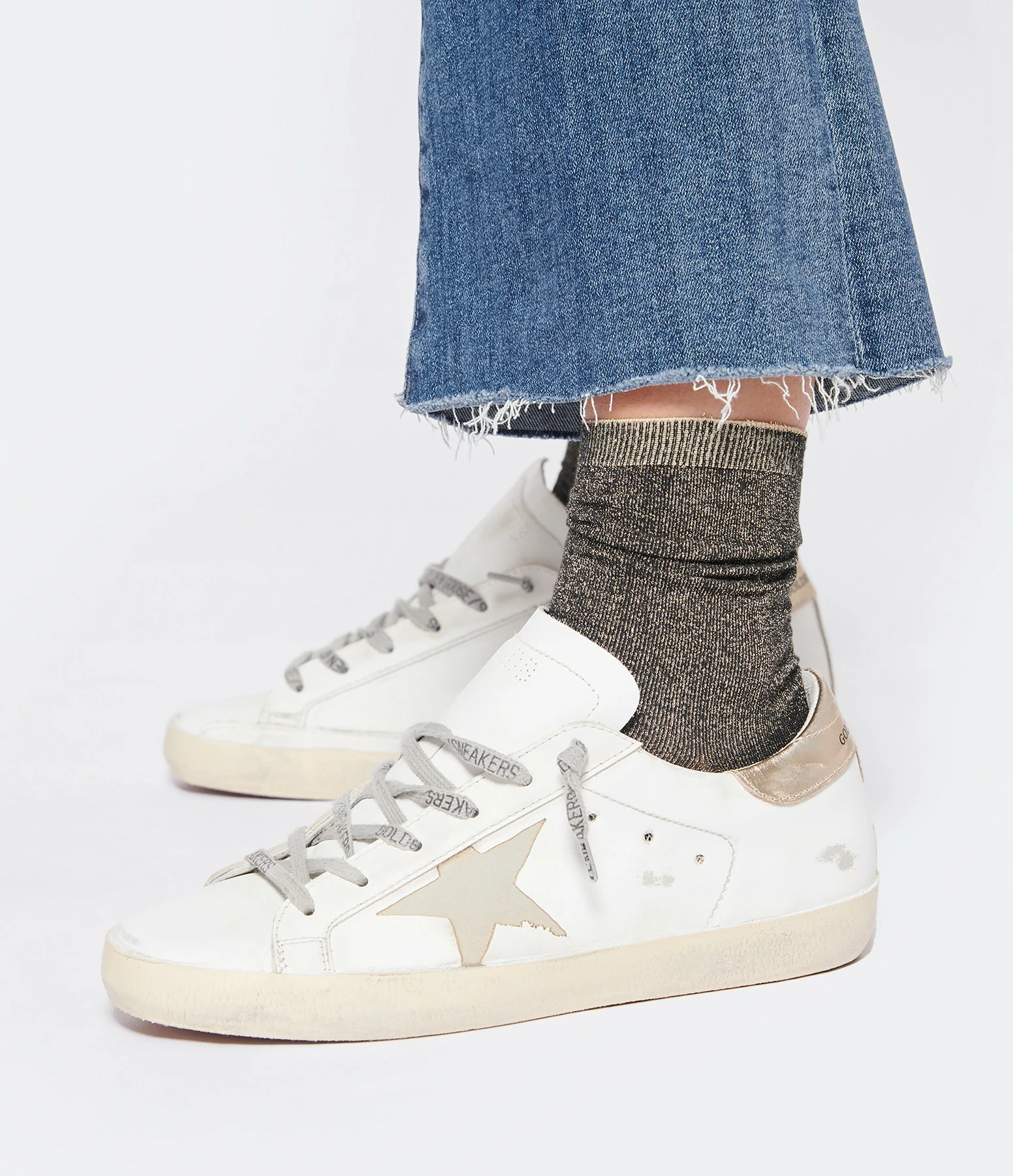 Baskets basses asymétriques en cuir lisse, une blanche à rayures grises, l’autre blanche avec l’étoile grise. Renfort talon en cuir lisse doré. Intérieur en maille bouclette et cuir.