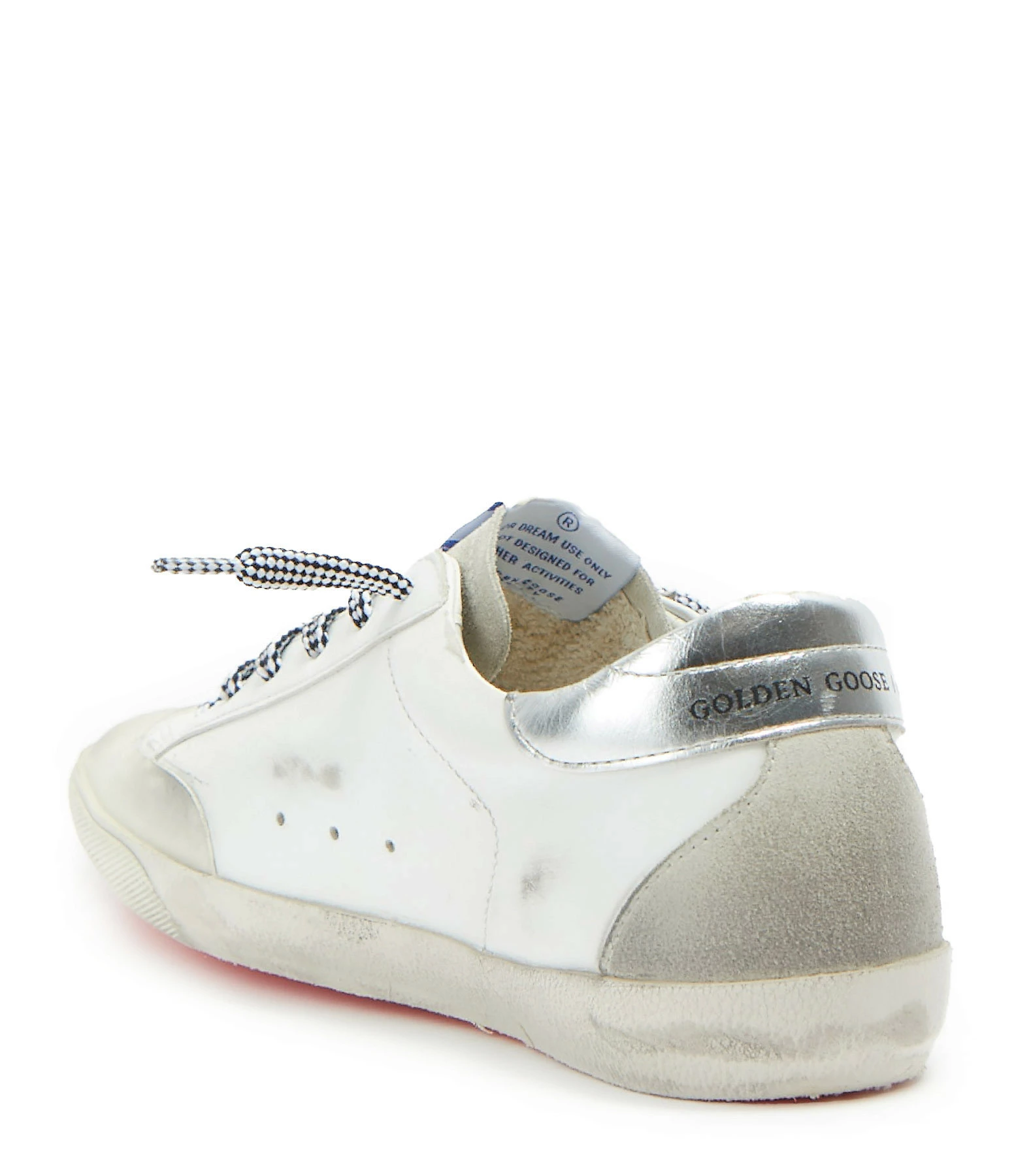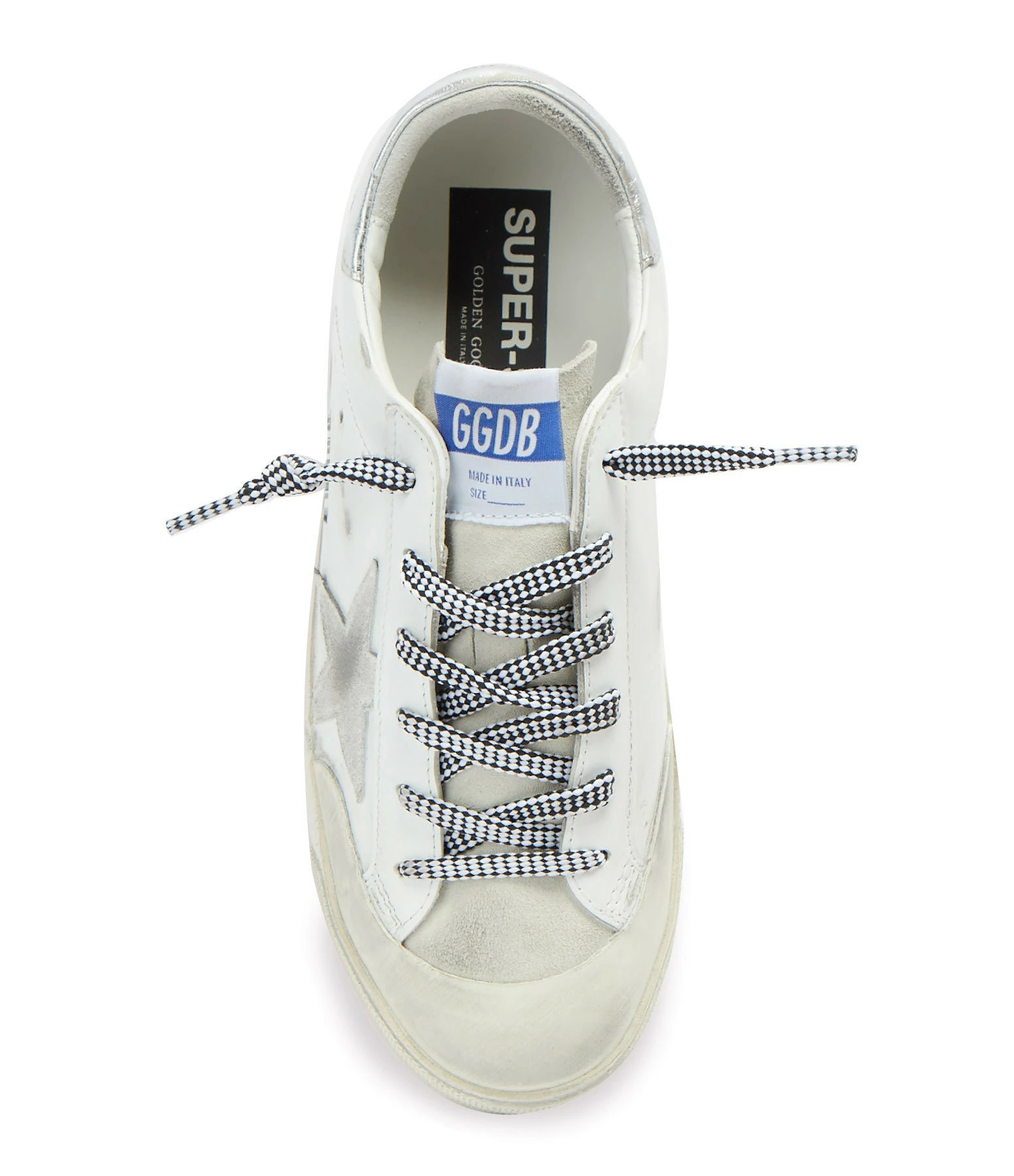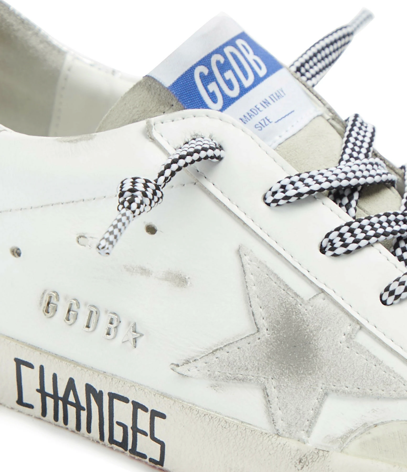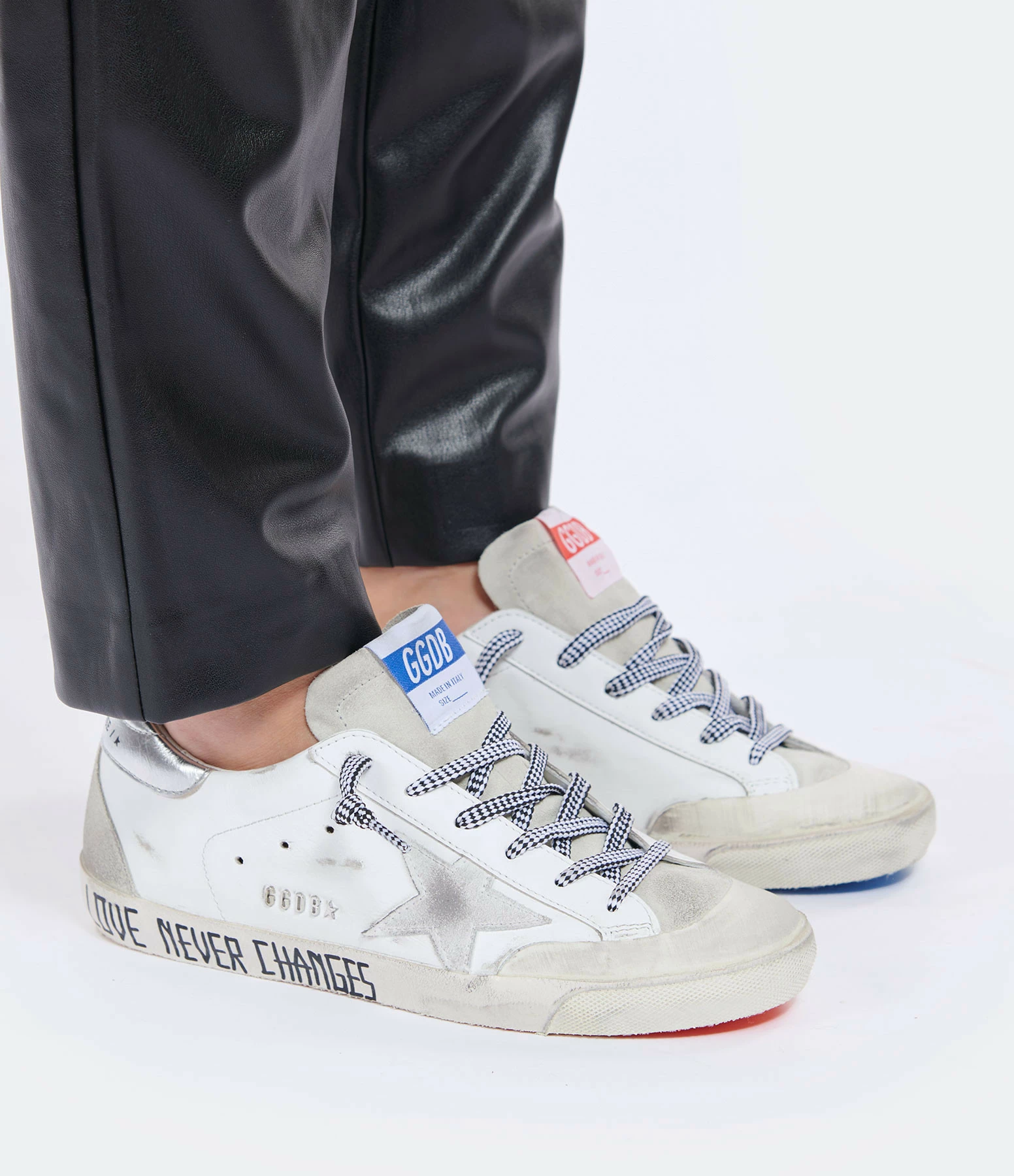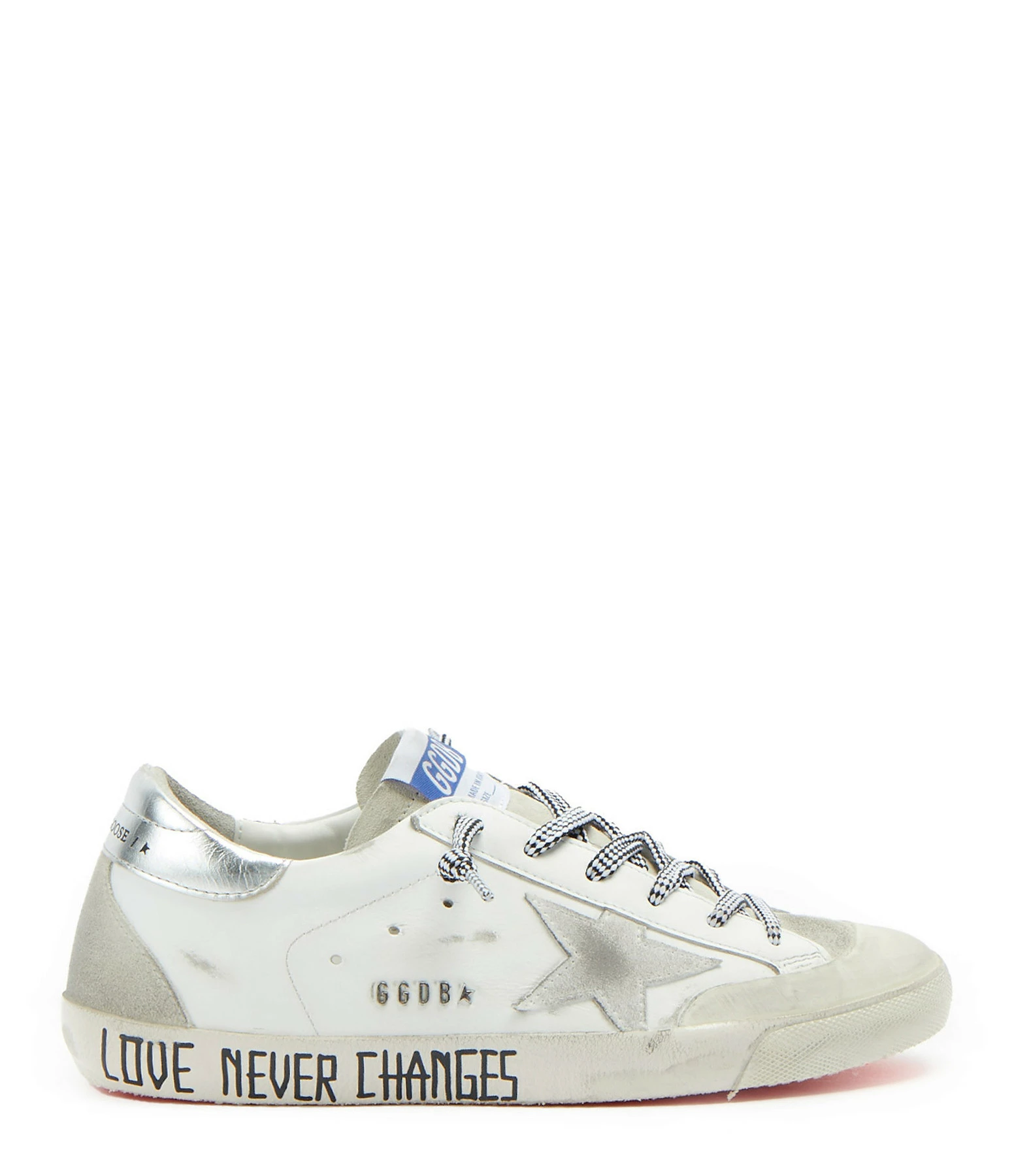 Baskets basses en cuir lisse blanc. Empiècement étoile en cuir suédé blanc et renfort talon en cuir lisse argenté. Lacets à carreaux noirs et blancs. Inscription noire “LOVE NEVER CHANGES” sur la semelle extérieure droite. Semelles oranges fluos. Inscription “GGDB/SSTAR” sur le côté extérieur. Intérieur en maille bouclette et cuir.