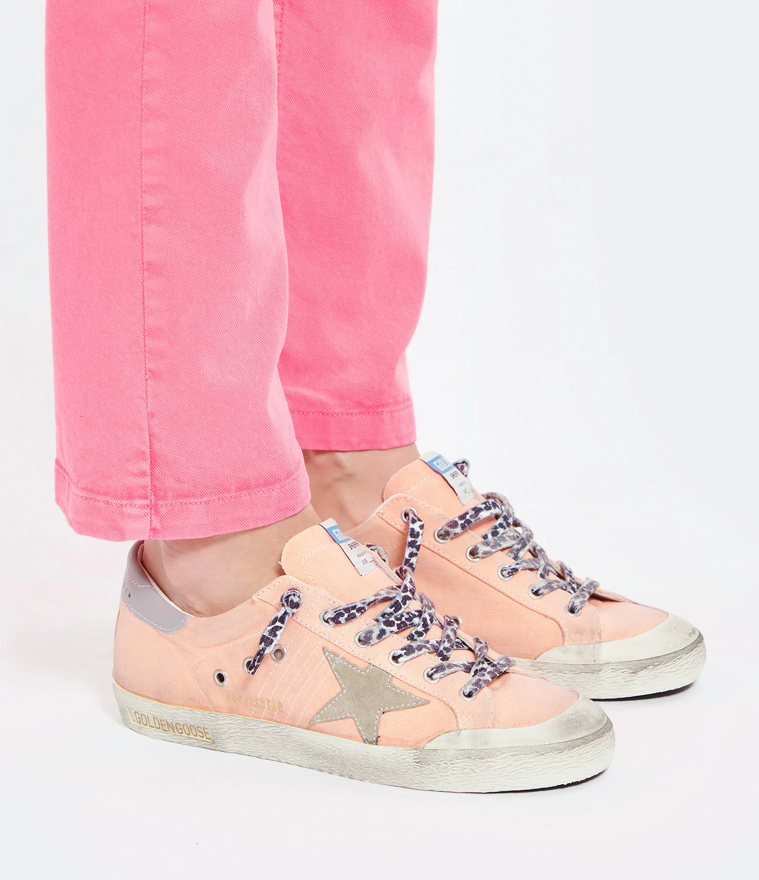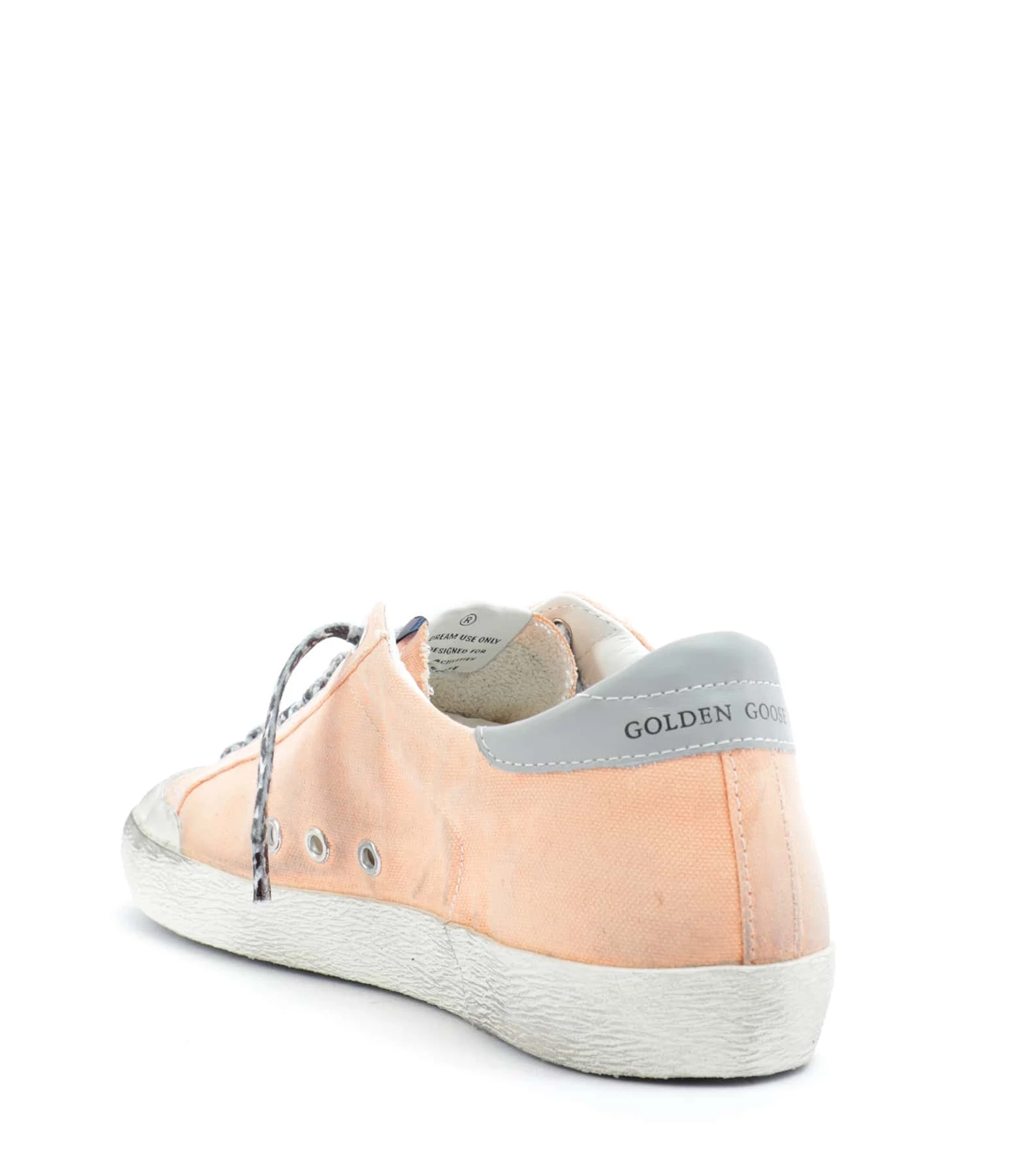 Baskets basses en toile orange. Empiècement étoile en cuir suédé gris. Renfort talon en cuir gris. Lacets léopards. Inscription “GGDB/SSTAR” sur le côté extérieur. Intérieur en maille bouclette et cuir.