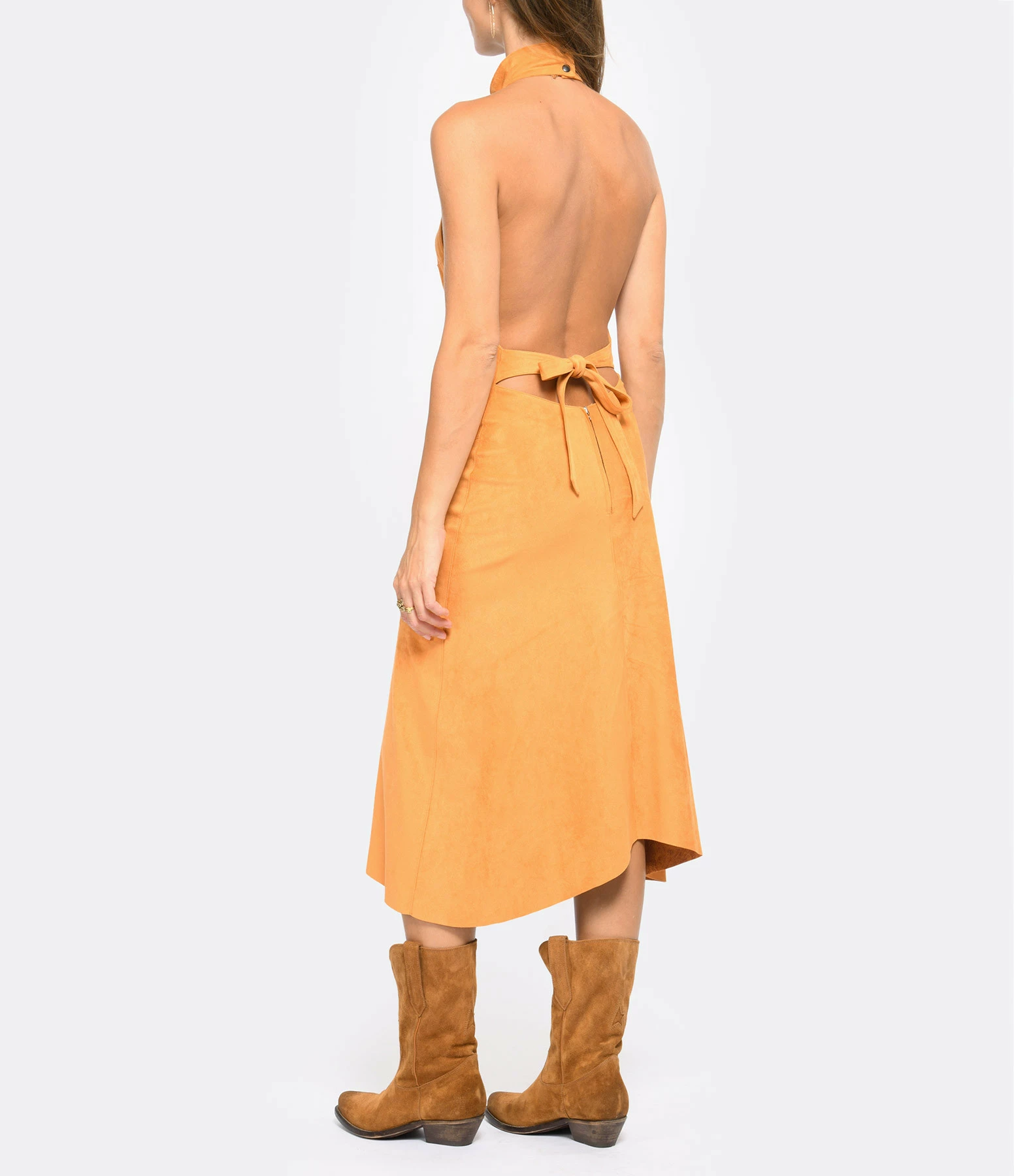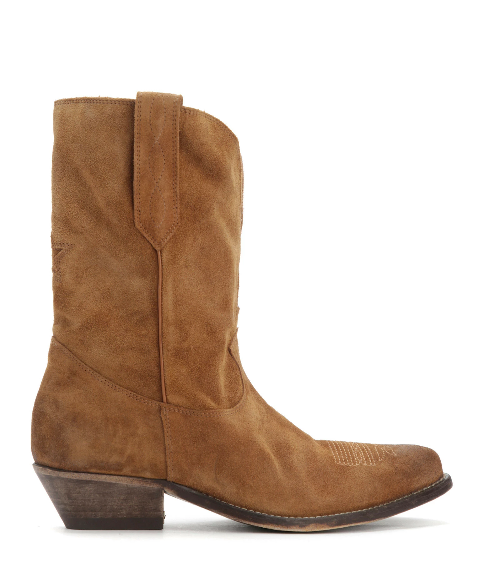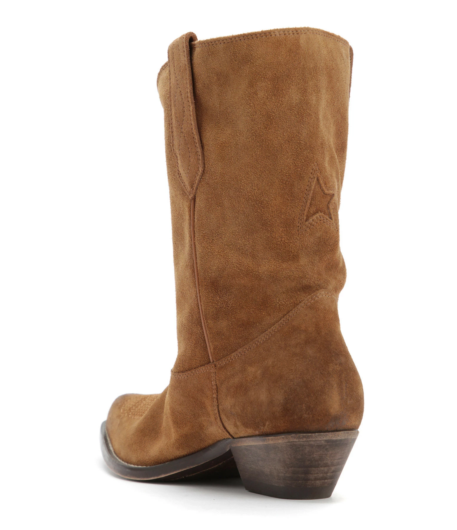 Bottes en daim couleur tabac avec broderies surpiqûres contrastantes. Patte de daim cousue sur la tige façon “cow-boy” et passepoil contrastant. Bout pointu. Intérieur doublé en cuir de vachette.