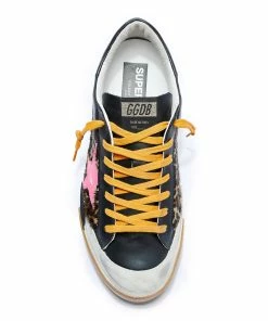 Bottines en cuir vieilli noir à lacets, pour femme. Semelle épaisse. Empiècement étoile à l’arrière.