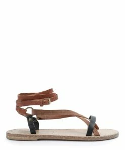 Sandales en cuir marron et noir. Lanières à croiser sur les chevilles. Anneaux en métal. Attaches réglables.