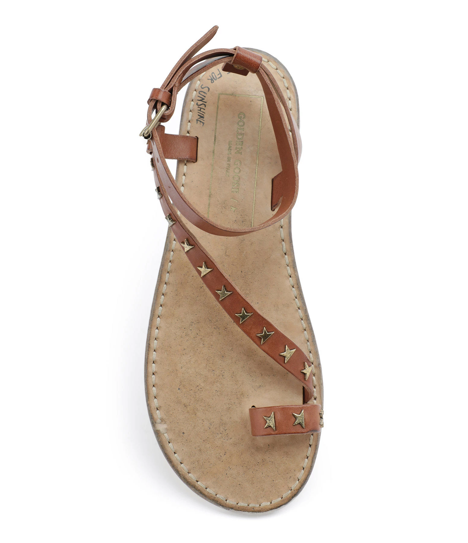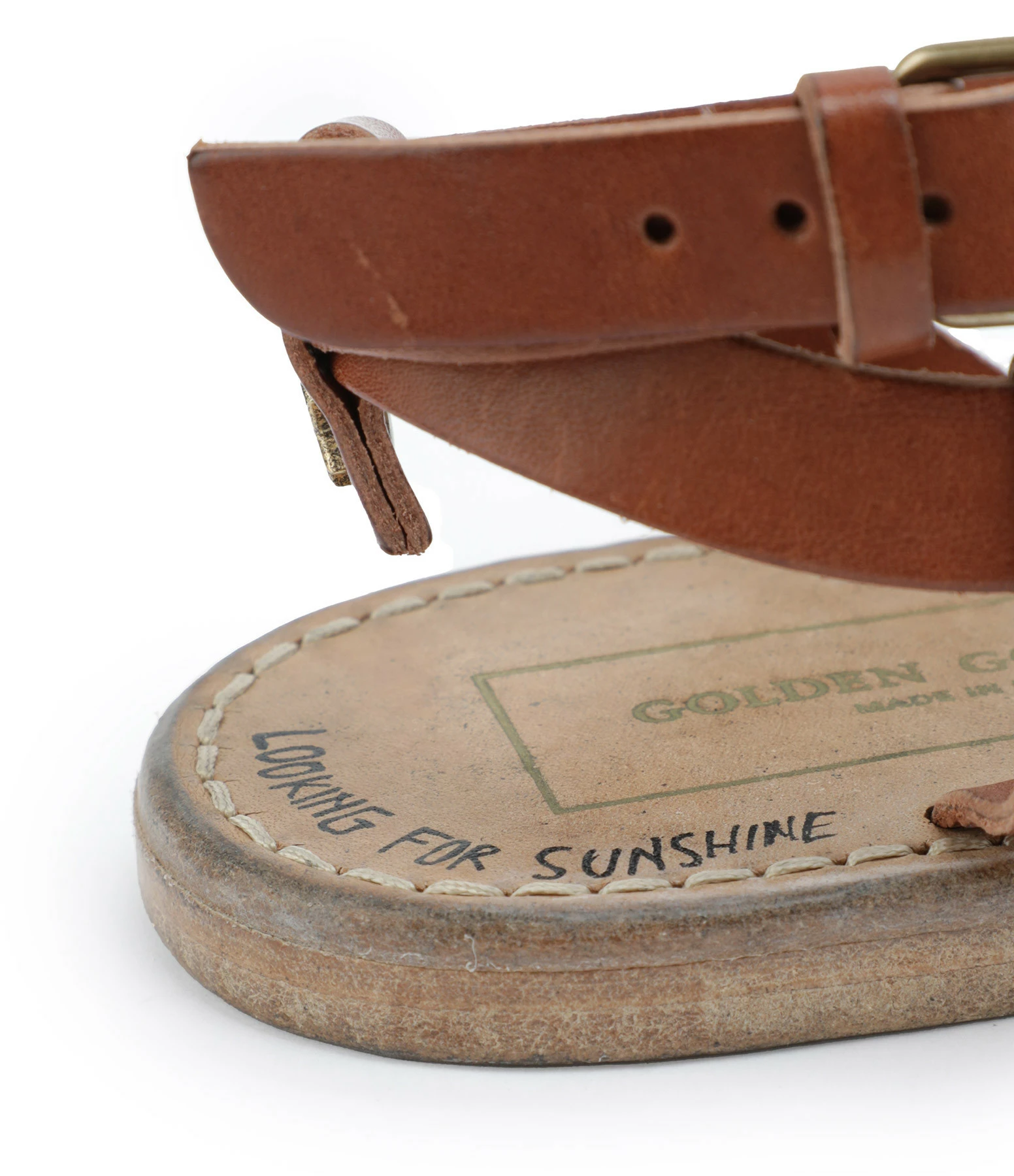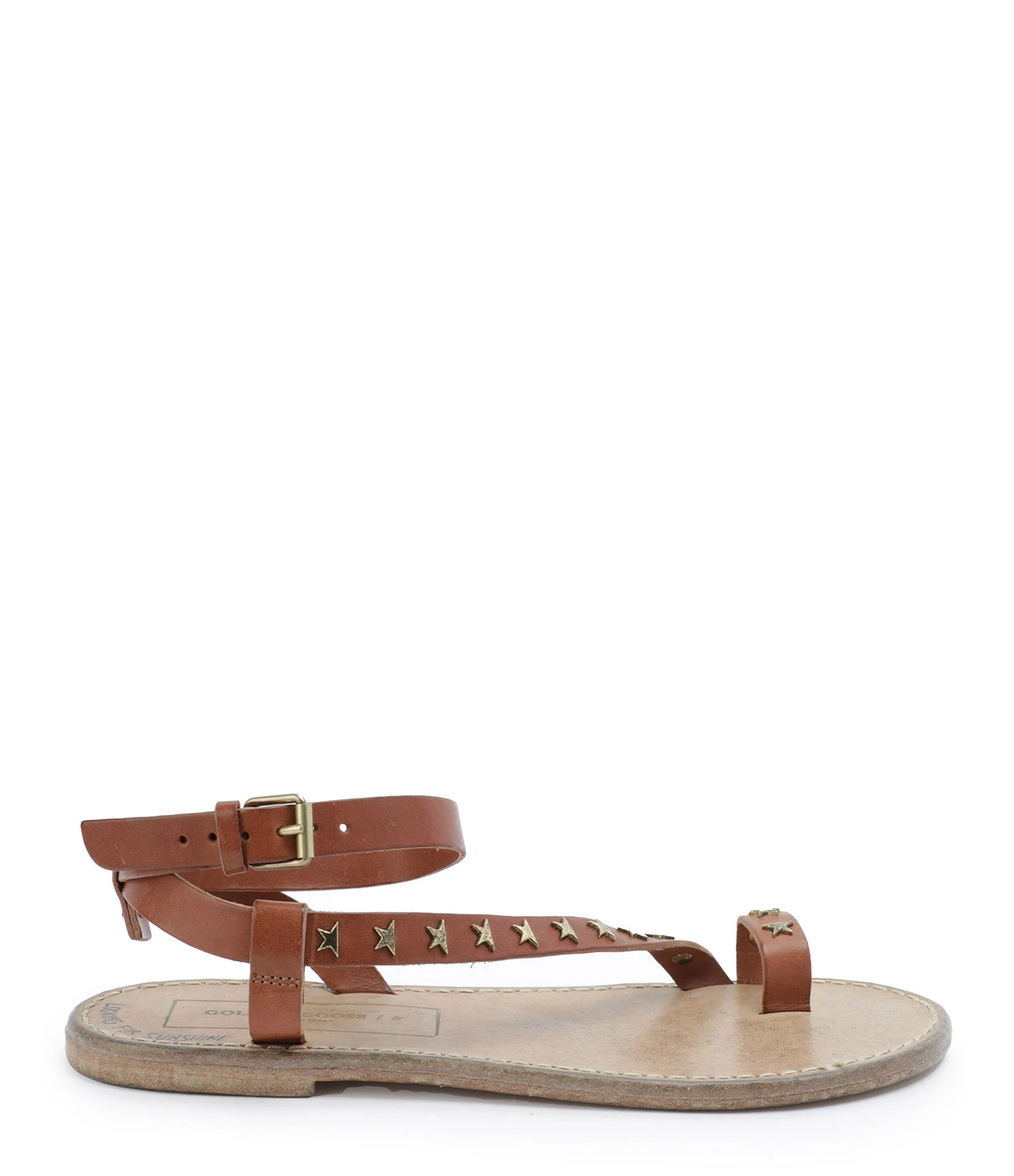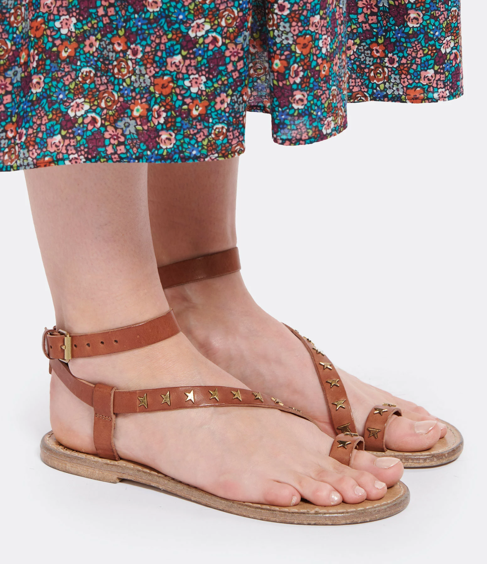 Sandales plates en cuir marron avec clous dorés en forme d’étoiles. Une bride pour le pouce et une bride croisé sur le dessus. Bride réglable à la cheville. Sérigraphie “Looking for sunshine” sur la semelle. Effet usé volontaire.